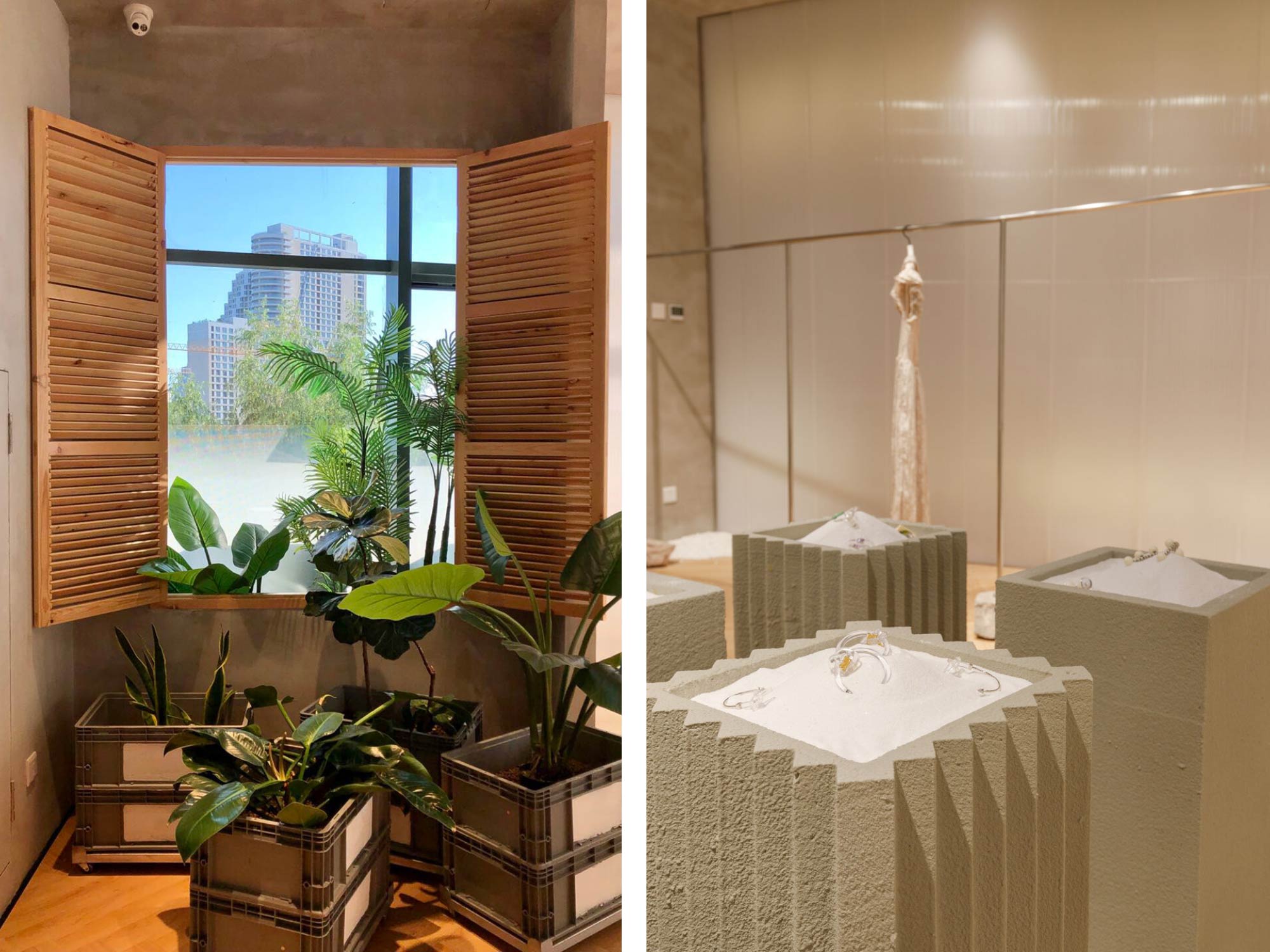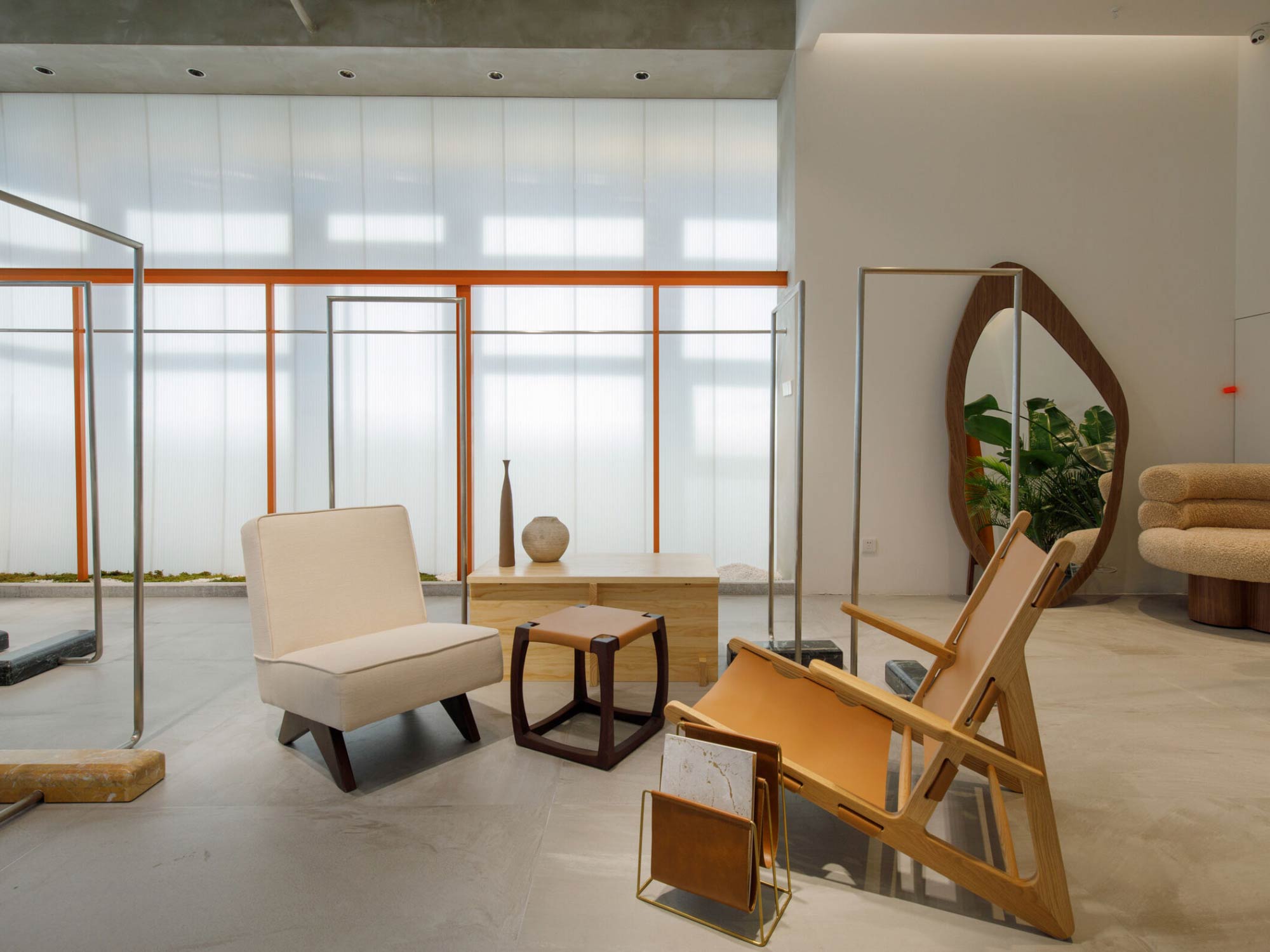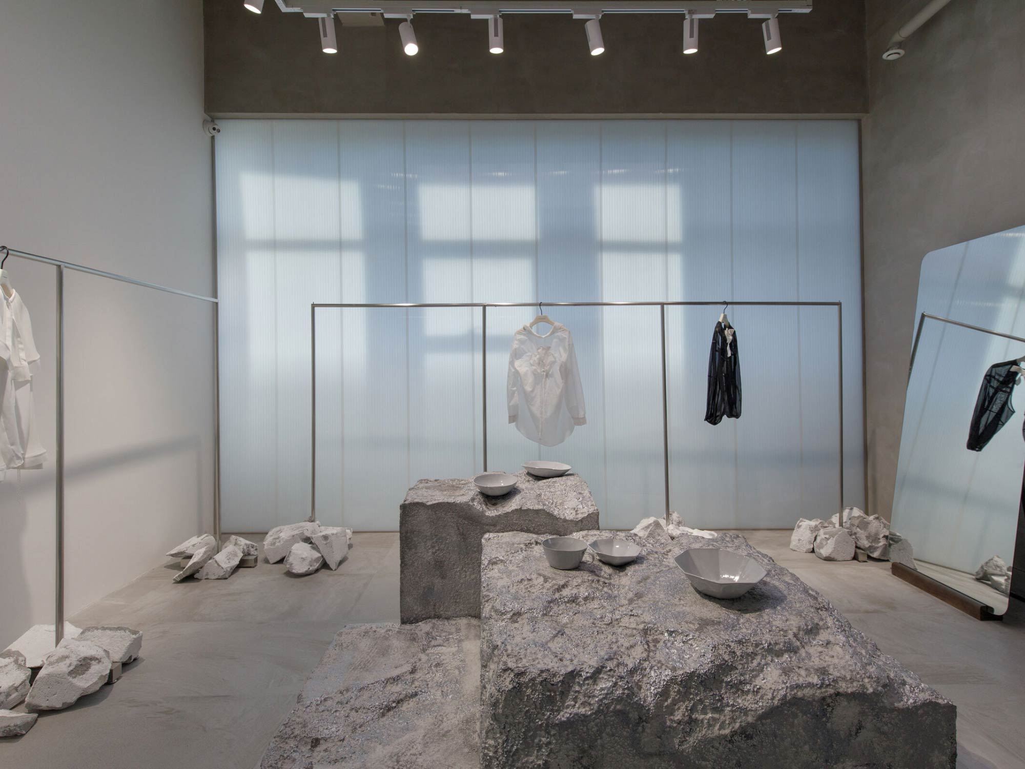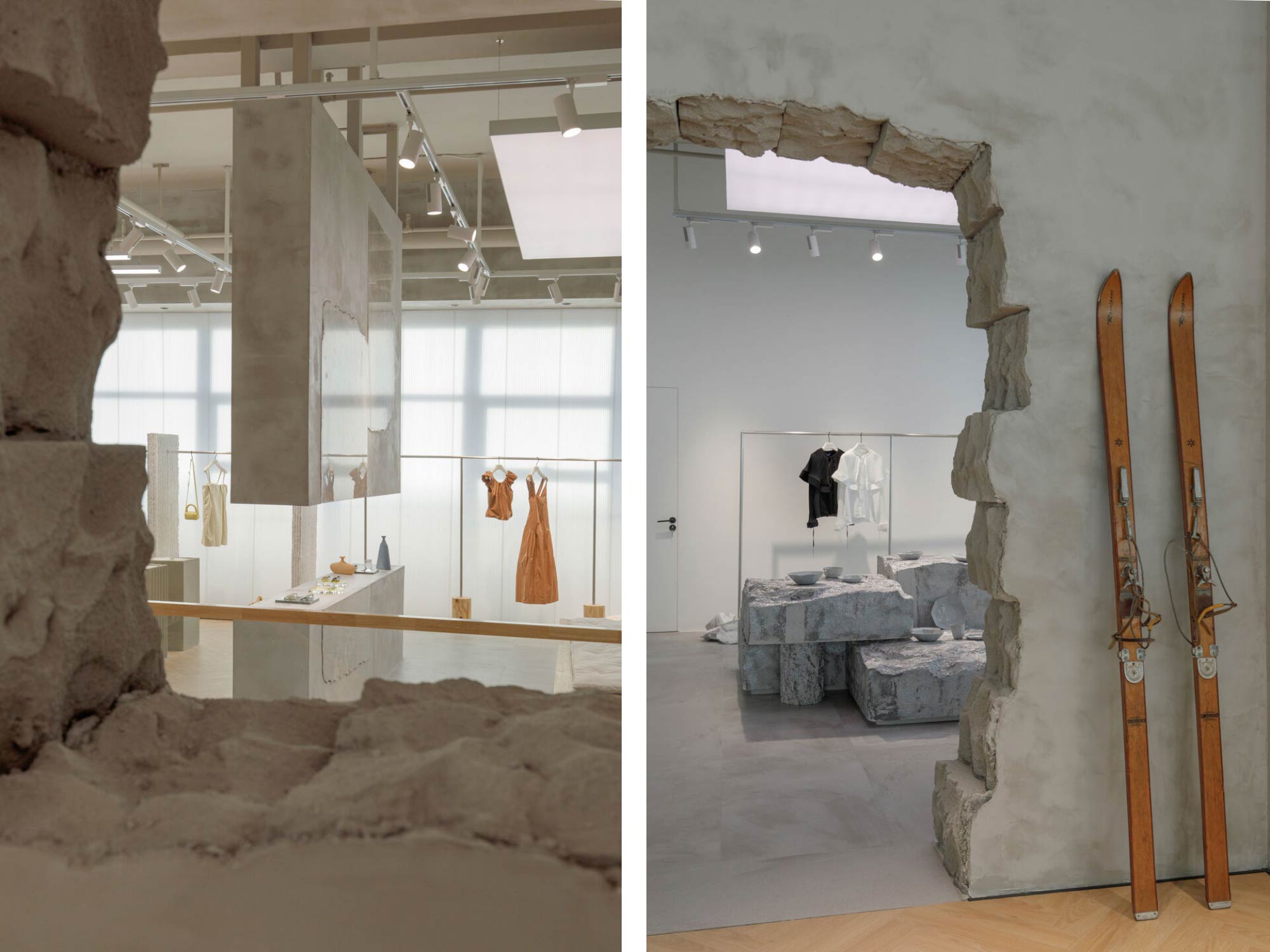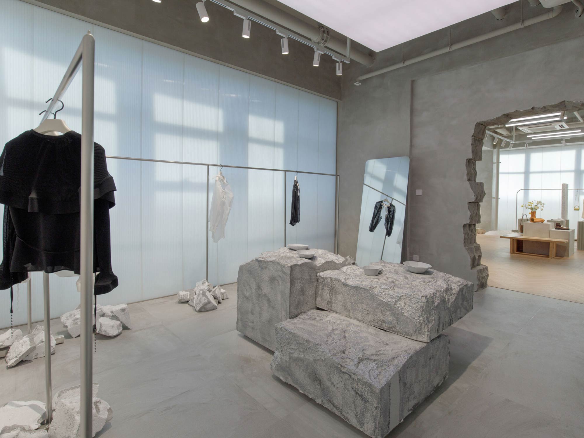 Dự án lựa chọn một bảng vật liệu tiết chế, thiên về các bề mặt thô và tự nhiên như bê tông hiệu ứng, đá travertine và gỗ sáng màu. Sự kết hợp này không nhằm phô diễn tính chất vật liệu mà hướng đến việc tạo ra một nền không gian “lặng”, nơi mọi chi tiết đều được giảm thiểu để nhường chỗ cho sản phẩm thời trang. Chính sự trung tính này giúp tăng độ tương phản thị giác, làm nổi bật hình khối, chất liệu và màu sắc của từng sản phẩm, đồng thời mang lại cảm giác cao cấp thông qua sự tối giản có kiểm soát. Đây là một xu hướng rõ rệt trong thiết kế retail đương đại, nơi vật liệu không còn là yếu tố trang trí mà trở thành công cụ điều tiết trải nghiệm.