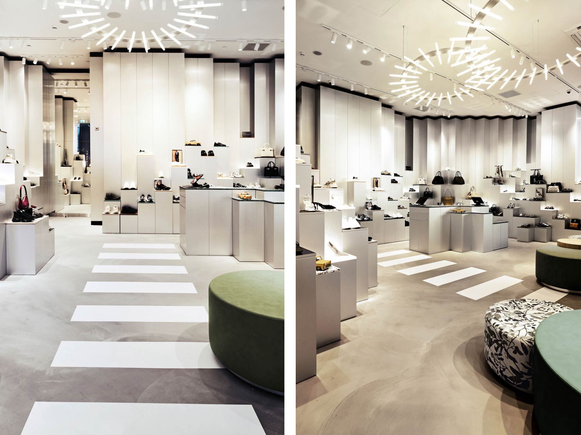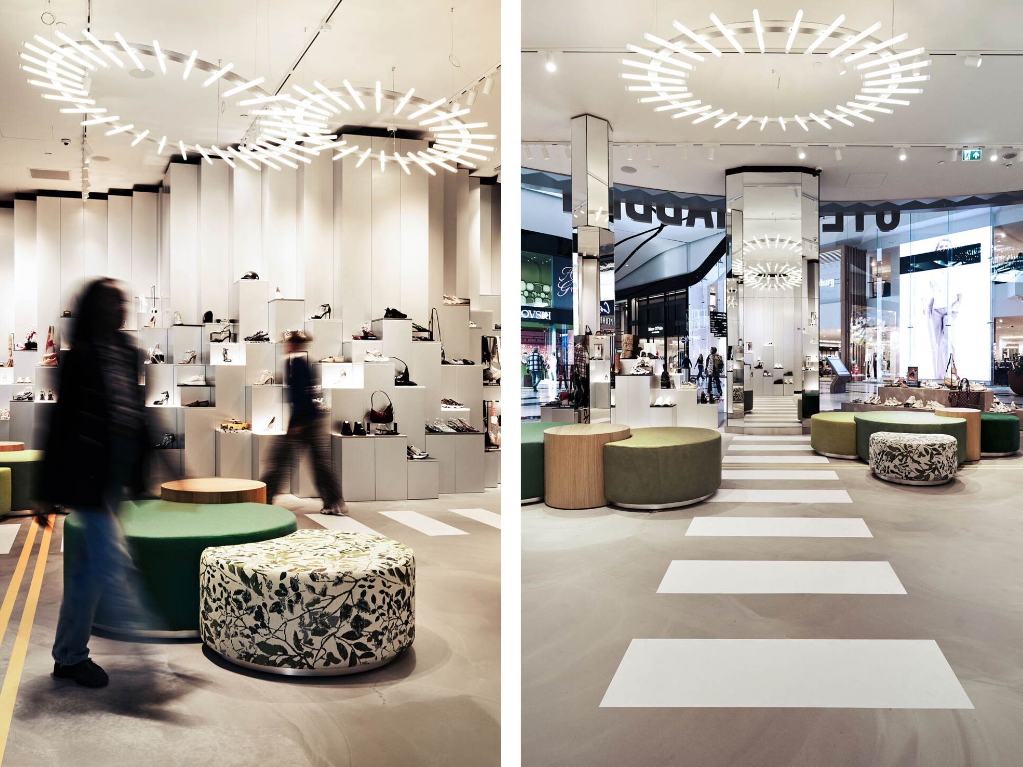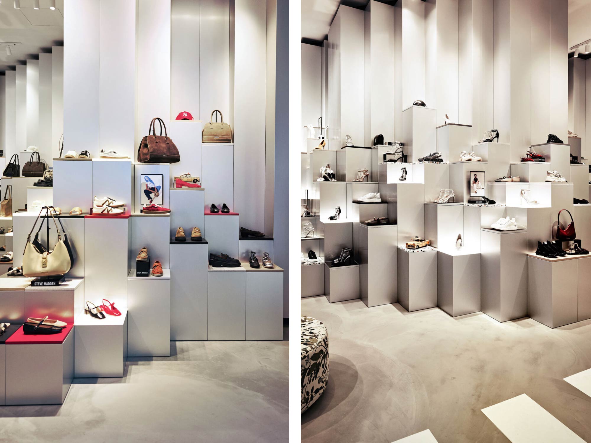 Trong Shop Thời Trang Steve Madden, BLUEWOOD lựa chọn bảng vật liệu mang tính trung tính với các bề mặt hoàn thiện dạng mờ, kim loại và bê tông nhẹ, tạo nên một nền không gian hiện đại và tinh giản. Trên nền đó, các chi tiết điểm nhấn như mặt trưng bày màu sắc hoặc vật liệu có độ tương phản cao được đưa vào một cách có kiểm soát nhằm làm nổi bật sản phẩm. Sự kết hợp giữa tính công nghiệp và yếu tố cảm xúc giúp không gian vừa mang tính đương đại, vừa không trở nên lạnh lẽo hay xa cách.