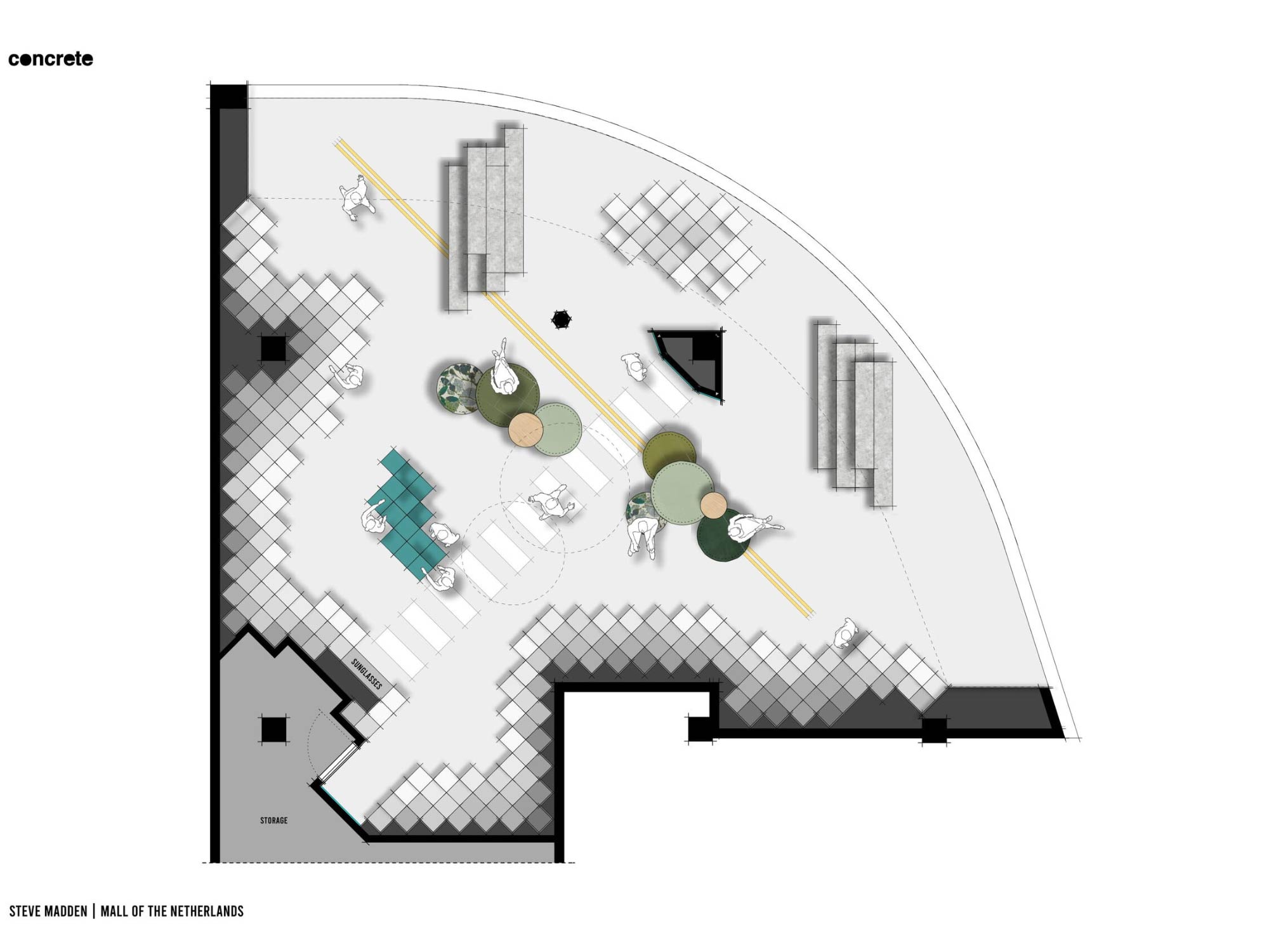 Thiết kế không gian được bổ sung bởi các yếu tố đồ họa mang tính nhận diện cao, được tích hợp trực tiếp vào kiến trúc nội thất. Những đường line trên sàn, mảng màu nhấn hay các chi tiết signage không chỉ đóng vai trò trang trí mà còn góp phần dẫn dắt hành vi di chuyển của khách hàng. Sự kết hợp giữa đồ họa và kiến trúc giúp không gian trở nên sinh động hơn, đồng thời củng cố hình ảnh thương hiệu một cách tinh tế.
