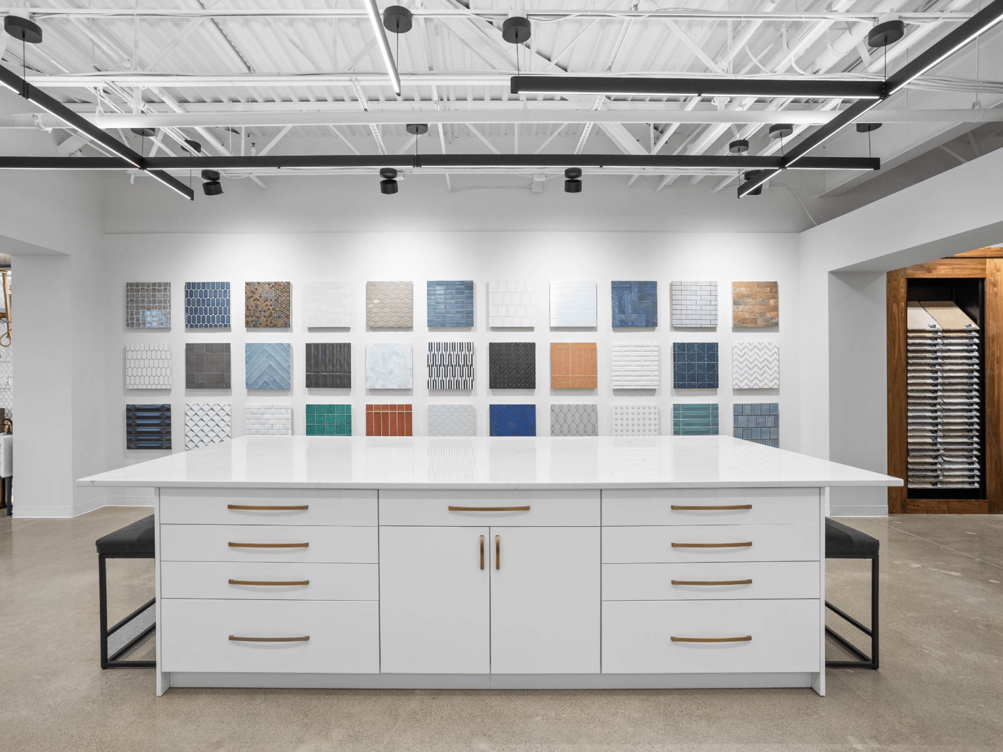 Khu vực đảo trung tâm với mặt bàn lớn được xem là “trái tim” của showroom. Đây không chỉ là nơi trưng bày mà còn là không gian tương tác chính giữa khách hàng và tư vấn viên.