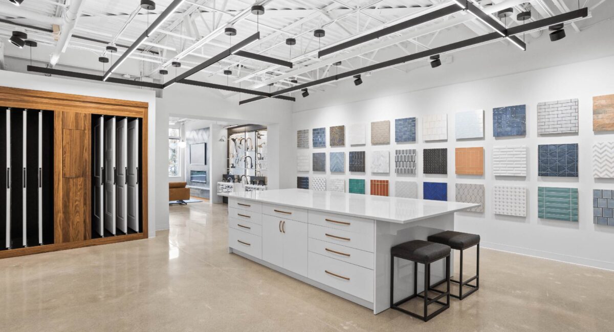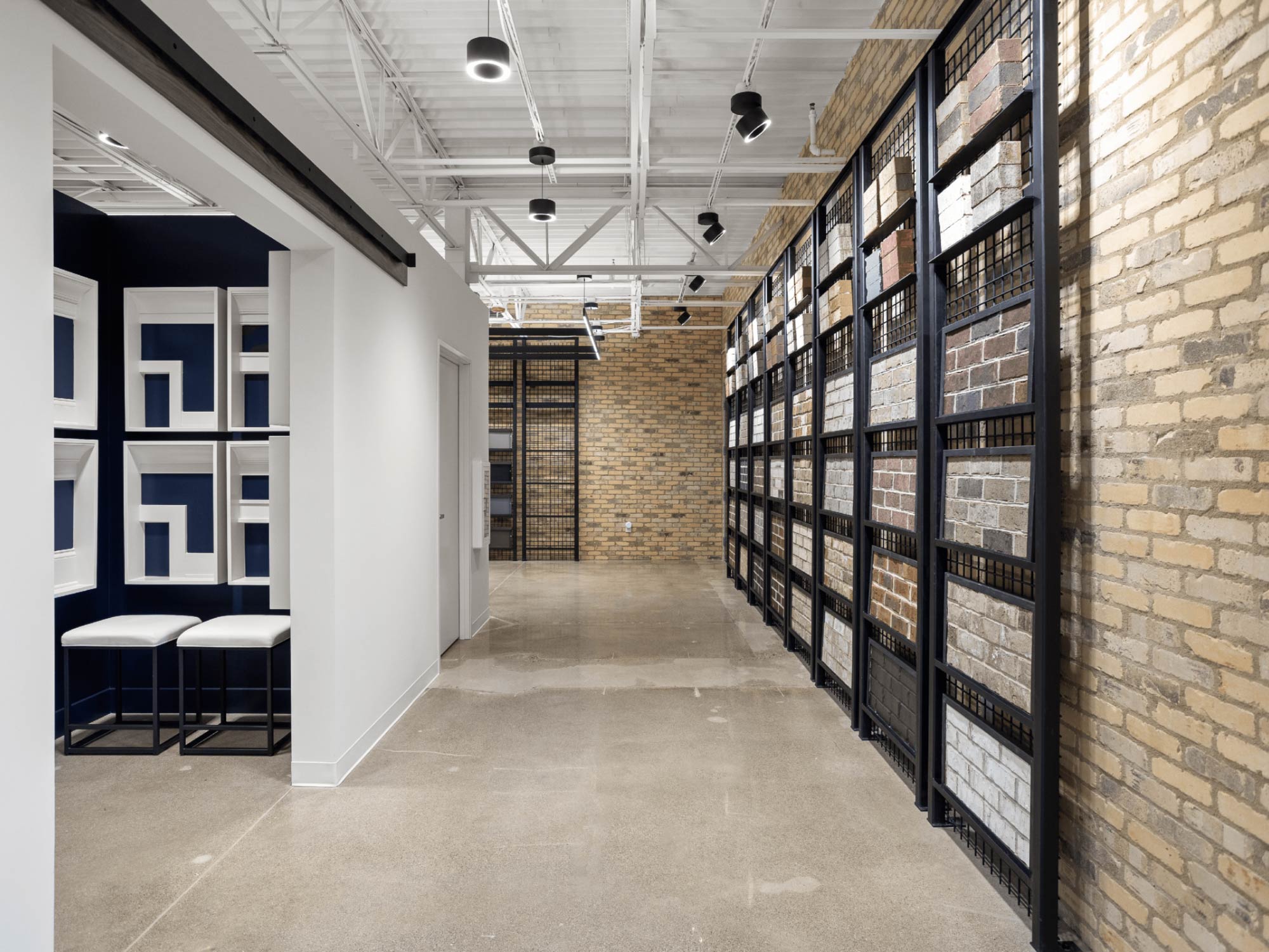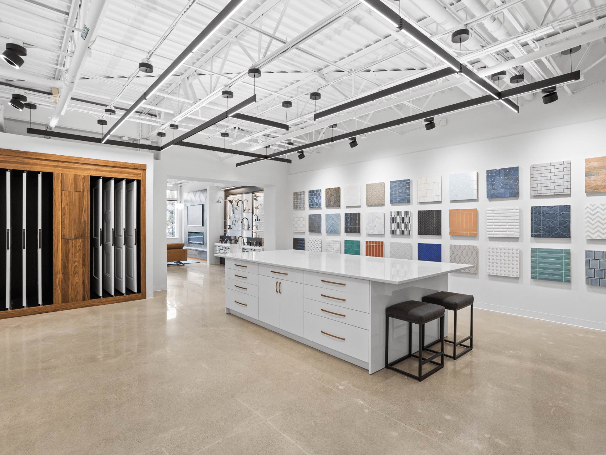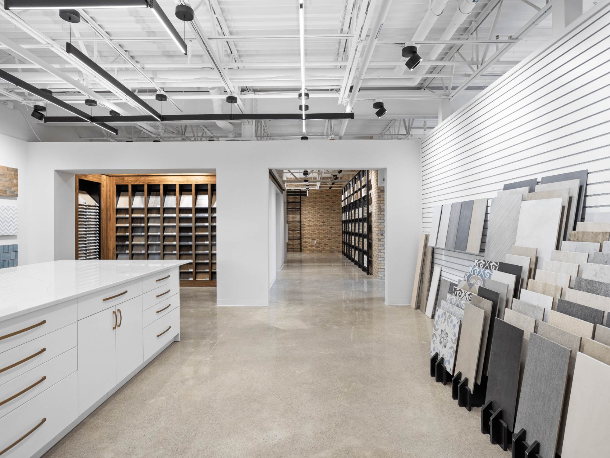 Các khu trưng bày chính được bố trí dọc theo tường, đóng vai trò như “thư viện vật liệu”. Trong khi đó, các đảo trung tâm (island display) được đặt ở vị trí chiến lược để tạo điểm dừng. Tại đây, khách hàng có thể dừng lại lâu hơn, trực tiếp chạm vào vật liệu, so sánh và trao đổi với tư vấn viên.