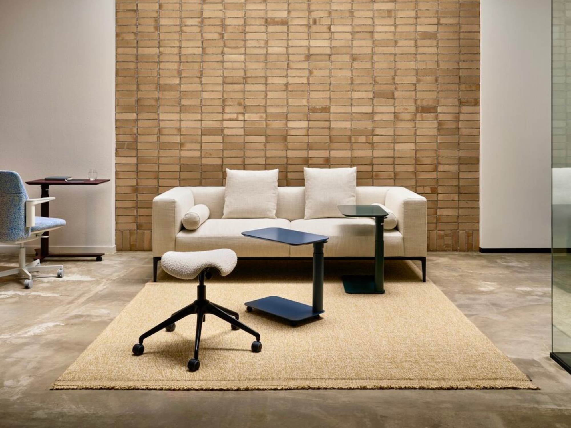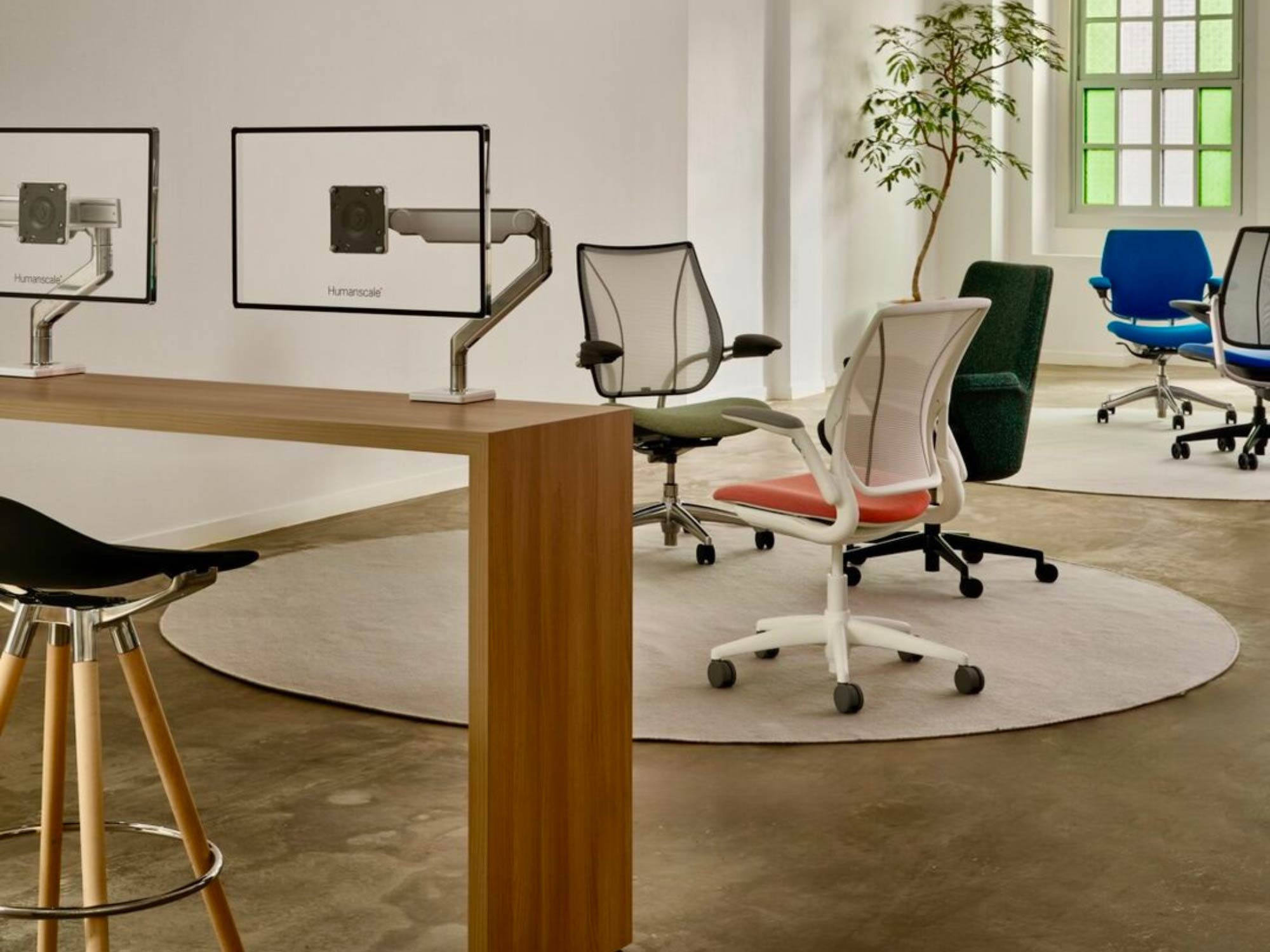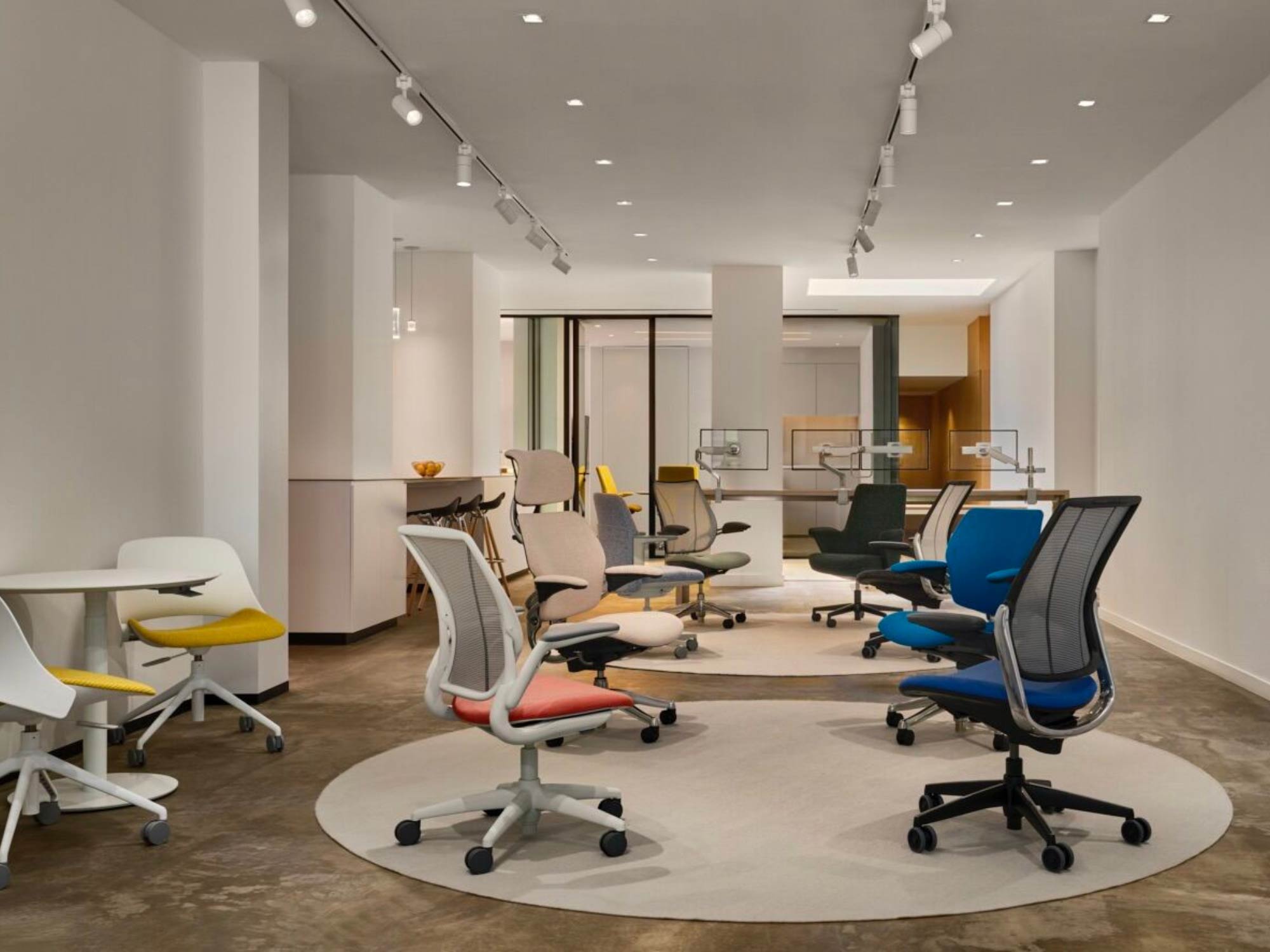 - Hệ sinh thái ghế (The Chair Lab): Không sử dụng kệ bục truyền thống gây chia cắt không gian, các mẫu ghế được đặt trên các tấm thảm tròn lớn màu trung tính. Đây là các “hòn đảo” trải nghiệm, nơi khách hàng có thể dễ dàng xoay, di chuyển và cảm nhận sự phản hồi của cơ chế trọng lực (weight-sensitive recline) – đặc sản công nghệ của Humanscale – trong một không gian mở hoàn toàn.
