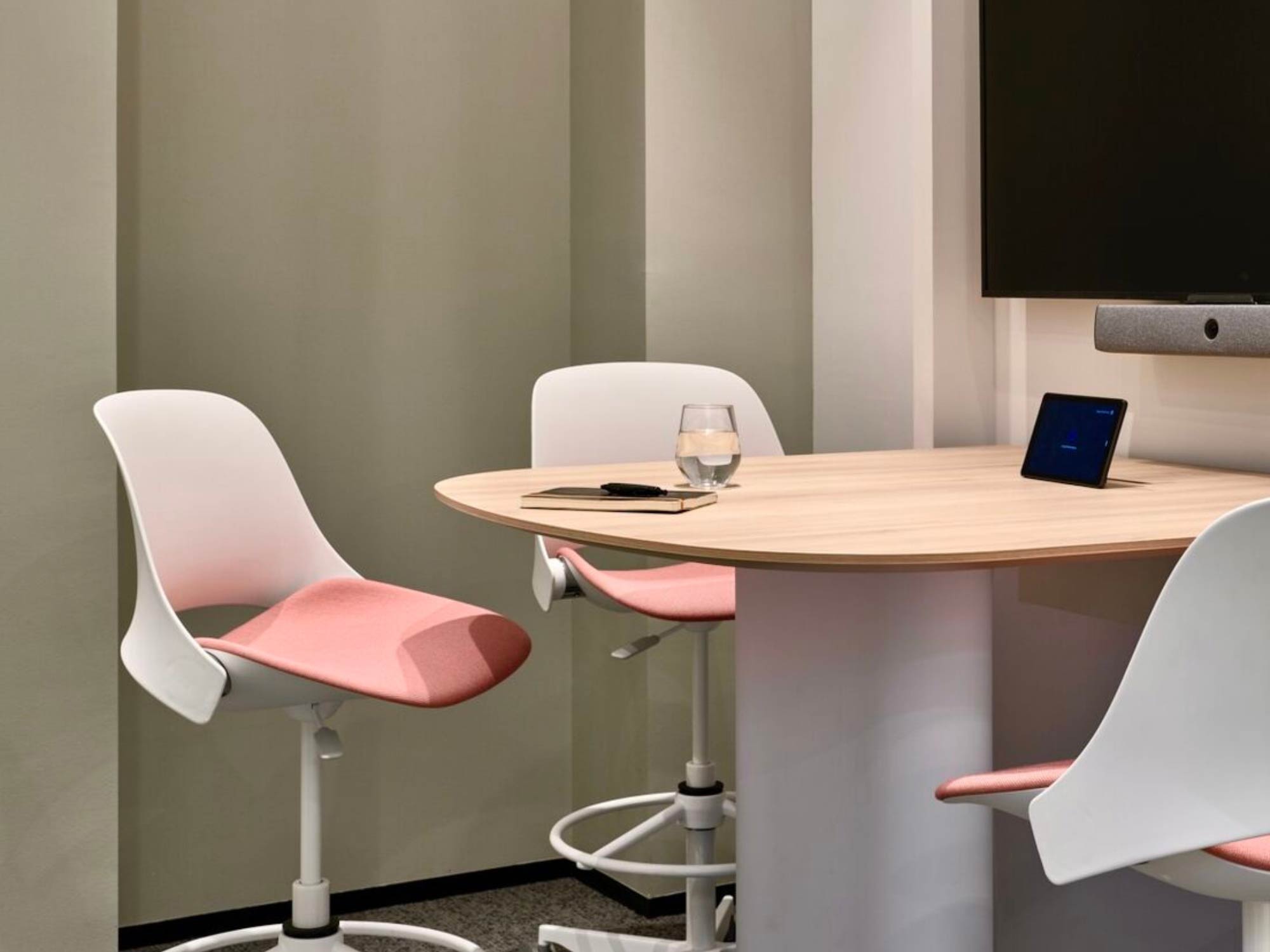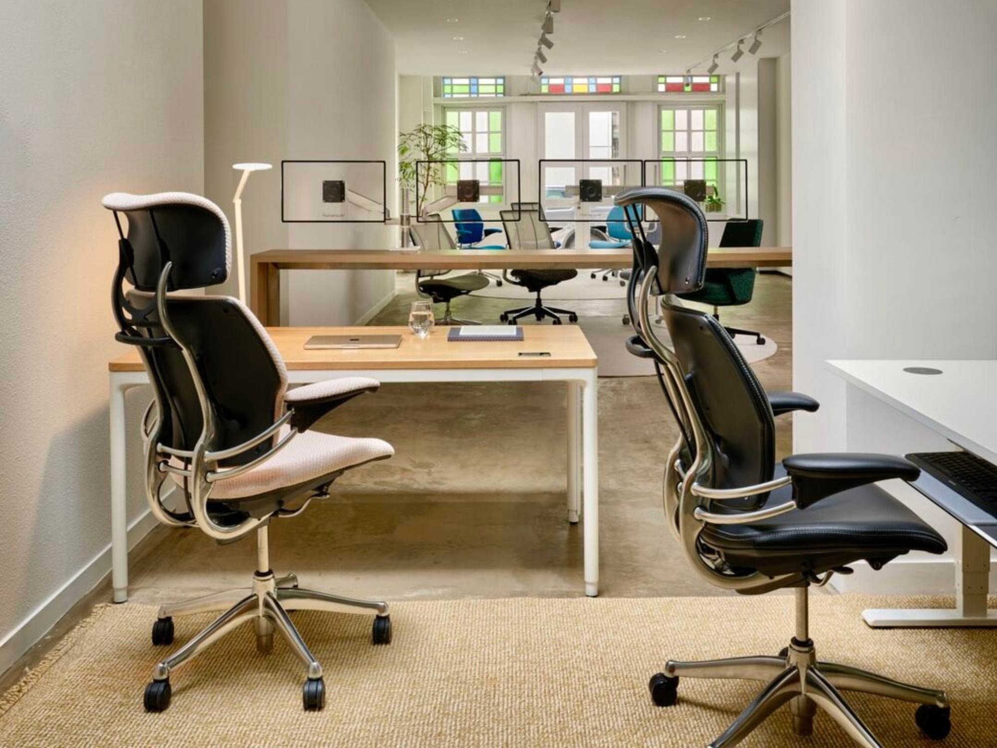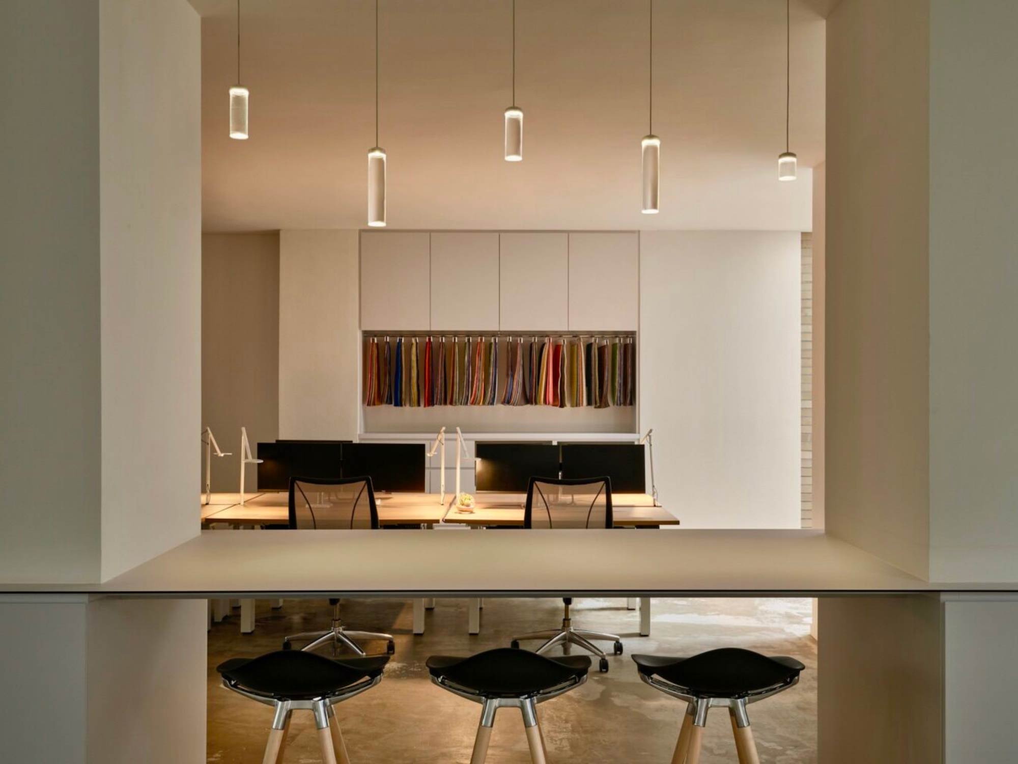- Hệ sinh thái ghế (The Chair Lab): Không sử dụng kệ bục truyền thống gây chia cắt không gian, các mẫu ghế được đặt trên các tấm thảm tròn lớn màu trung tính. Đây là các “hòn đảo” trải nghiệm, nơi khách hàng có thể dễ dàng xoay, di chuyển và cảm nhận sự phản hồi của cơ chế trọng lực (weight-sensitive recline) – đặc sản công nghệ của Humanscale – trong một không gian mở hoàn toàn.