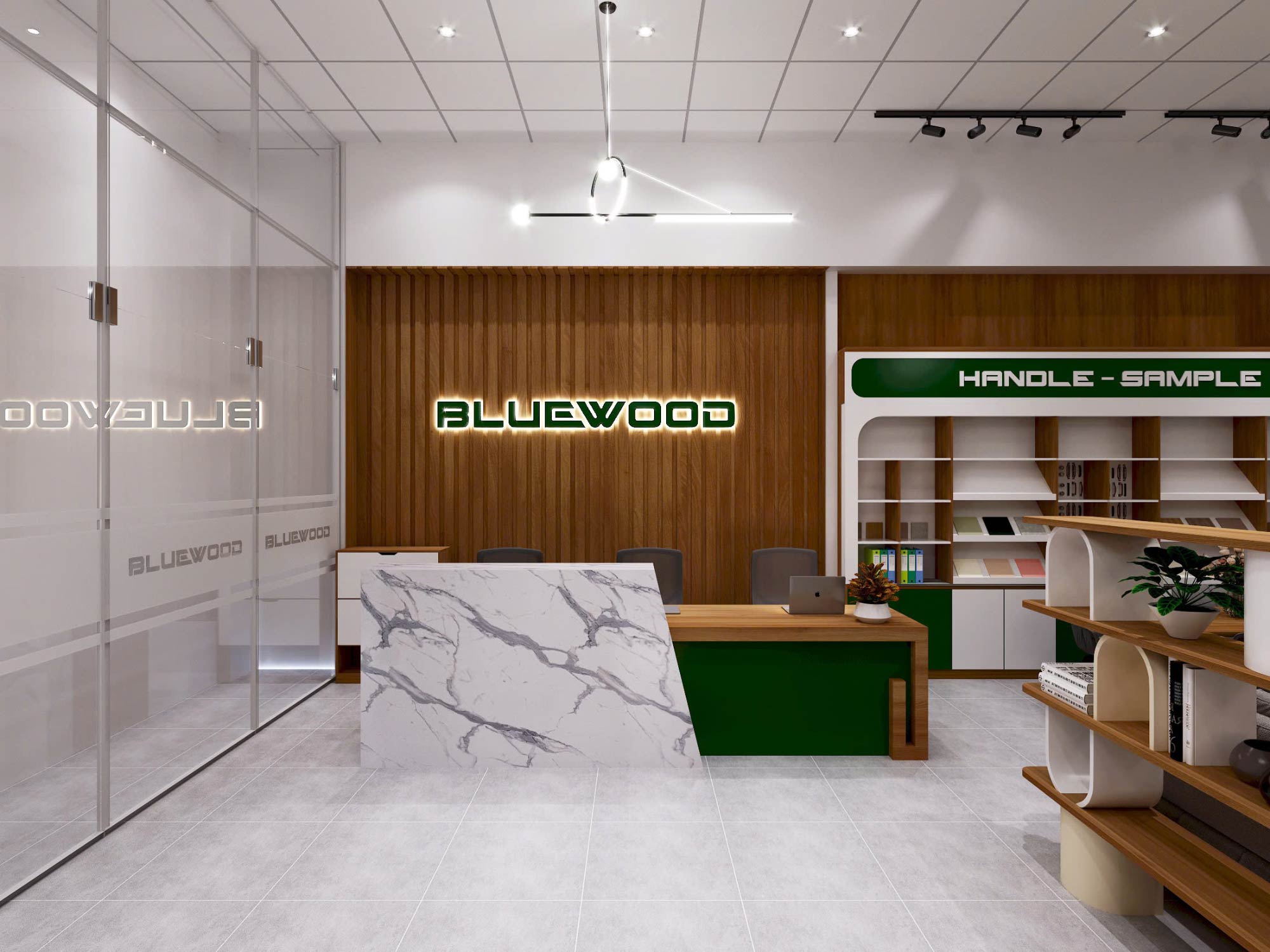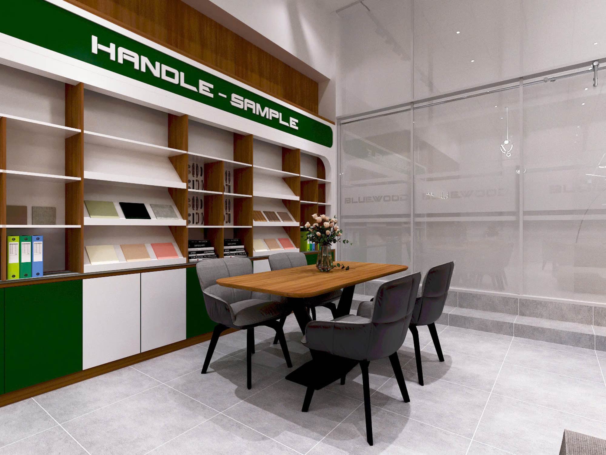 - Khu vật liệu (Handle – Sample): nơi khách hàng trực tiếp chạm, so sánh và lựa chọn vật liệu