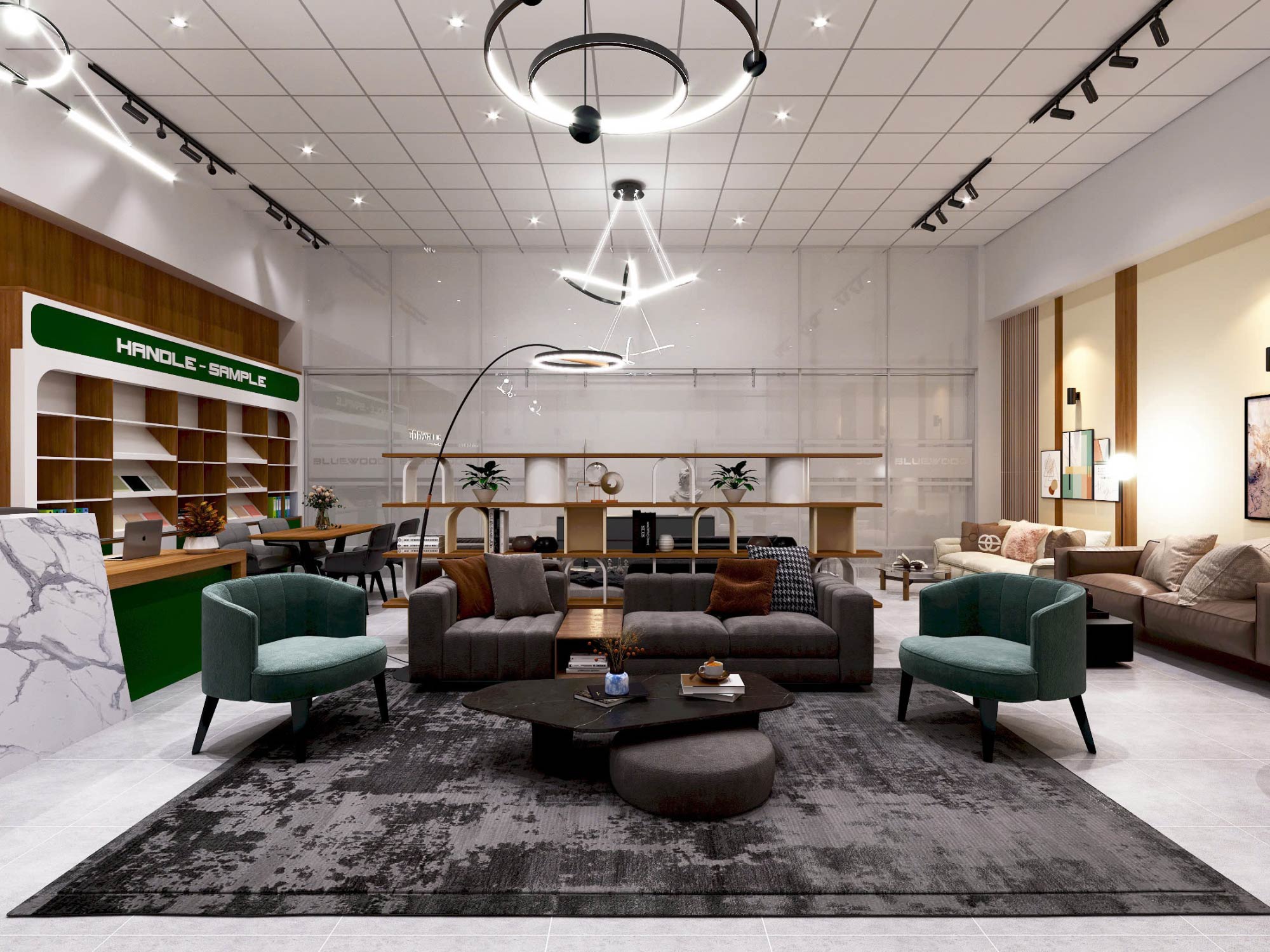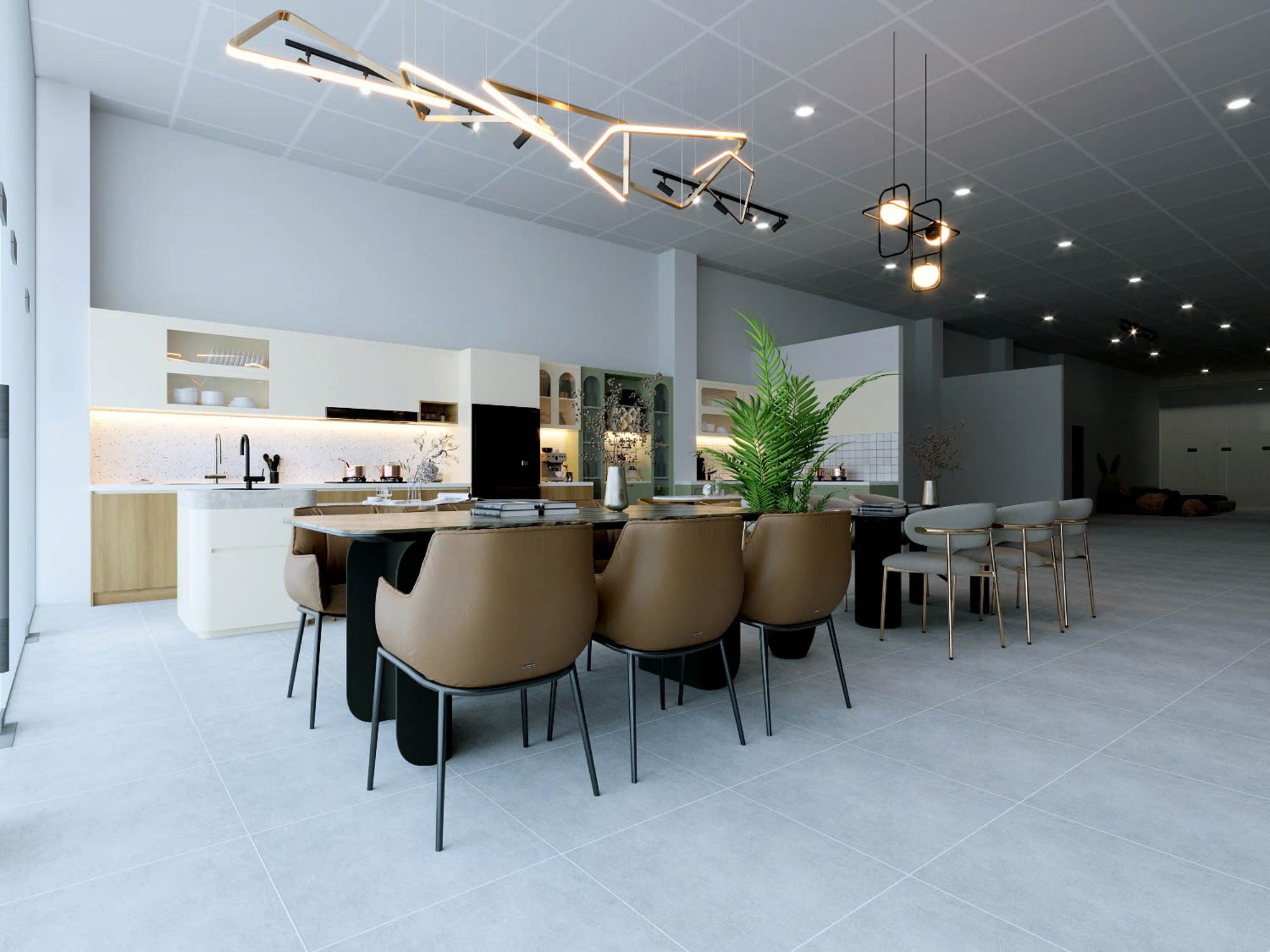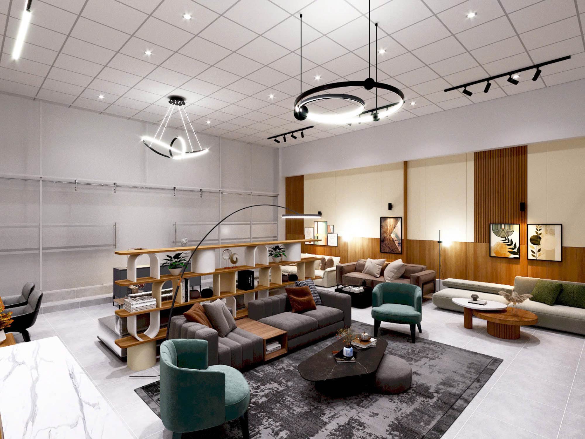 Ngay từ góc nhìn tổng thể, showroom được tổ chức theo phong cách hiện đại (modern contemporary), kết hợp giữa mảng khối tối giản và chi tiết vật liệu ấm áp. Trần thả module kết hợp hệ đèn tracklight và đèn trang trí hình học tạo nên một hệ ánh sáng đa lớp – vừa phục vụ chiếu sáng chức năng, vừa đóng vai trò tạo điểm nhấn thị giác.
