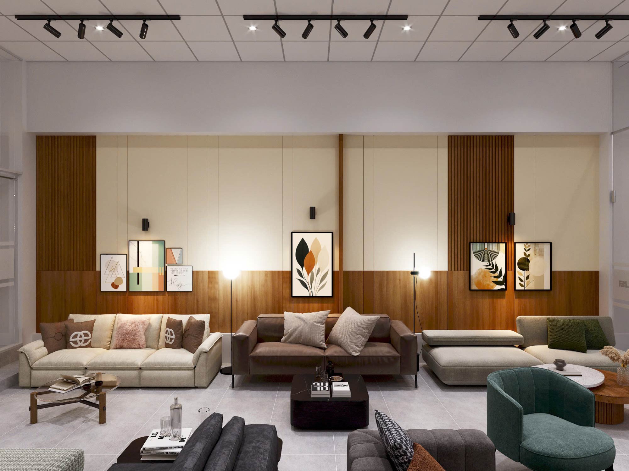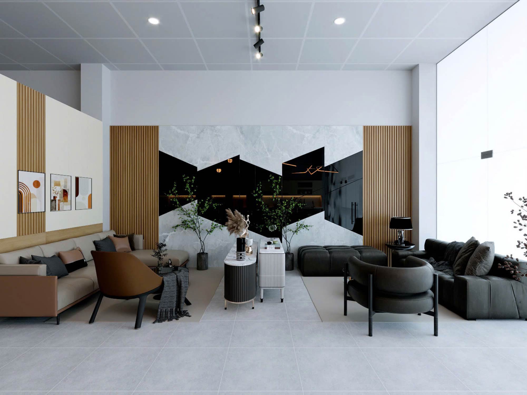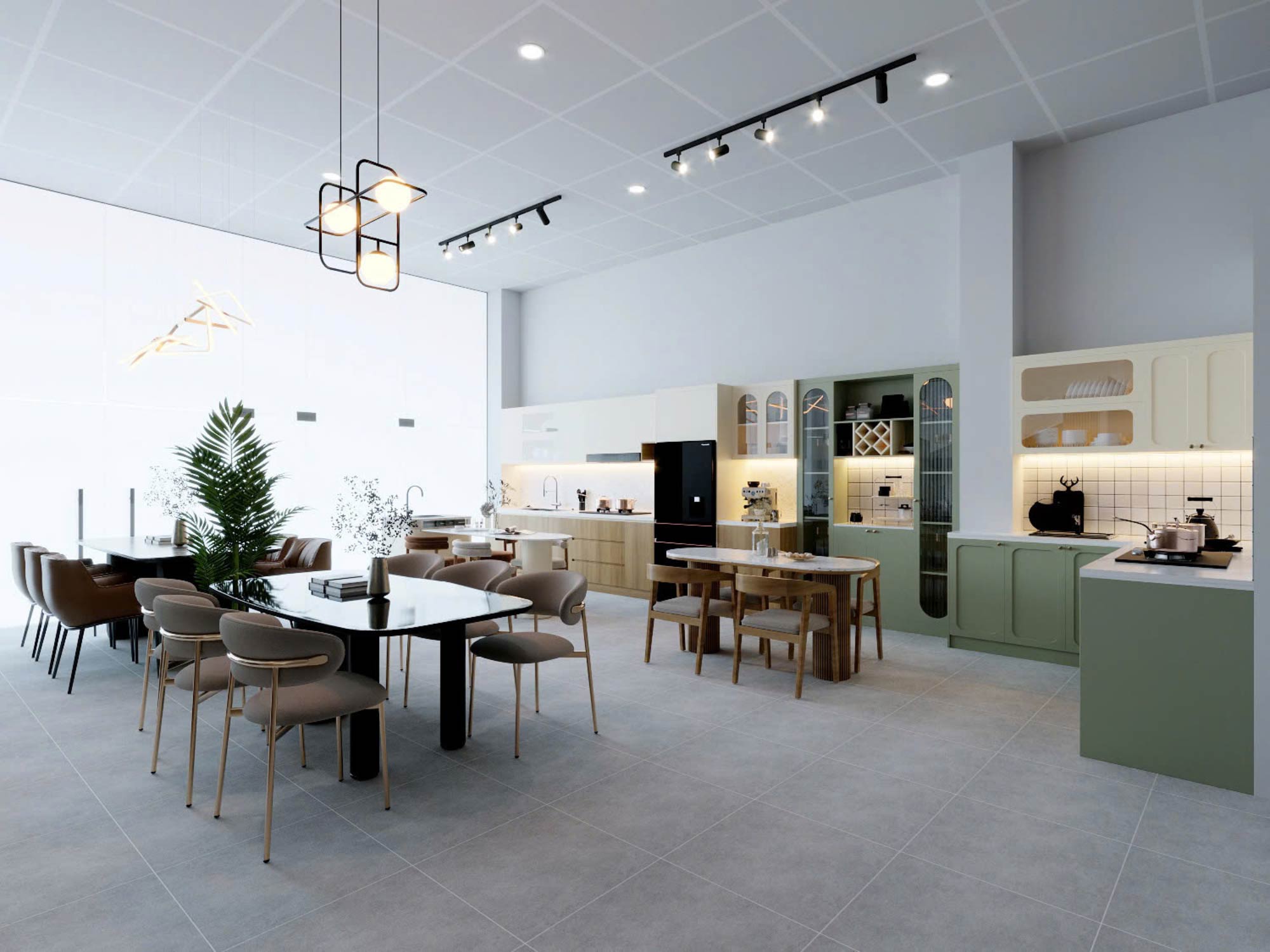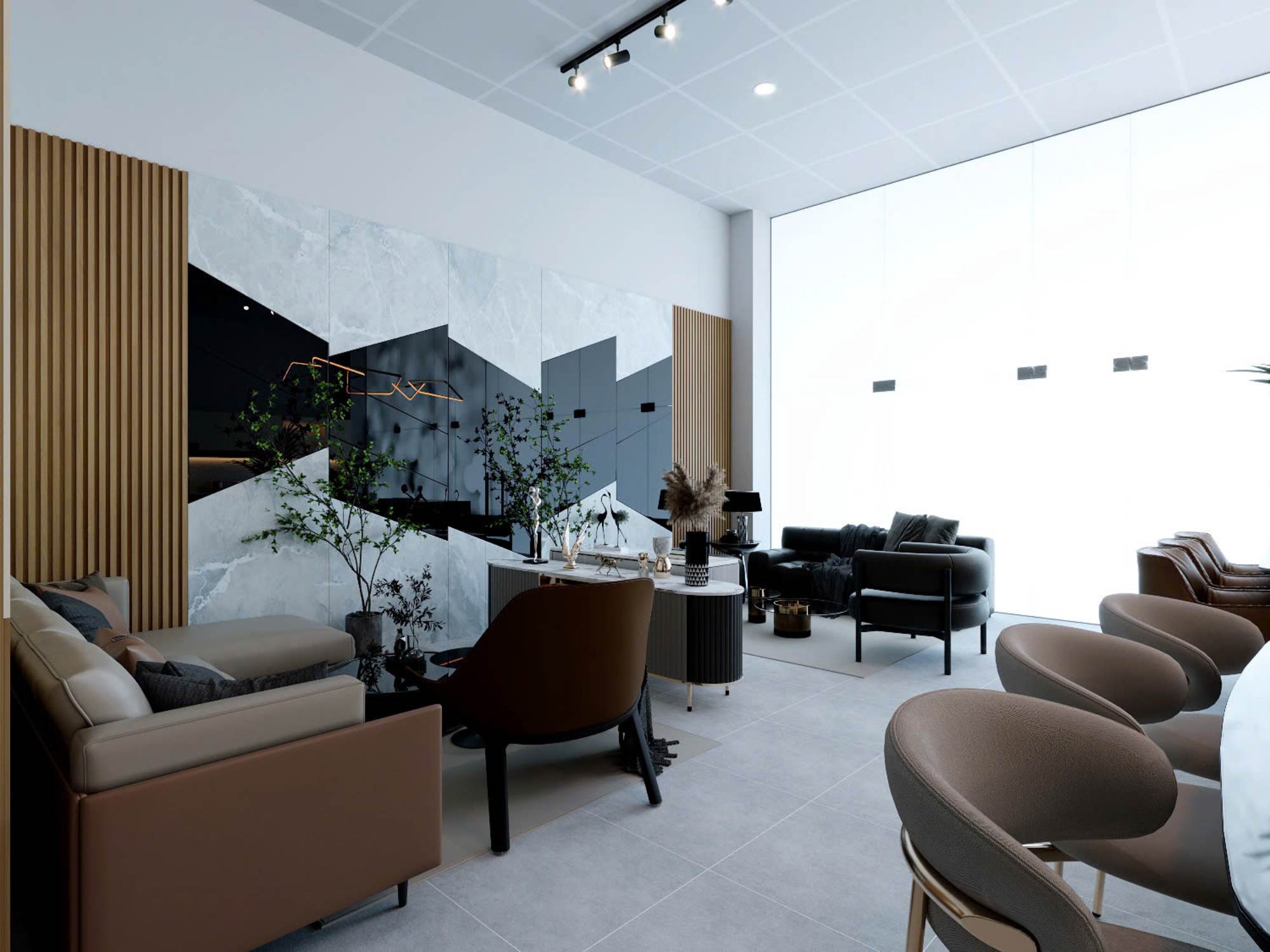 Ngay từ góc nhìn tổng thể, showroom được tổ chức theo phong cách hiện đại (modern contemporary), kết hợp giữa mảng khối tối giản và chi tiết vật liệu ấm áp. Trần thả module kết hợp hệ đèn tracklight và đèn trang trí hình học tạo nên một hệ ánh sáng đa lớp – vừa phục vụ chiếu sáng chức năng, vừa đóng vai trò tạo điểm nhấn thị giác.