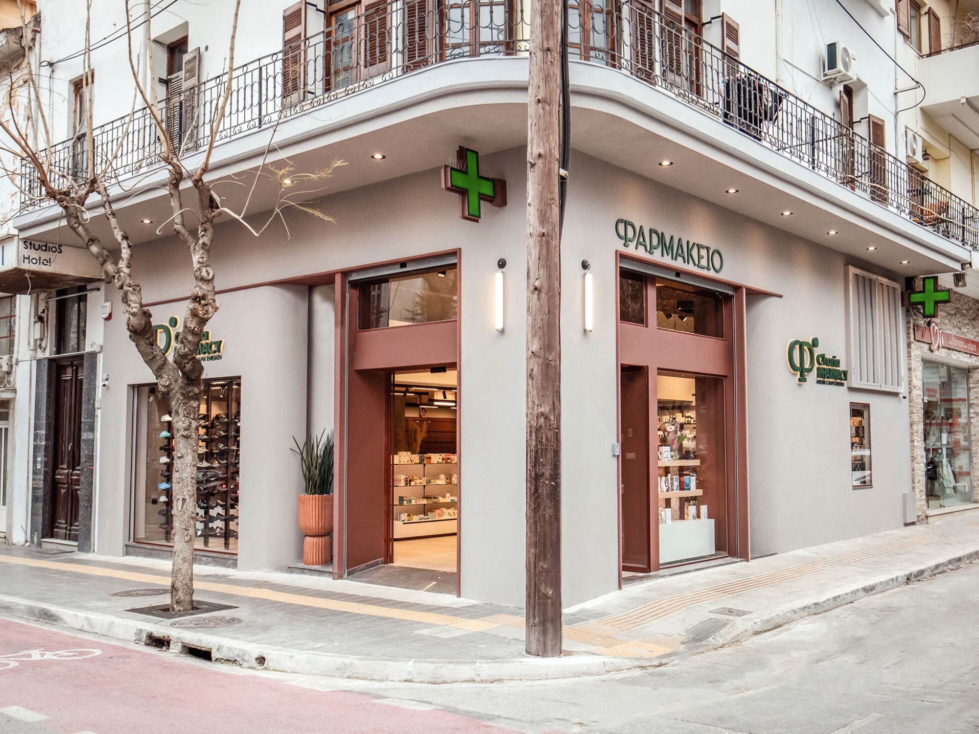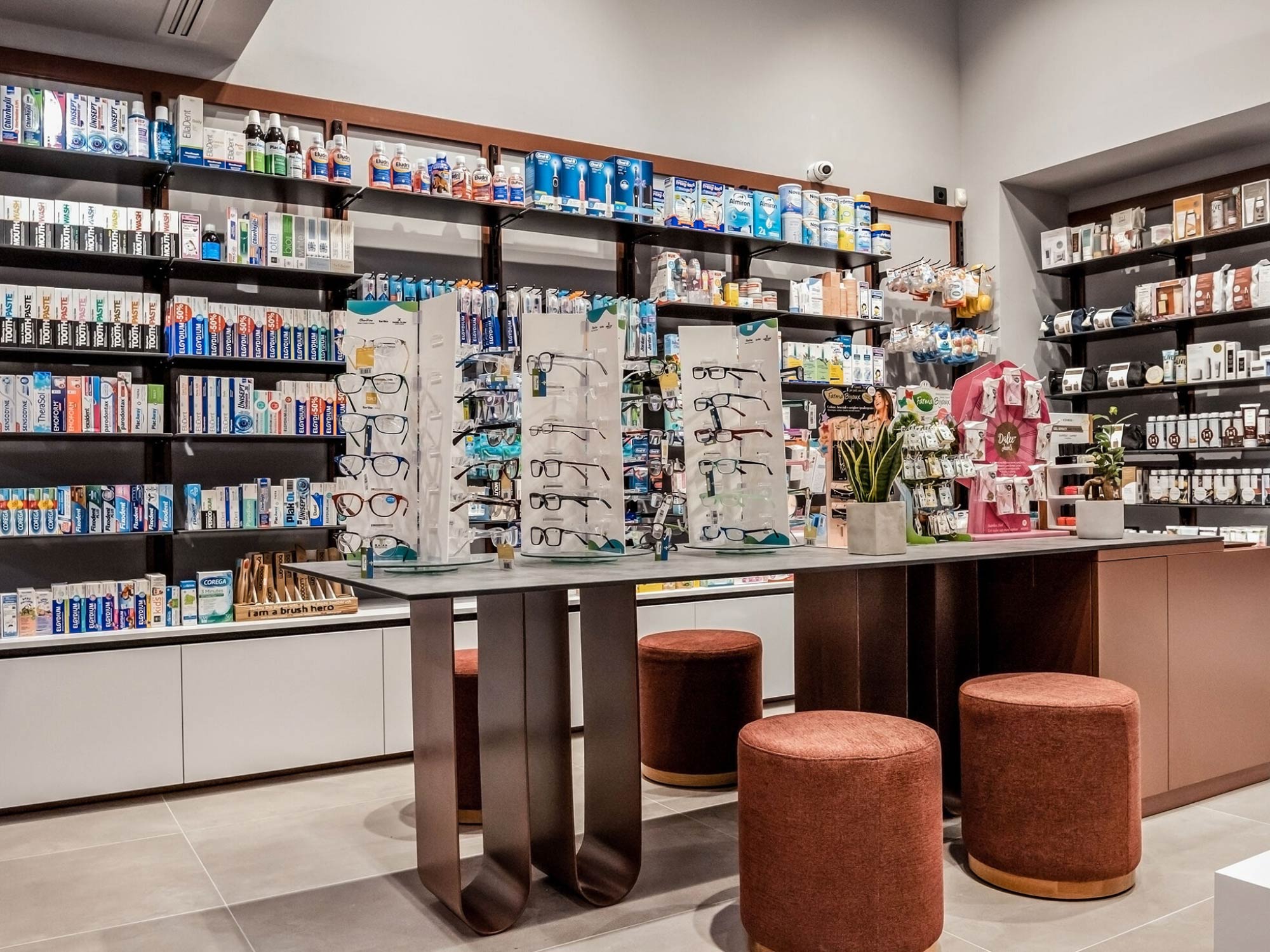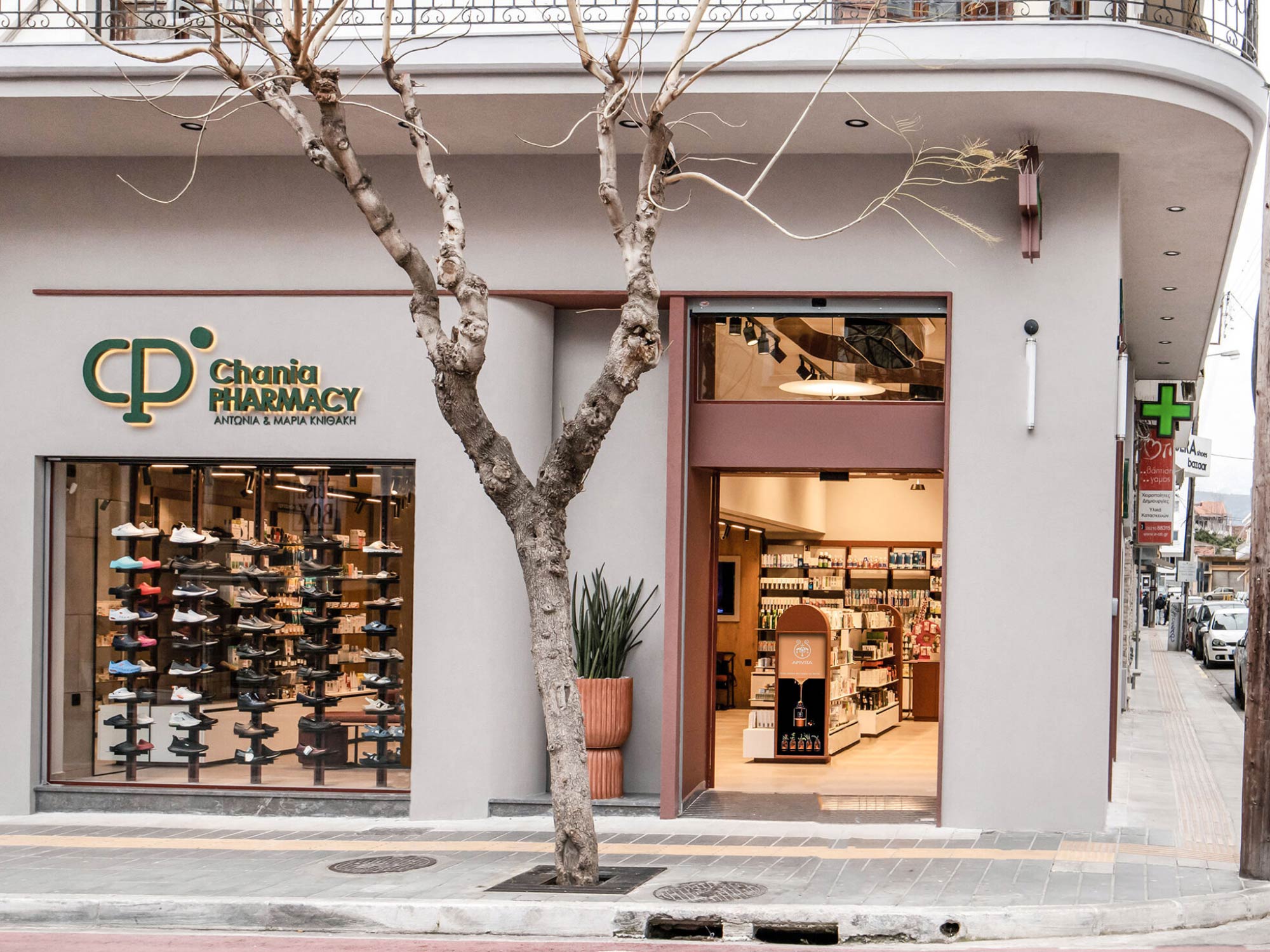 Tại dự án thiết kế nội thất nhà thuốc Chania, BLUEWOOD tổ chức không gian theo dạng mở, với các dãy kệ trung tâm kết hợp hệ tủ trưng bày sát tường. Lối đi được tính toán rộng rãi, tạo sự thoải mái khi di chuyển và tránh cảm giác chật chội thường thấy ở các nhà thuốc truyền thống.