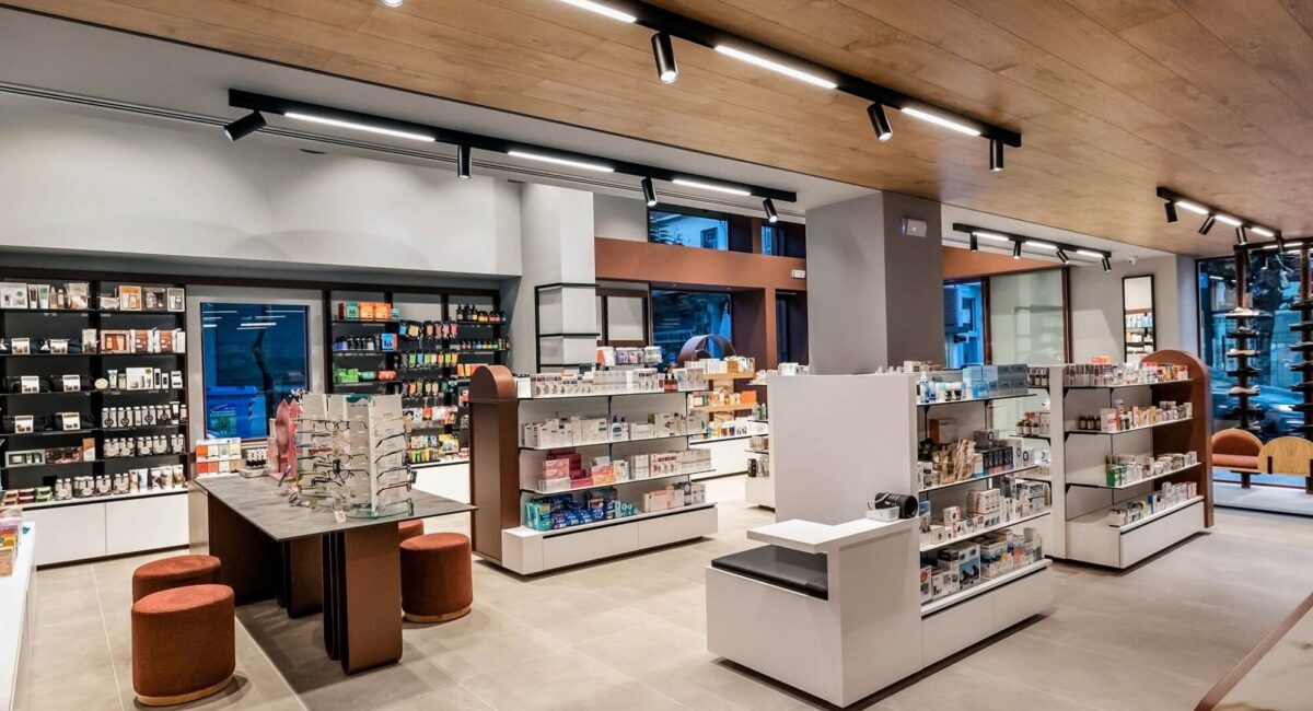 Sự kết hợp giữa ánh sáng và vật liệu giúp nhà thuốc trở nên nổi bật nhưng không chói gắt – chuyên nghiệp nhưng vẫn thân thiện.
