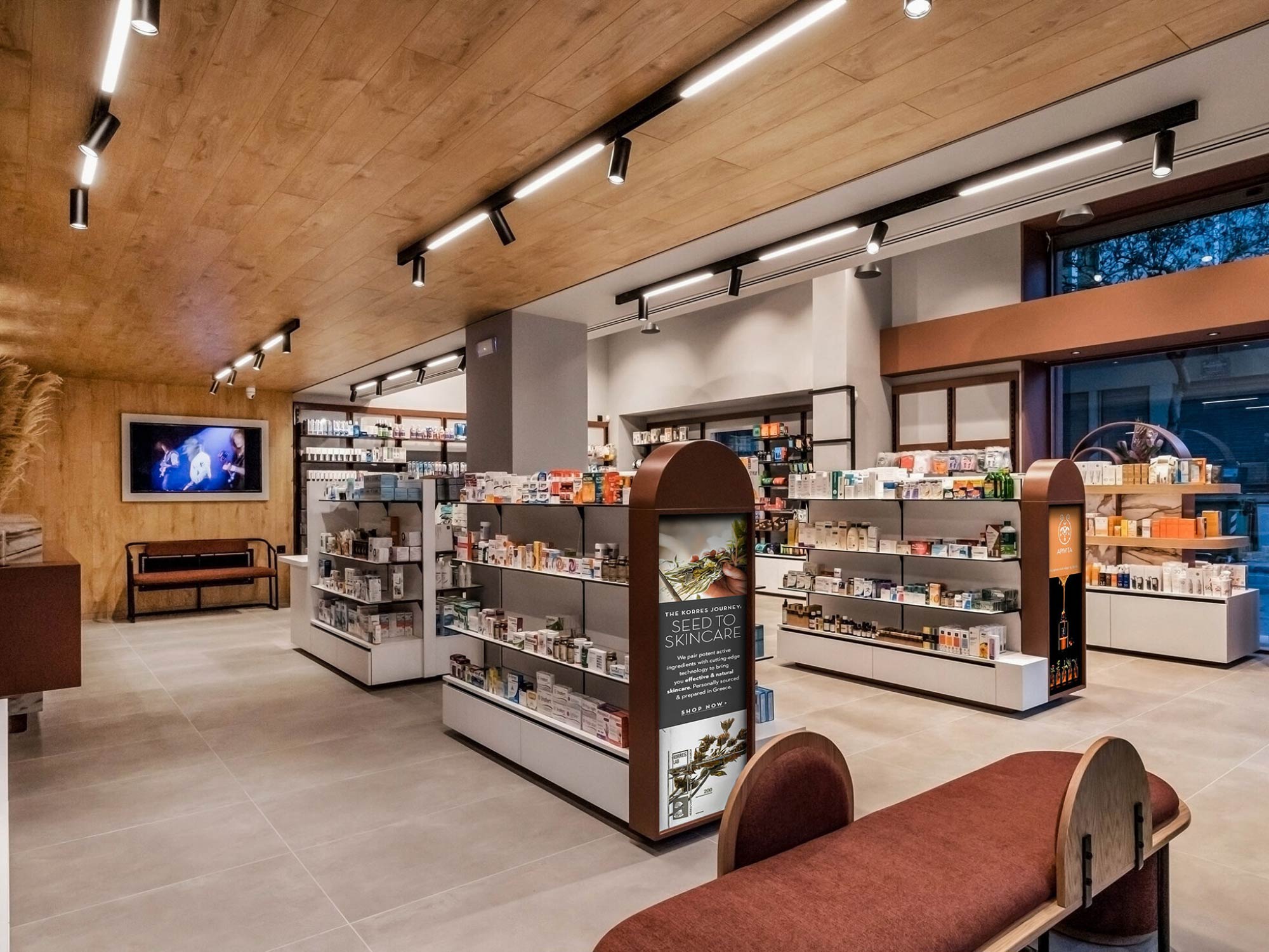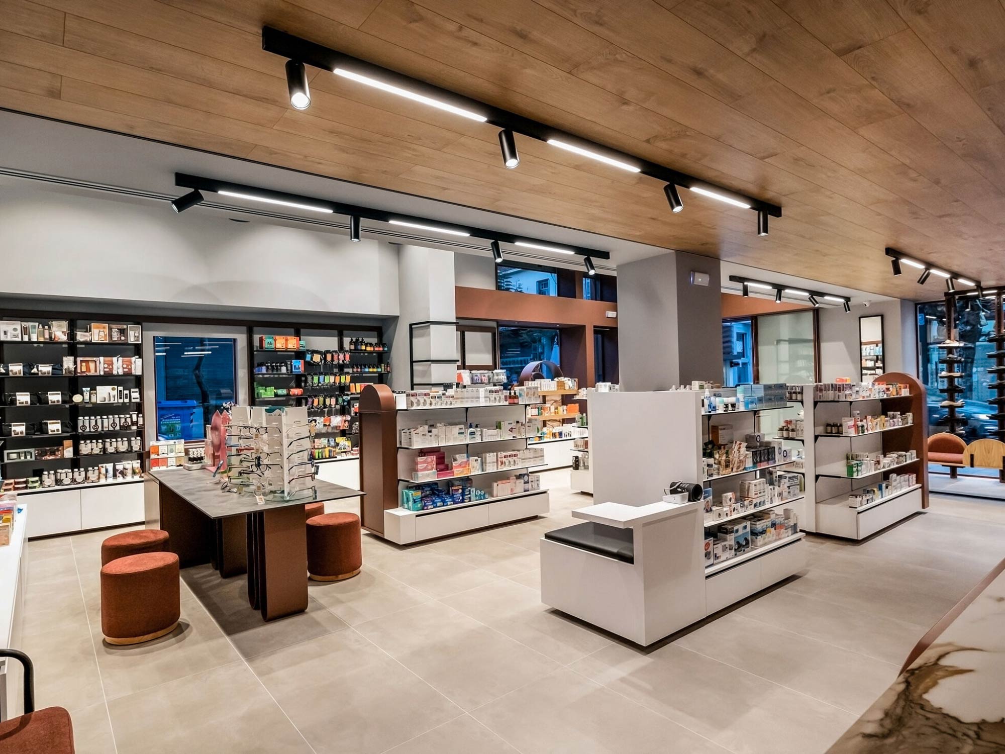 Tại nhà thuốc Chania, BLUEWOOD sử dụng hệ đèn ray kết hợp ánh sáng tuyến tính để đảm bảo độ sáng đồng đều trên toàn bộ không gian. Đồng thời, ánh sáng điểm được bố trí tại các khu vực trưng bày để làm nổi bật sản phẩm.