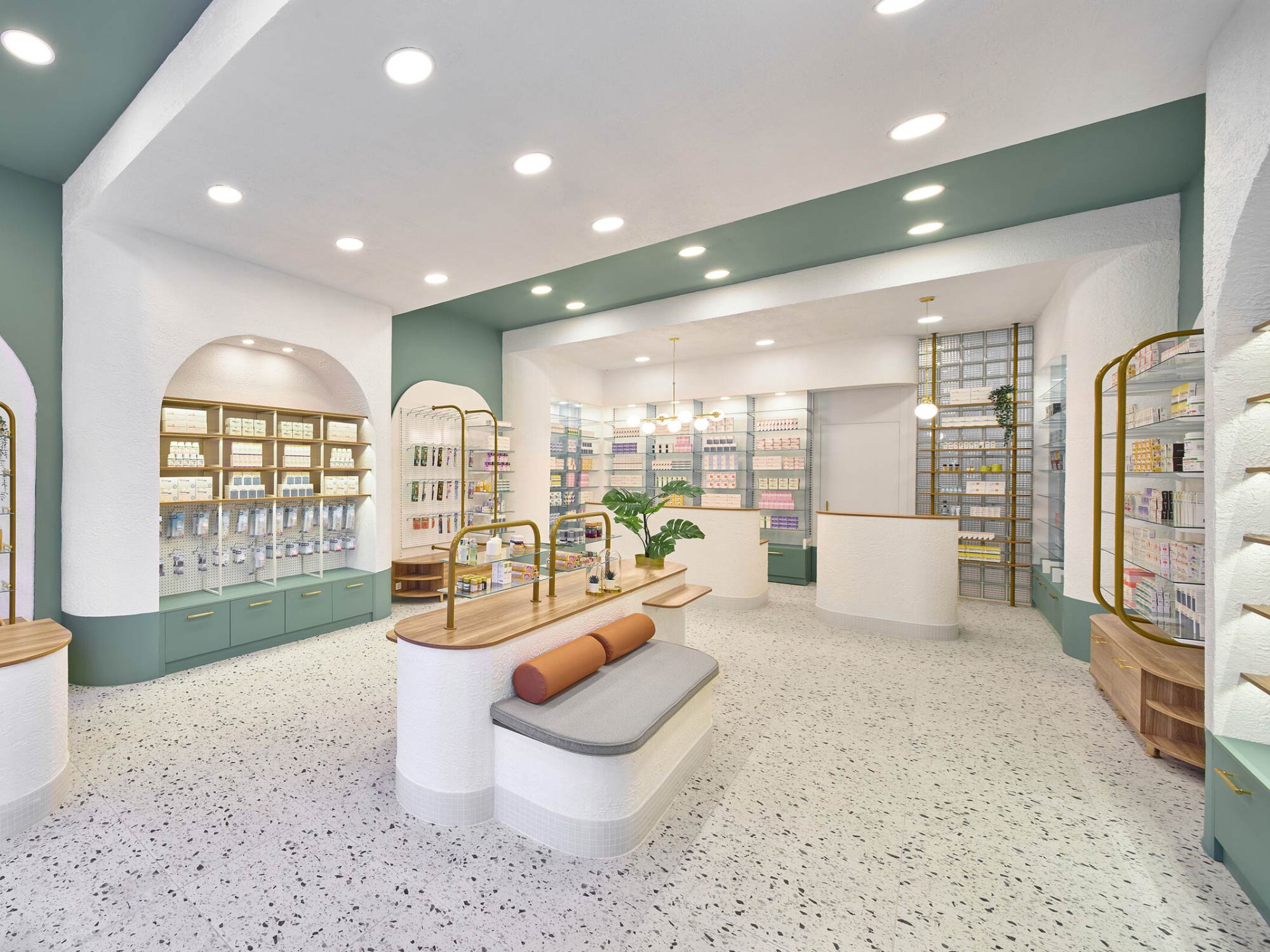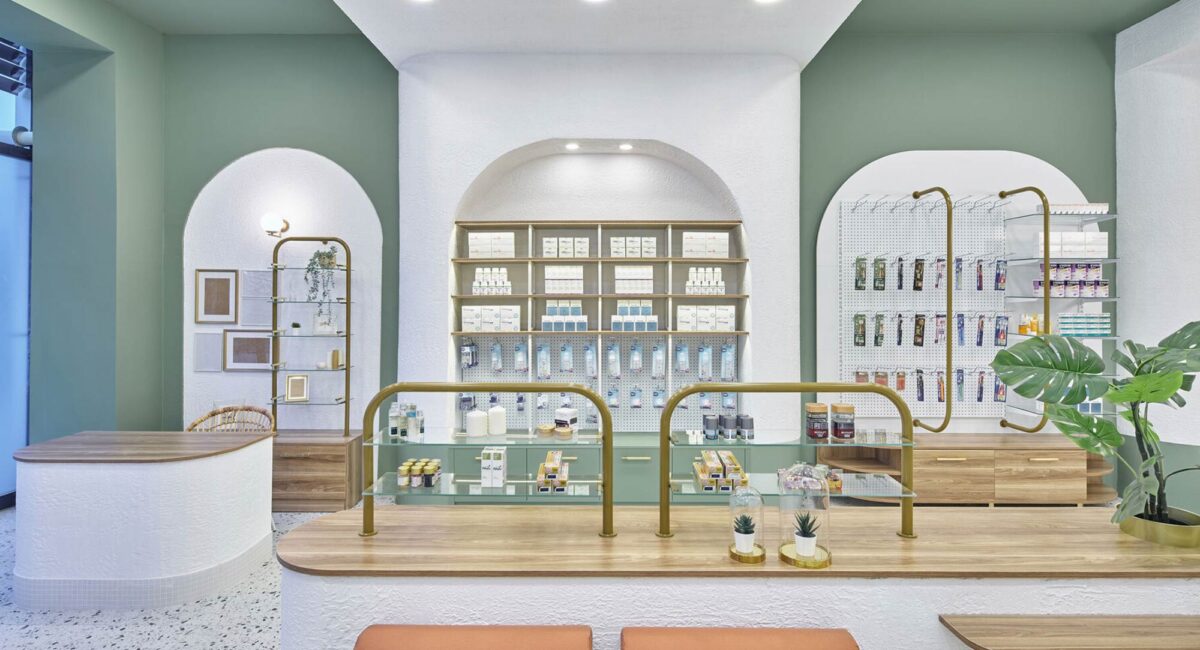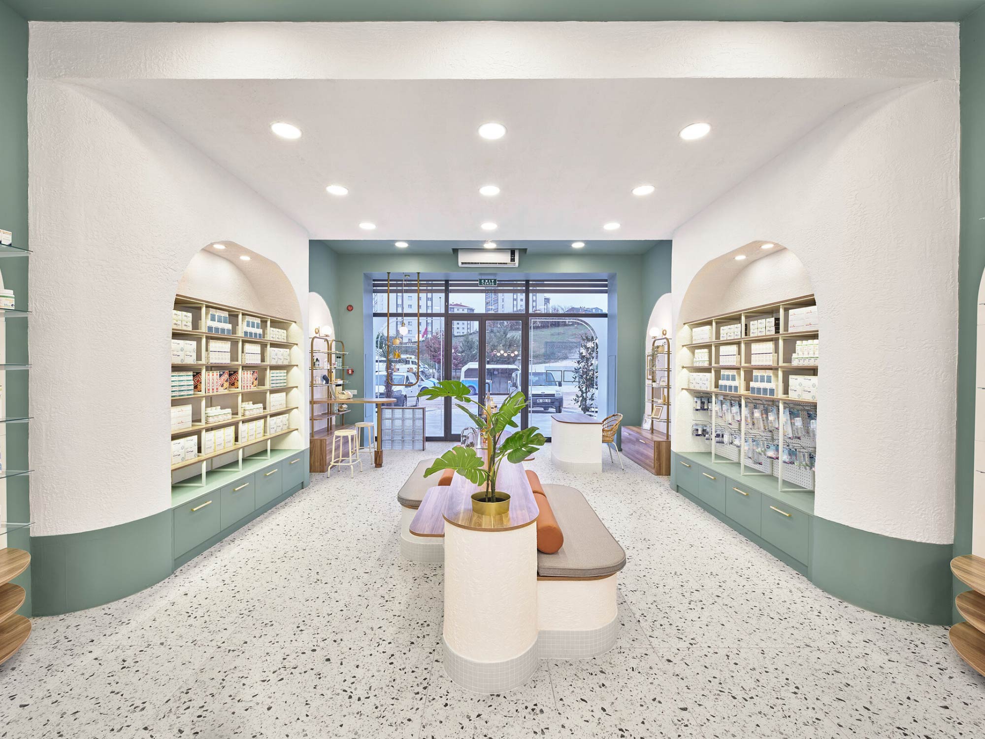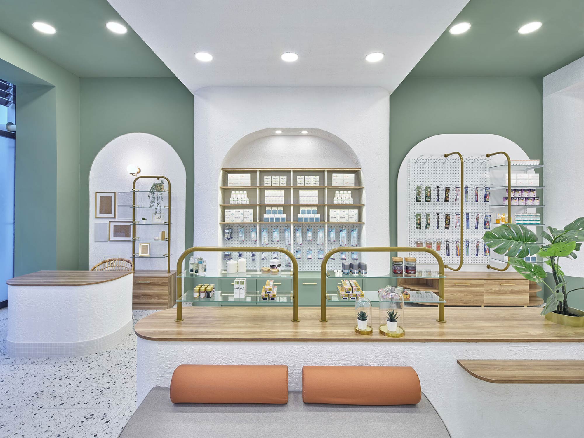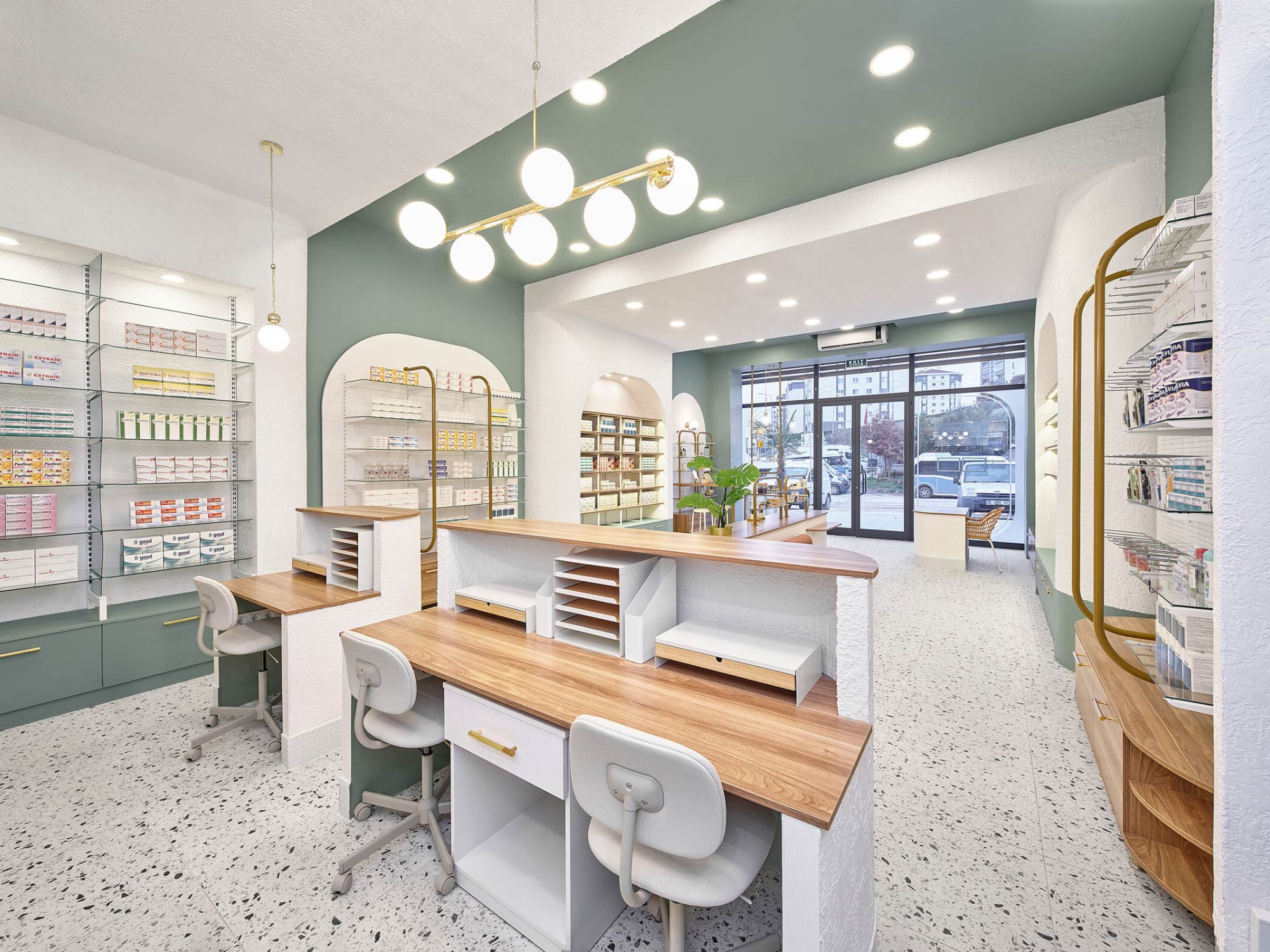 Điểm gây ấn tượng đầu tiên ở nhà thuốc Green là cảm giác nhẹ nhàng, thư thái và sạch sẽ ngay từ khoảnh khắc bước vào. BLUEWOOD đã lựa chọn bảng màu xanh sage làm tông chủ đạo, kết hợp cùng trắng kem và sắc gỗ sáng để tạo nên tổng thể hài hòa, dễ chịu và có chiều sâu.