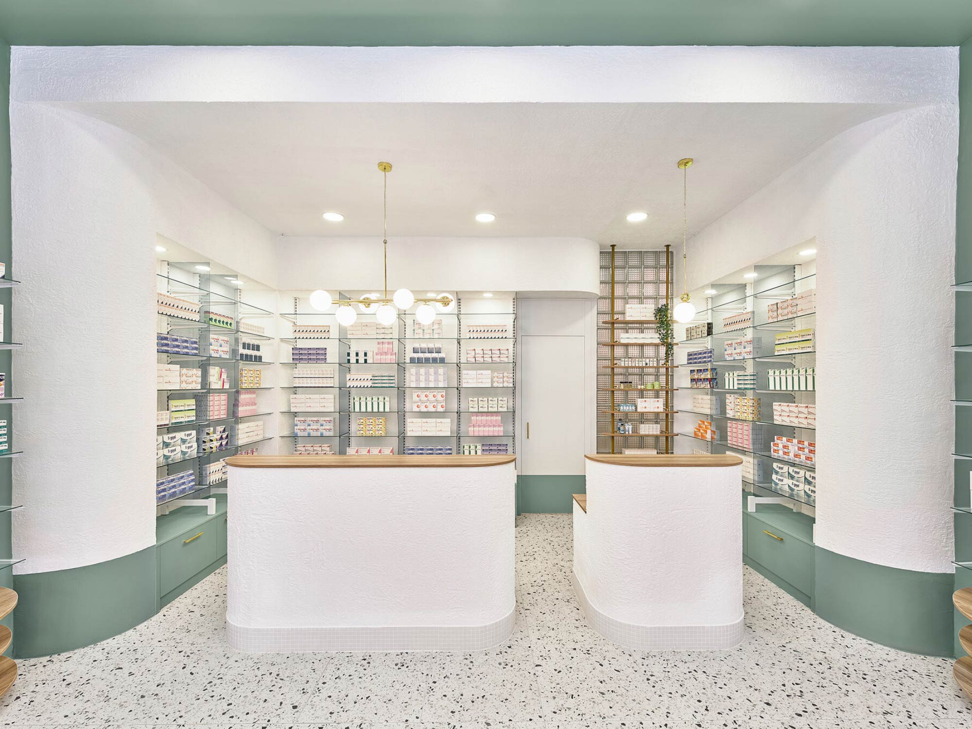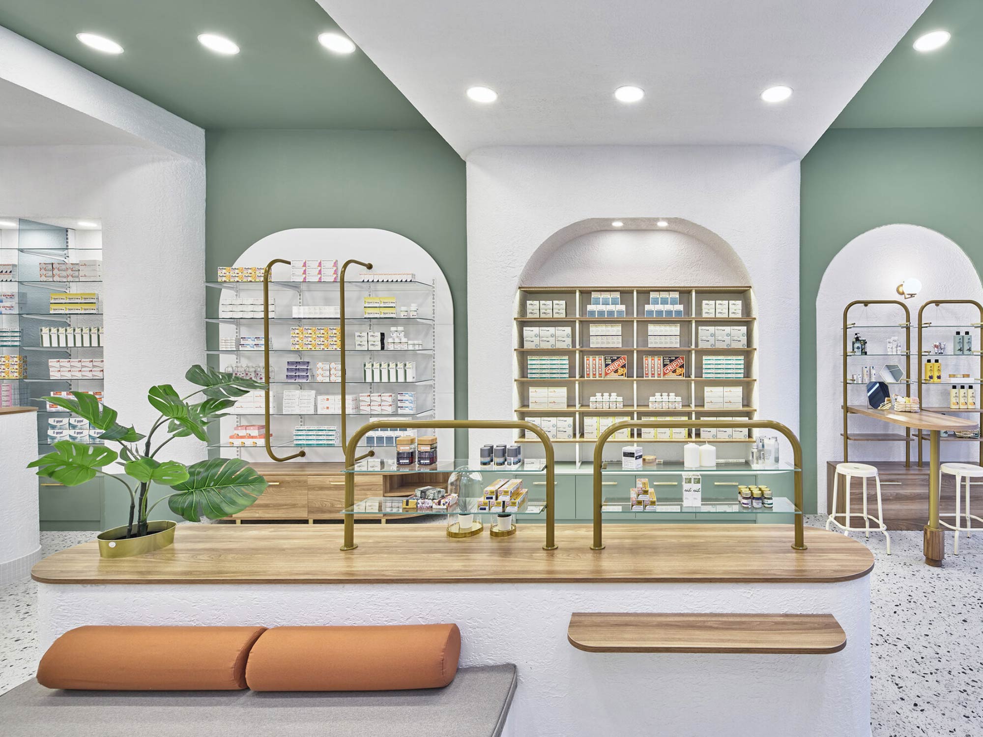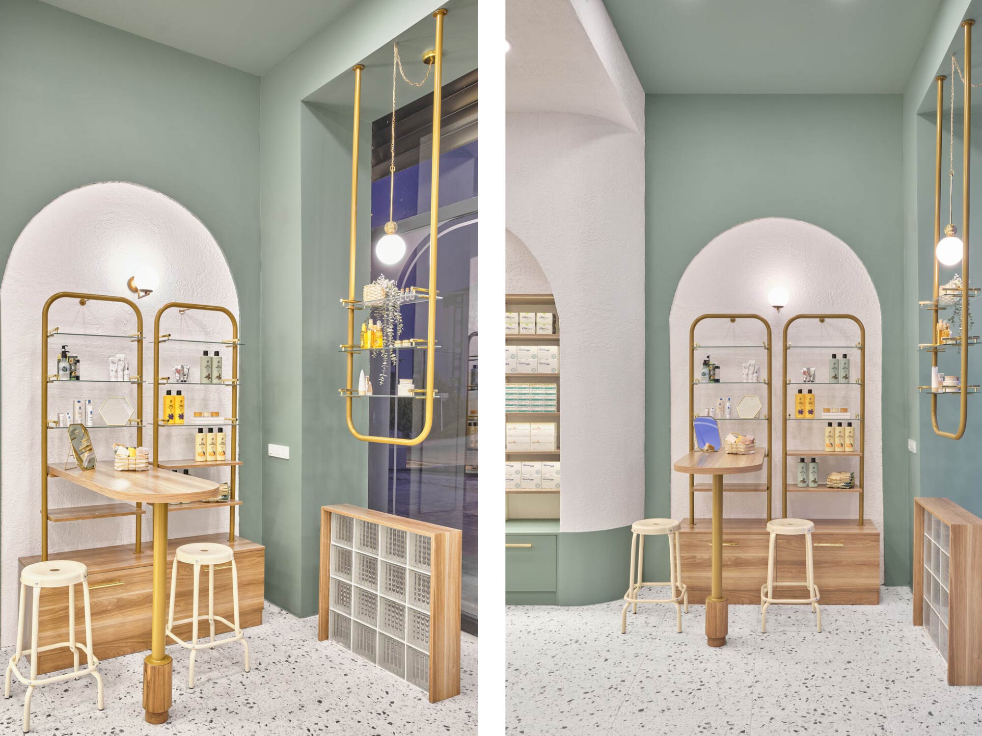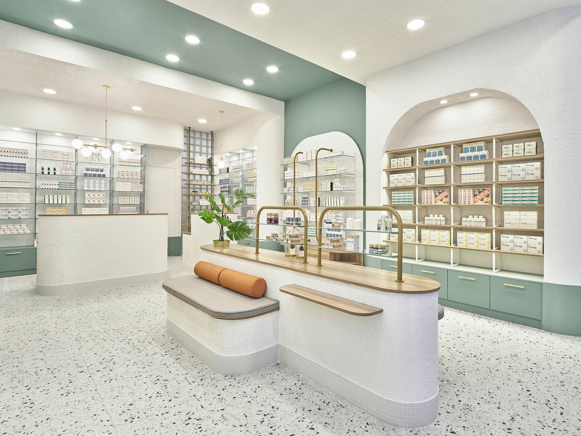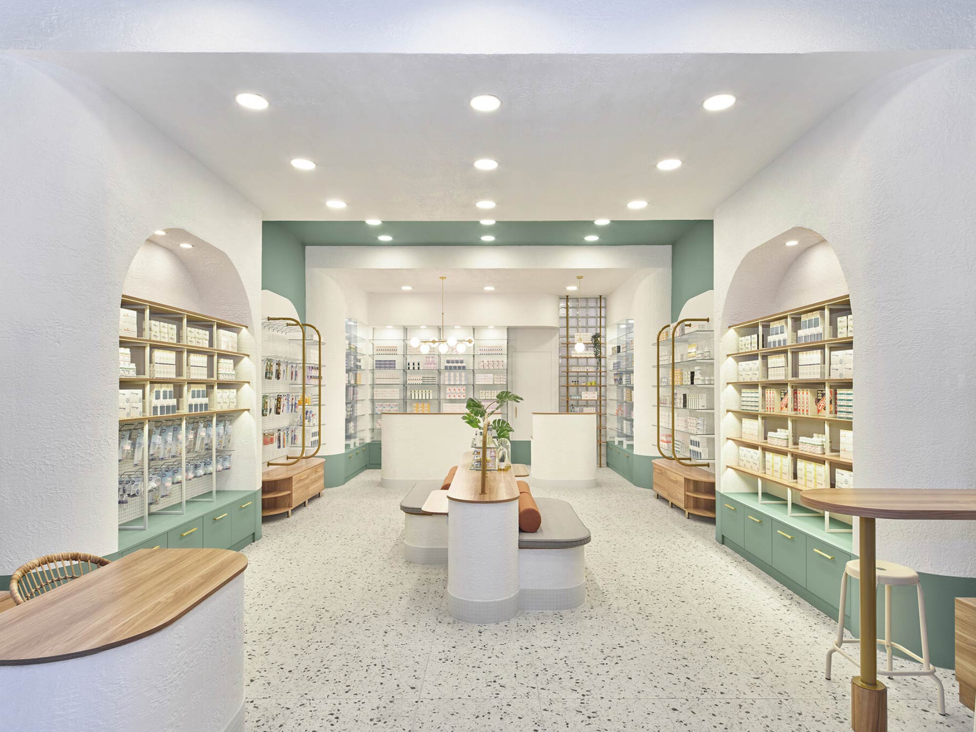 Điểm gây ấn tượng đầu tiên ở nhà thuốc Green là cảm giác nhẹ nhàng, thư thái và sạch sẽ ngay từ khoảnh khắc bước vào. BLUEWOOD đã lựa chọn bảng màu xanh sage làm tông chủ đạo, kết hợp cùng trắng kem và sắc gỗ sáng để tạo nên tổng thể hài hòa, dễ chịu và có chiều sâu.