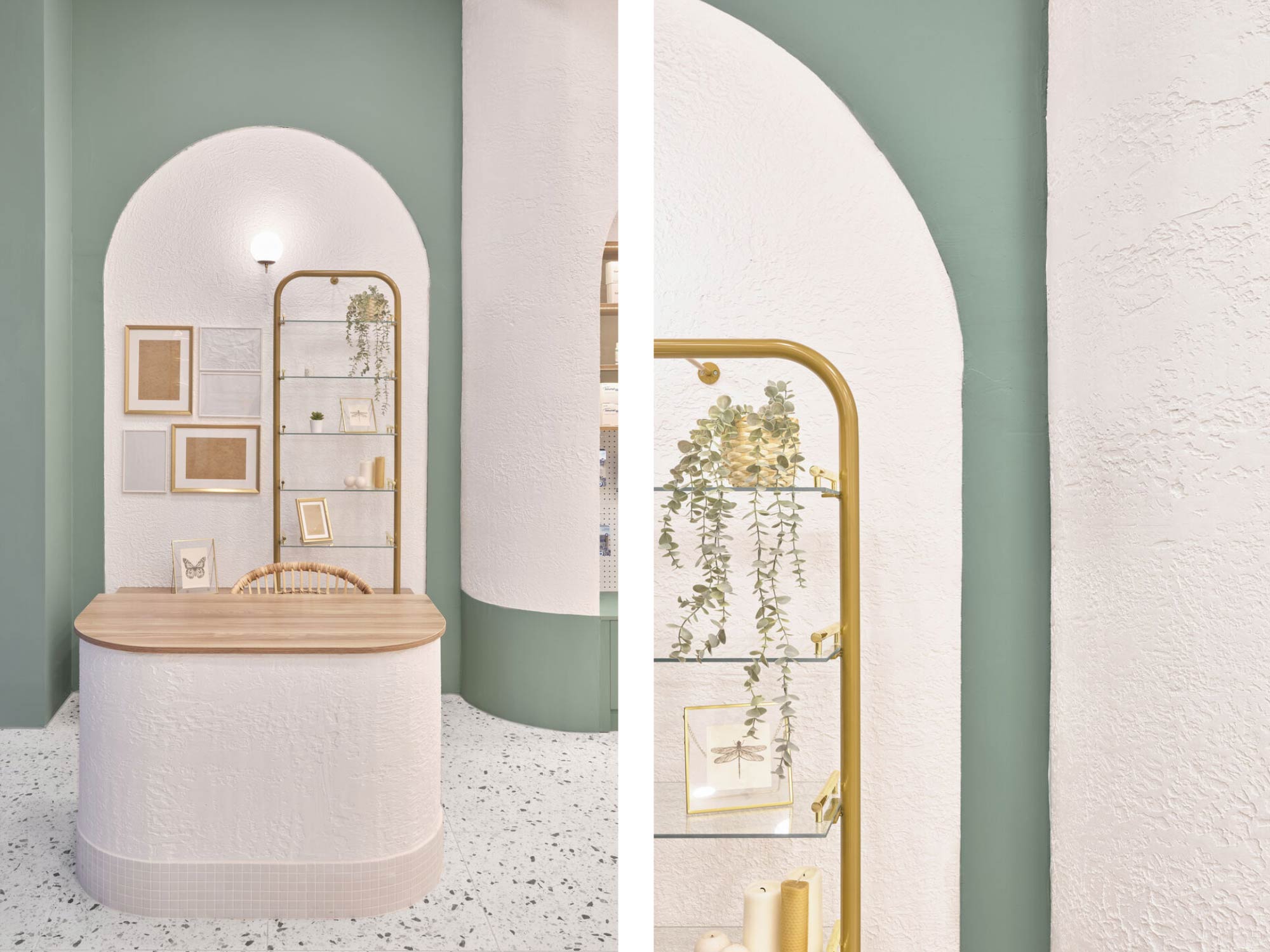 Gam xanh sage không chỉ mang ý nghĩa thị giác về sự cân bằng, tươi mới mà còn gợi cảm giác chữa lành – rất phù hợp với đặc thù của không gian chăm sóc sức khỏe. Tông trắng kem giúp tăng cảm giác sạch sẽ, sáng thoáng, trong khi chất liệu gỗ đóng vai trò làm mềm không gian, tạo sự gần gũi và thân thiện hơn với khách hàng.