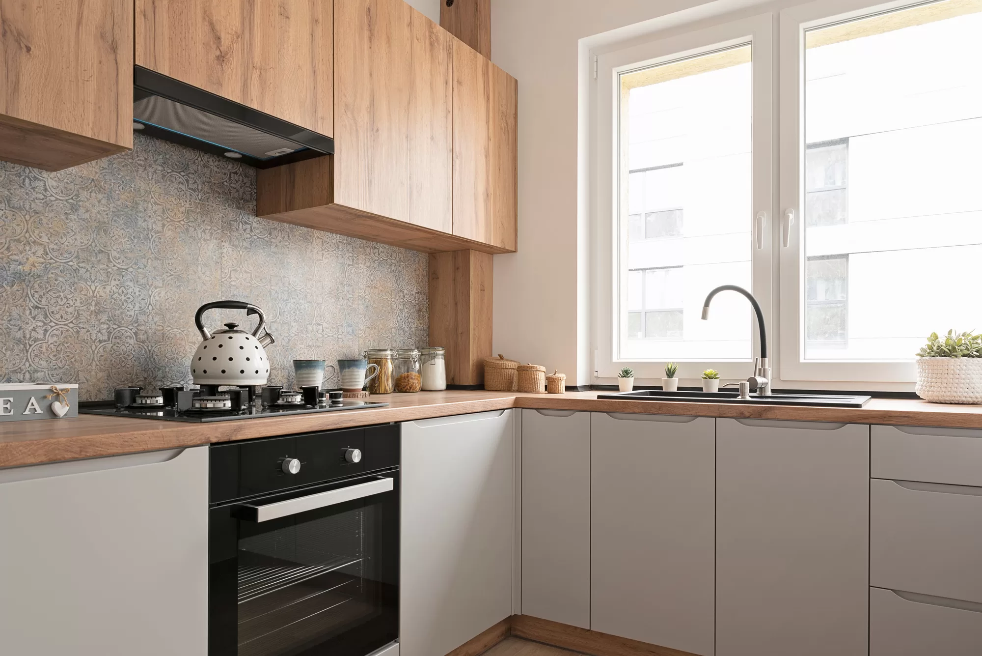 🔹 Tận dụng góc tường: Thiết kế tủ bếp chữ L hoặc chữ U giúp tận dụng tối đa không gian mà vẫn đủ chỗ cho các thiết bị nấu ăn.
