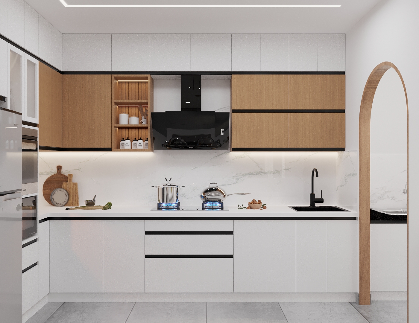 🔹 Hệ thống đèn LED: Lắp đèn dưới tủ bếp để tăng sự tiện lợi và tạo cảm giác thoáng rộng hơn.