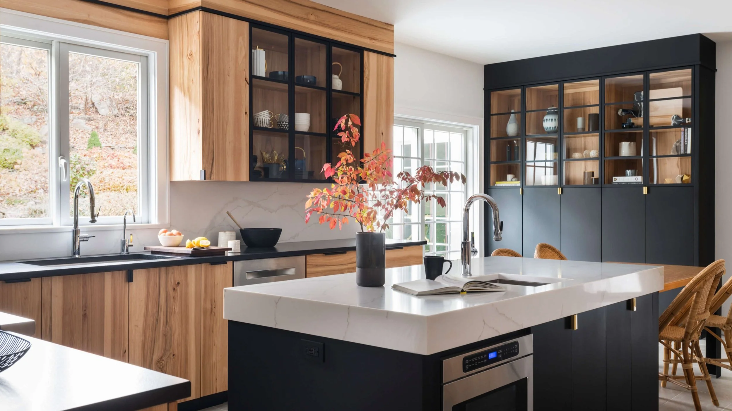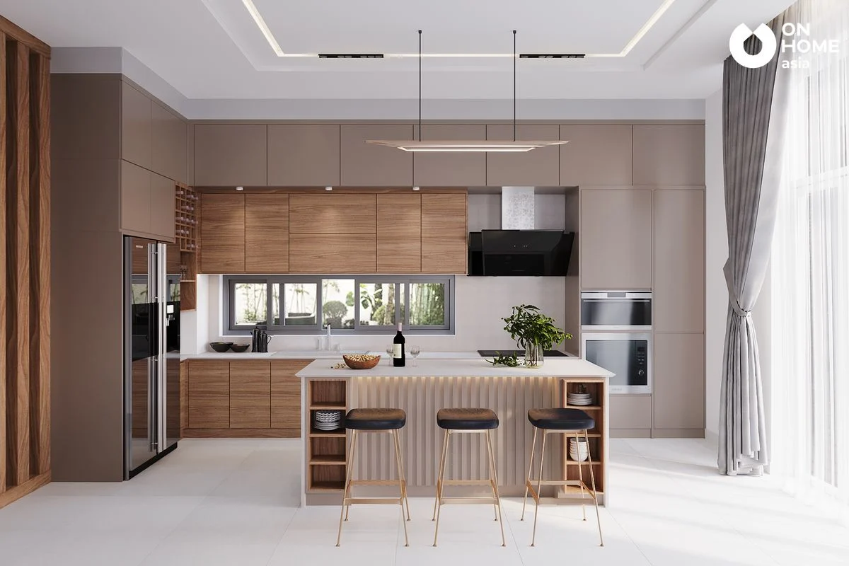 Ngoài ra, sự kết hợp giữa nhiều loại vật liệu như gỗ, đá, kính và kim loại cũng giúp tạo điểm nhấn cho không gian. Ví dụ, mặt bàn đá tự nhiên hoặc đá nhân tạo mang lại vẻ sang trọng và dễ vệ sinh, trong khi kính và kim loại giúp tăng nét hiện đại và tinh tế cho tổng thể nội thất.