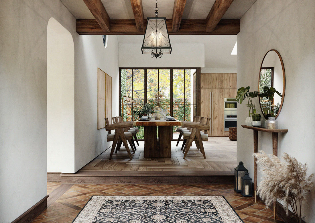 Gỗ là vật liệu chủ đạo trong thiết kế Farmhouse. Những bề mặt gỗ với vân tự nhiên mang đến cảm giác ấm áp, thân thiện và bền vững theo thời gian.