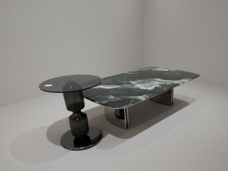 - Cấu trúc chân: Chân tấm uốn cong (bàn lớn) và chân trụ tạo hình (bàn nhỏ)