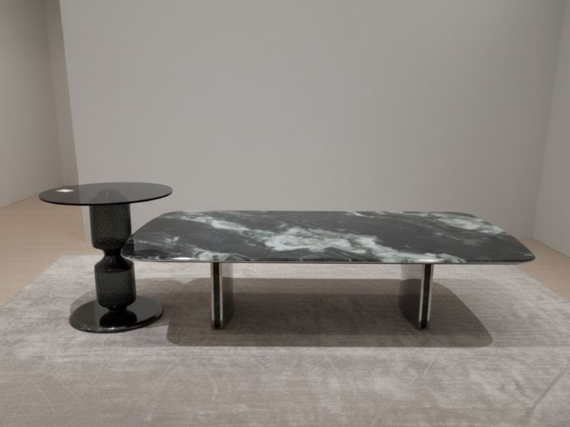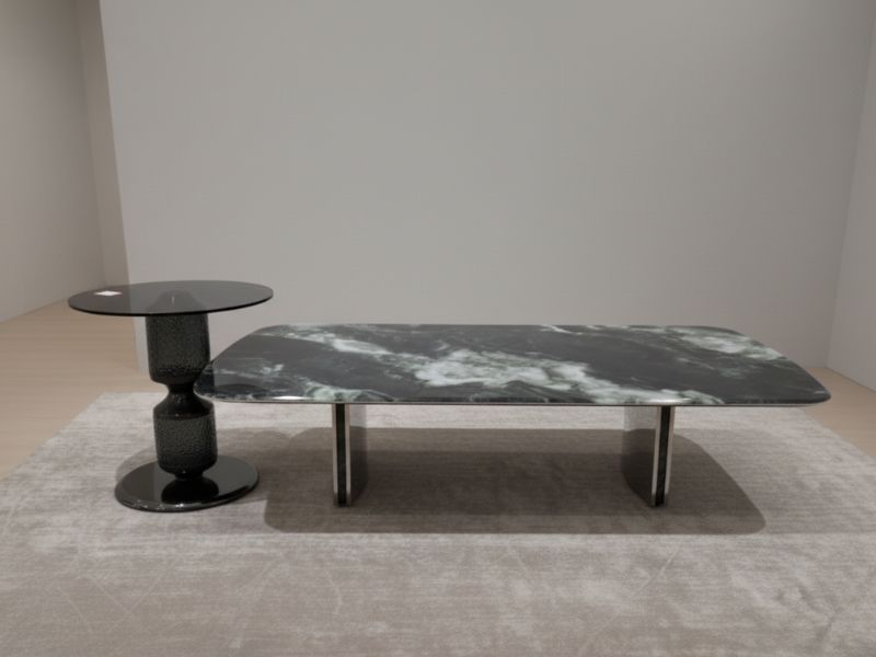 - Chất liệu cao cấp: Mặt đá tinh thể vân loang tự nhiên chống trầy xước, chịu nhiệt; chân hợp kim uốn cong chắc chắn; bàn góc nhỏ với chân inox nghệ thuật và mặt kính màu khói sang trọng.