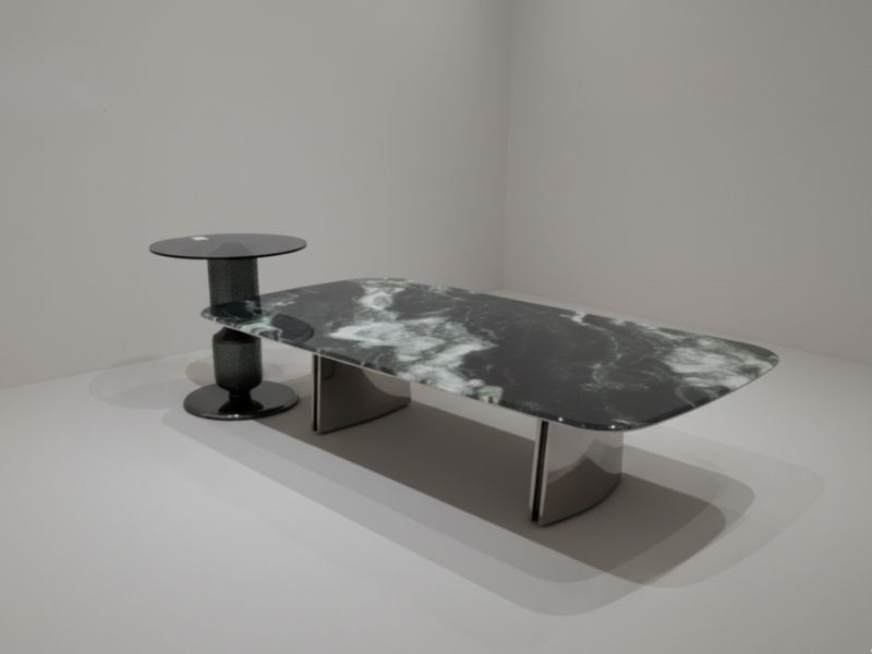 Phần kệ góc đi kèm là một điểm cộng lớn về mặt thẩm mỹ. Chân inox của kệ được tạo hình khối trụ điêu khắc độc đáo, kết hợp cùng mặt kính tối màu tạo nên sự tương phản thú vị với bàn lớn nhưng vẫn giữ được sự hài hòa tổng thể. Nhờ bề mặt đá và kính nhẵn mịn, việc vệ sinh lau chùi trở nên cực kỳ đơn giản, giúp sản phẩm luôn giữ được vẻ đẹp như mới sau thời gian dài sử dụng.