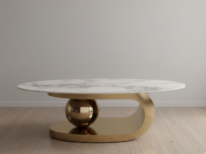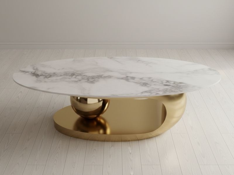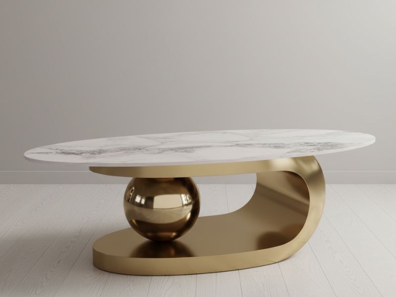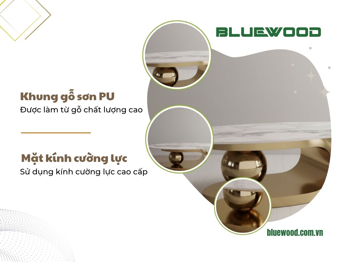 - Thiết kế độc đáo, hiện đại: Kiểu dáng bầu dục, chân bàn uốn lượn kết hợp khối cầu mạ vàng sang trọng, tạo điểm nhấn nghệ thuật cho phòng khách.