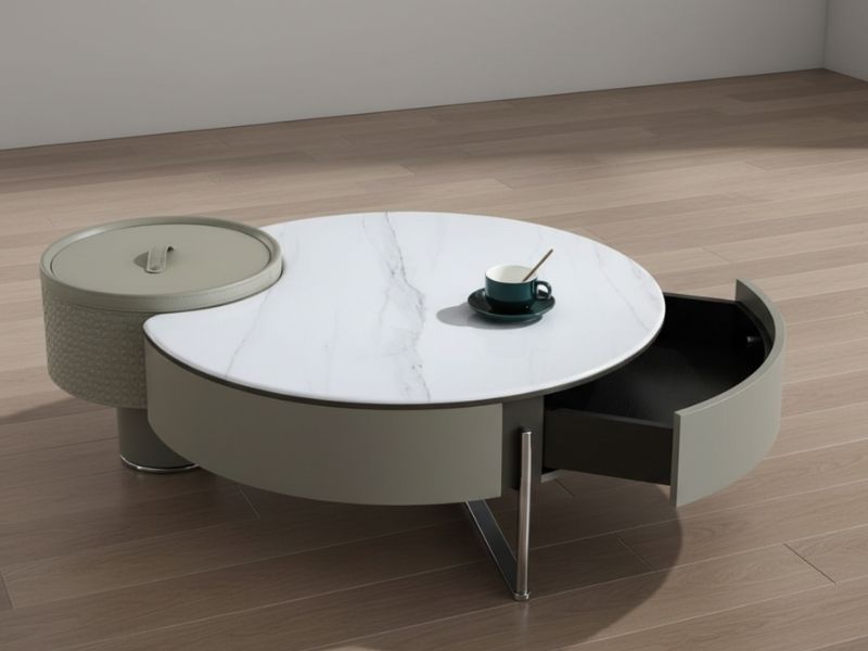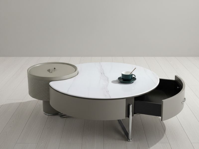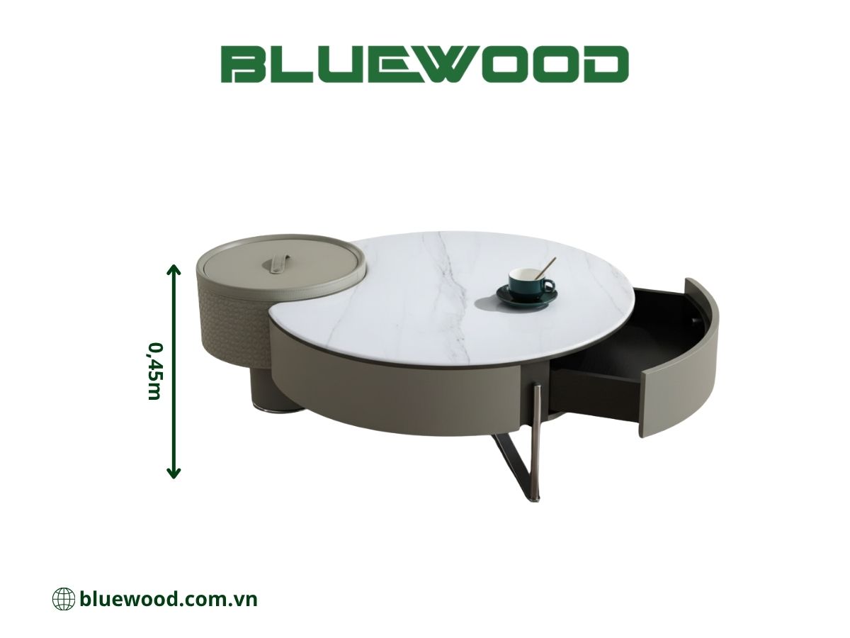 - Cấu trúc: Bàn tròn với một phần hộc chứa đồ liền kề, tích hợp ngăn kéo tiện lợi.