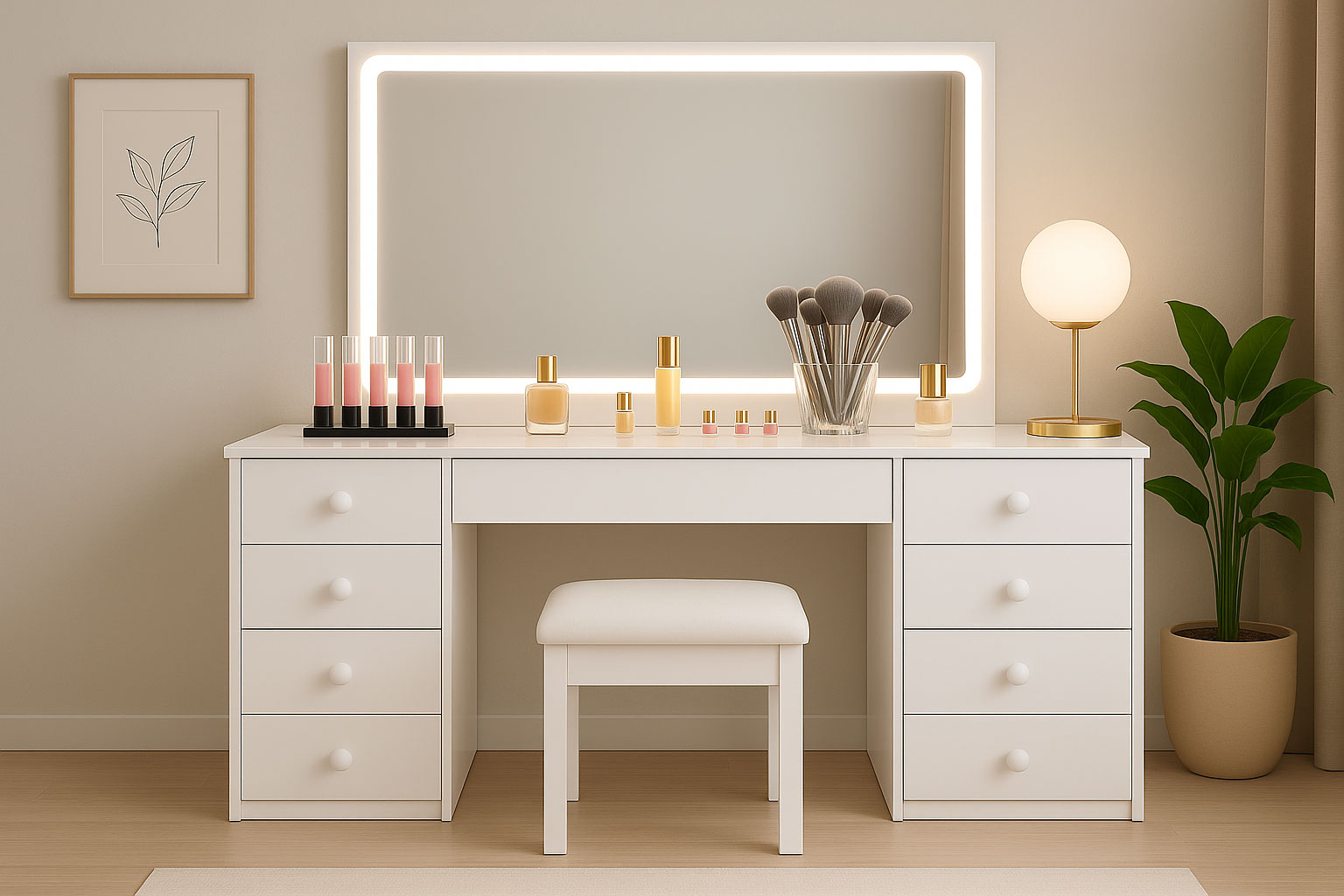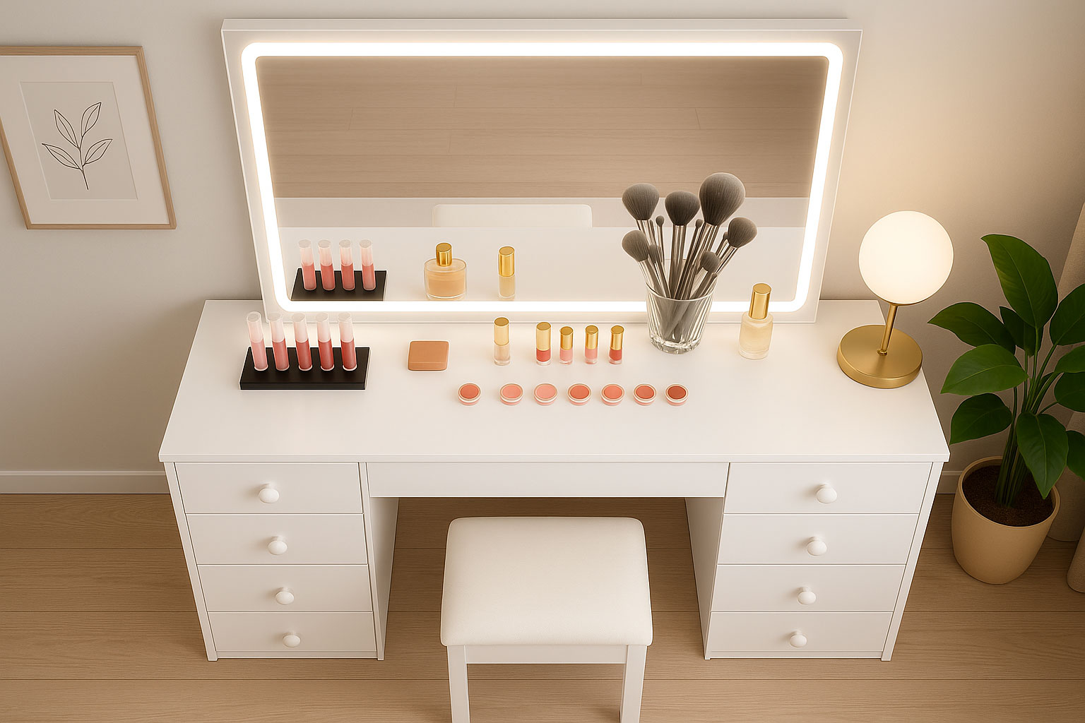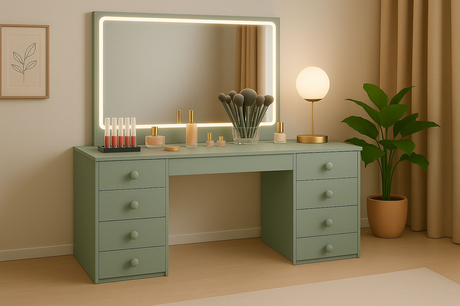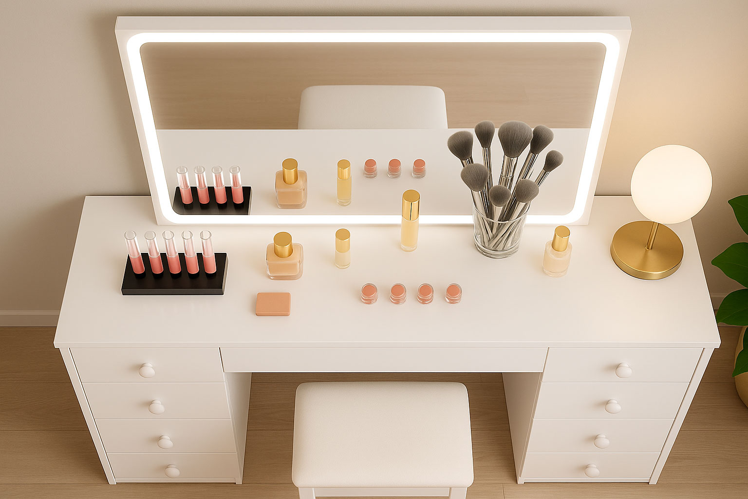 - Mặt bàn dài: Dễ dàng thao tác nhiều bước dưỡng da, makeup cùng lúc hoặc bố trí thêm gương phụ, khay đựng mỹ phẩm.