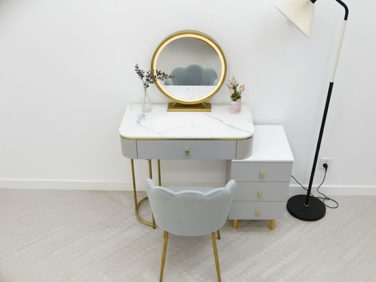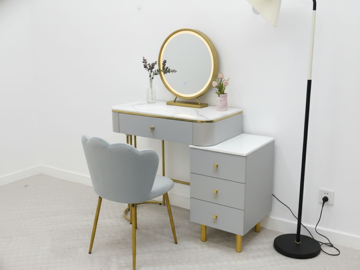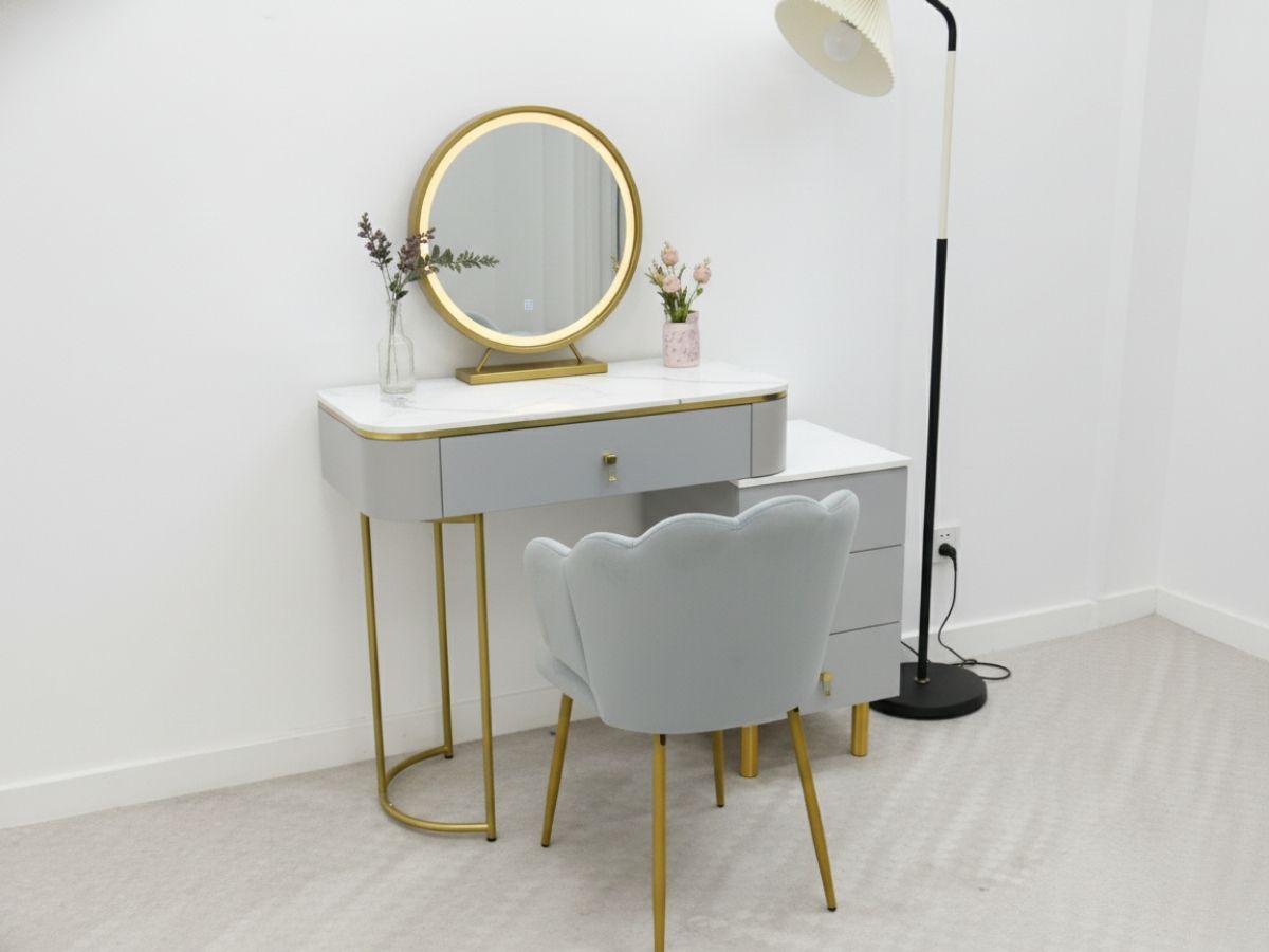 - Công năng đa dạng: Gương LED hỗ trợ trang điểm chuẩn xác, ghế nệm thoải mái, phù hợp phòng nhỏ, có thể dùng làm góc làm việc/học tập.