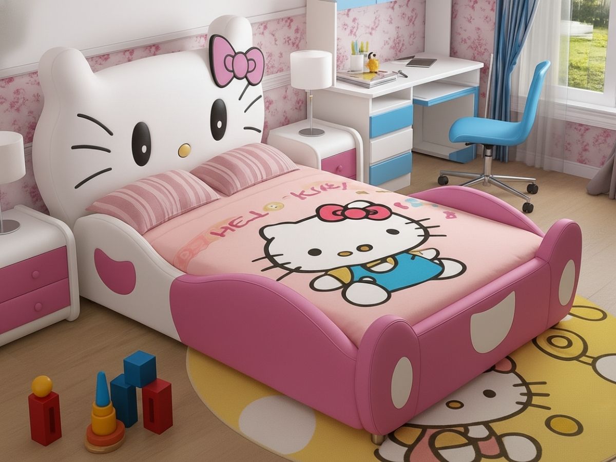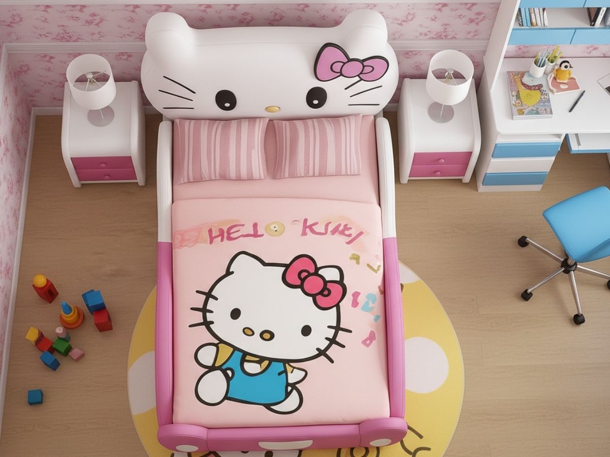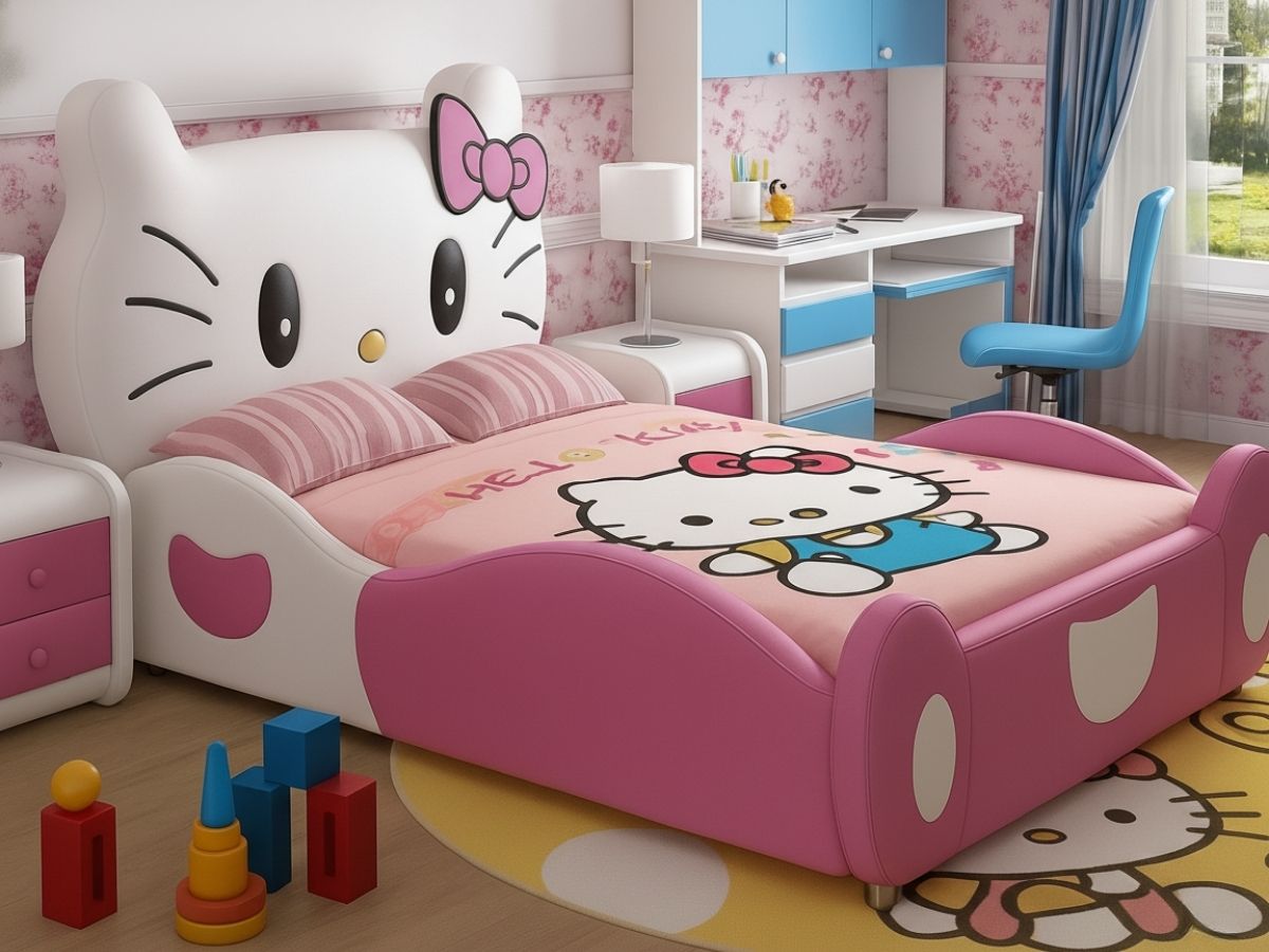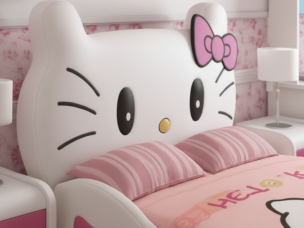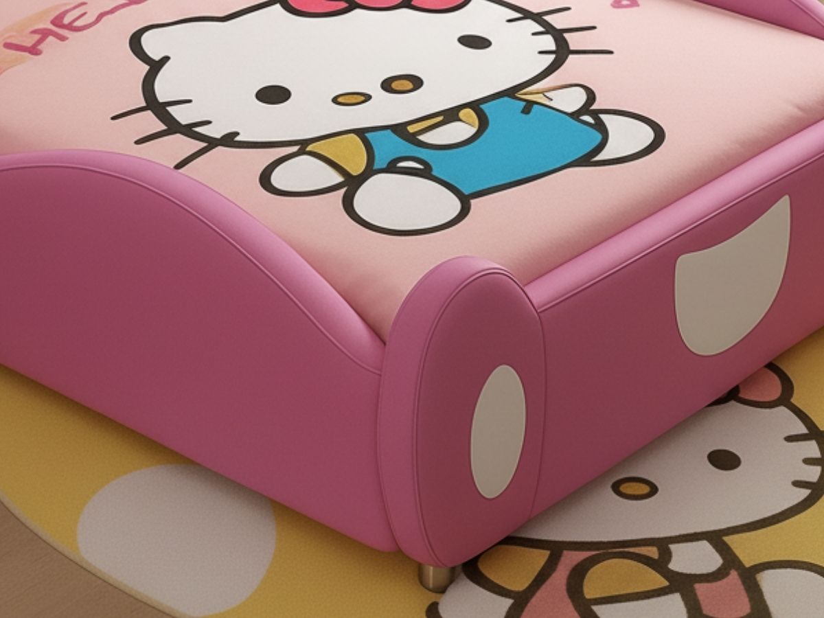 - Đầu giường nguyên tấm liền khối: Điểm nhấn nổi bật nhất của GNG-126 là phần đầu giường được thiết kế dạng nguyên tấm liền khối. Thiết kế này không chỉ tạo nên vẻ đẹp sang trọng, bề thế (hoặc dễ thương tùy theo lớp phủ tạo hình như Hello Kitty trong ảnh) mà còn mang lại cảm giác tựa lưng vững chãi, an toàn.