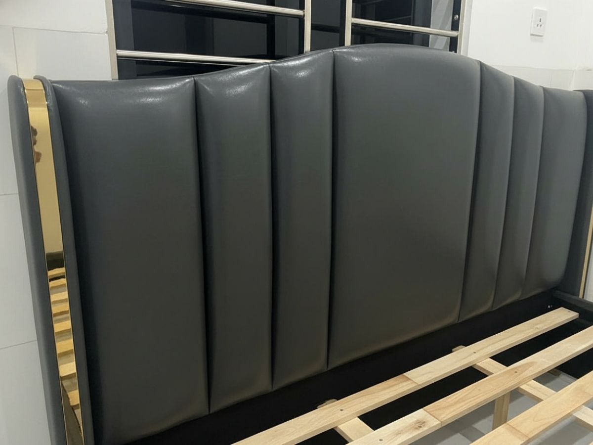 - Viền kim loại mạ vàng: Những đường viền mạ vàng chạy dọc theo đường cong đầu giường không chỉ tạo điểm nhấn nổi bật mà còn tôn lên vẻ đẹp sang trọng, đẳng cấp.