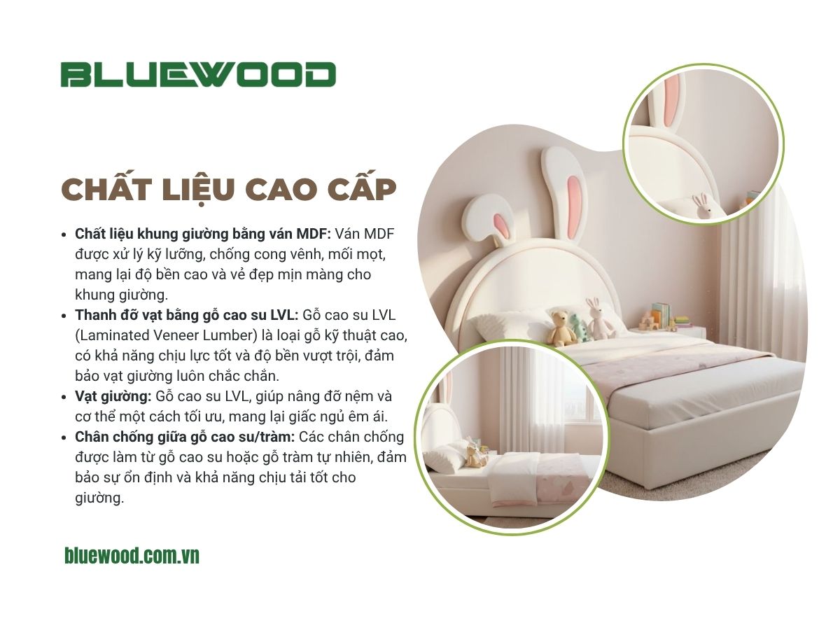 - Chất liệu cao cấp: Khung MDF chống cong vênh, mối mọt; vạt và thanh đỡ bằng gỗ cao su LVL bền chắc, chịu lực tốt; chân chống gỗ cao su/tràm tự nhiên tăng độ ổn định.