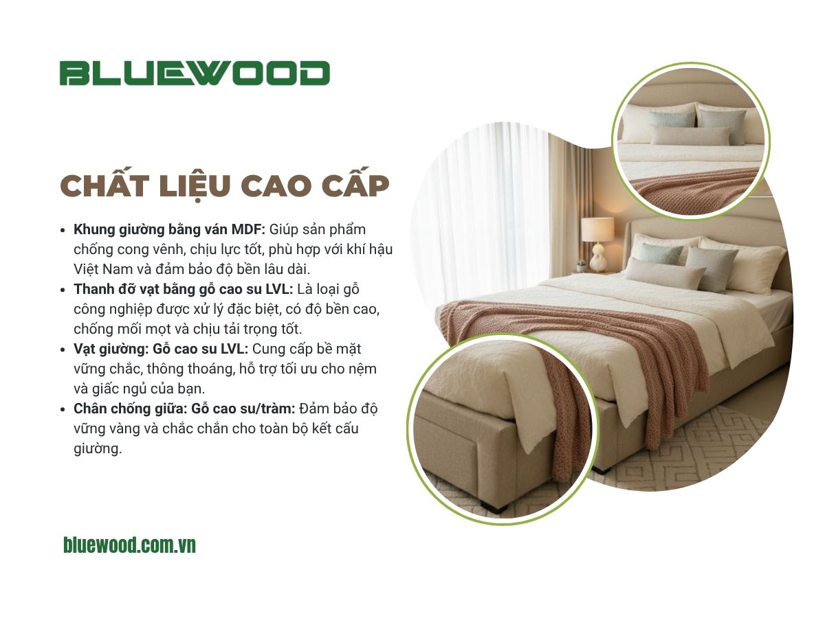- Chất liệu cao cấp: Khung MDF chống cong vênh, vạt và thanh đỡ bằng gỗ cao su LVL, chân chống gỗ cao su/tràm.