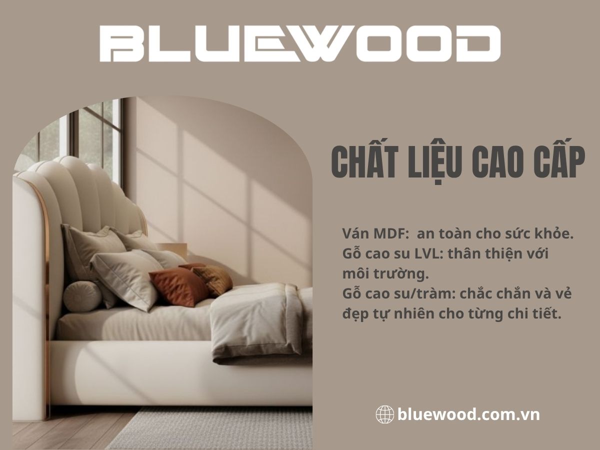 - Chất liệu cao cấp: Khung MDF chống cong vênh, hông giường dày 5cm, vạt và thanh đỡ bằng gỗ cao su LVL, chân chống gỗ cao su/tràm.