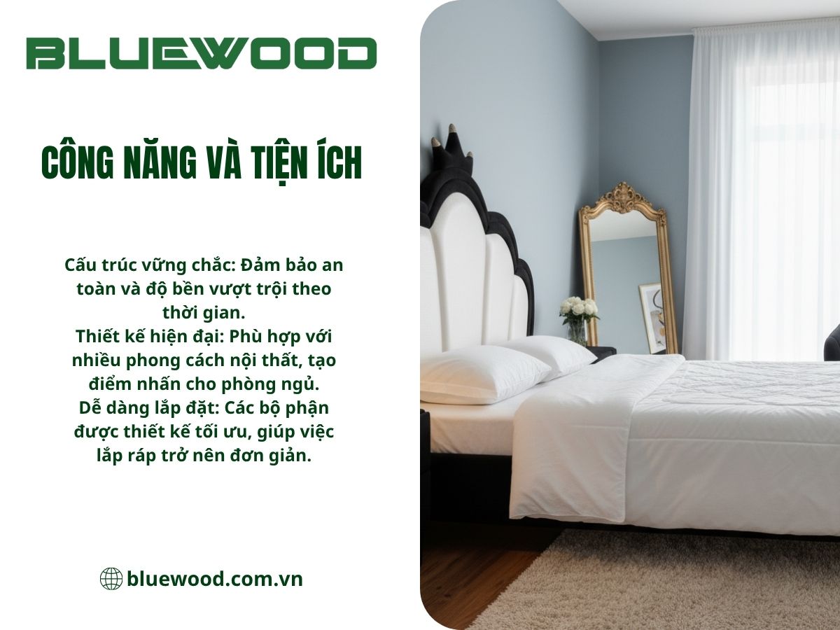- Chất liệu cao cấp: Khung MDF chống ẩm, vạt và thanh đỡ bằng gỗ cao su LVL bền bỉ, chân chống gỗ cao su/tràm vững chắc.