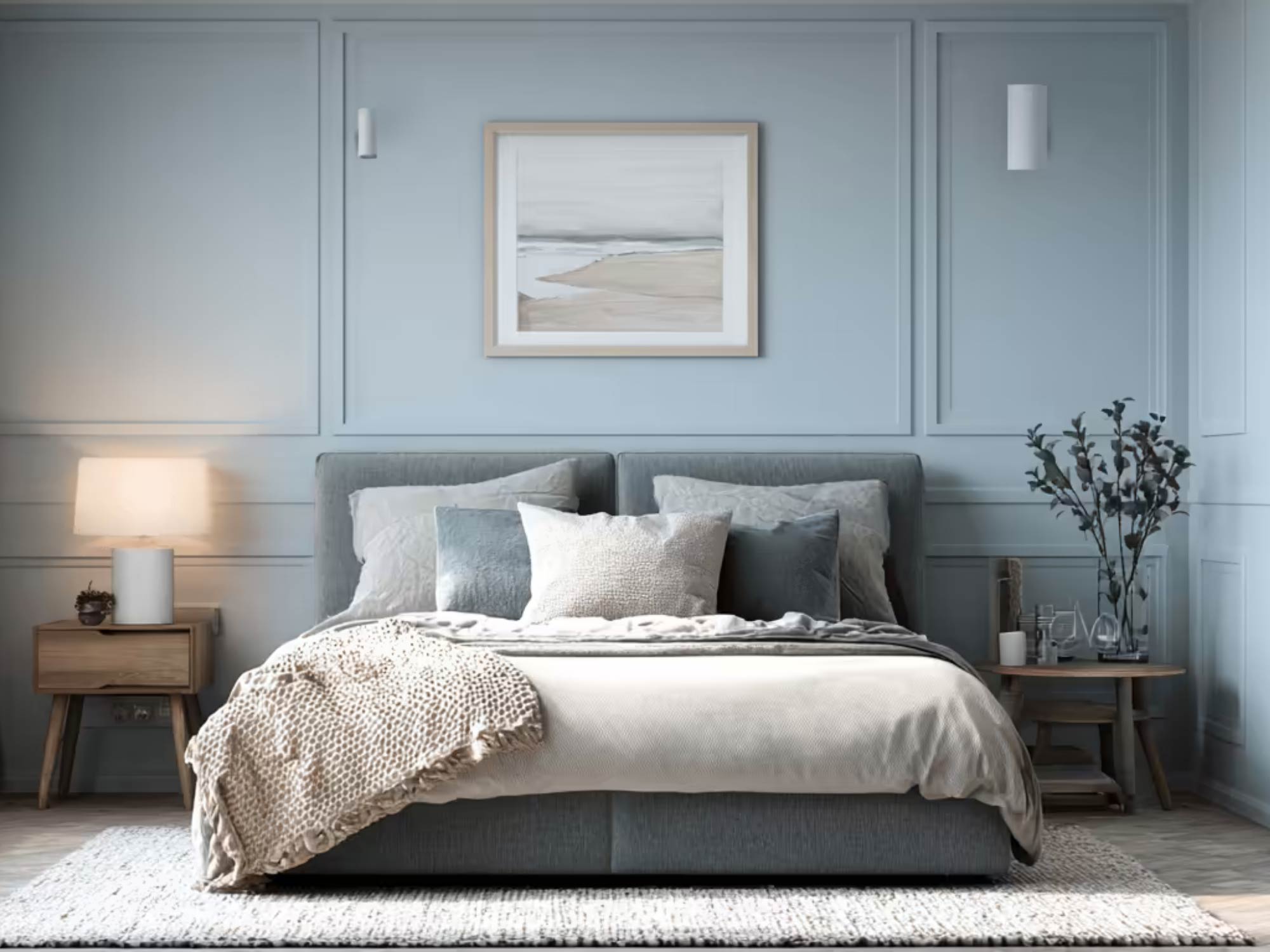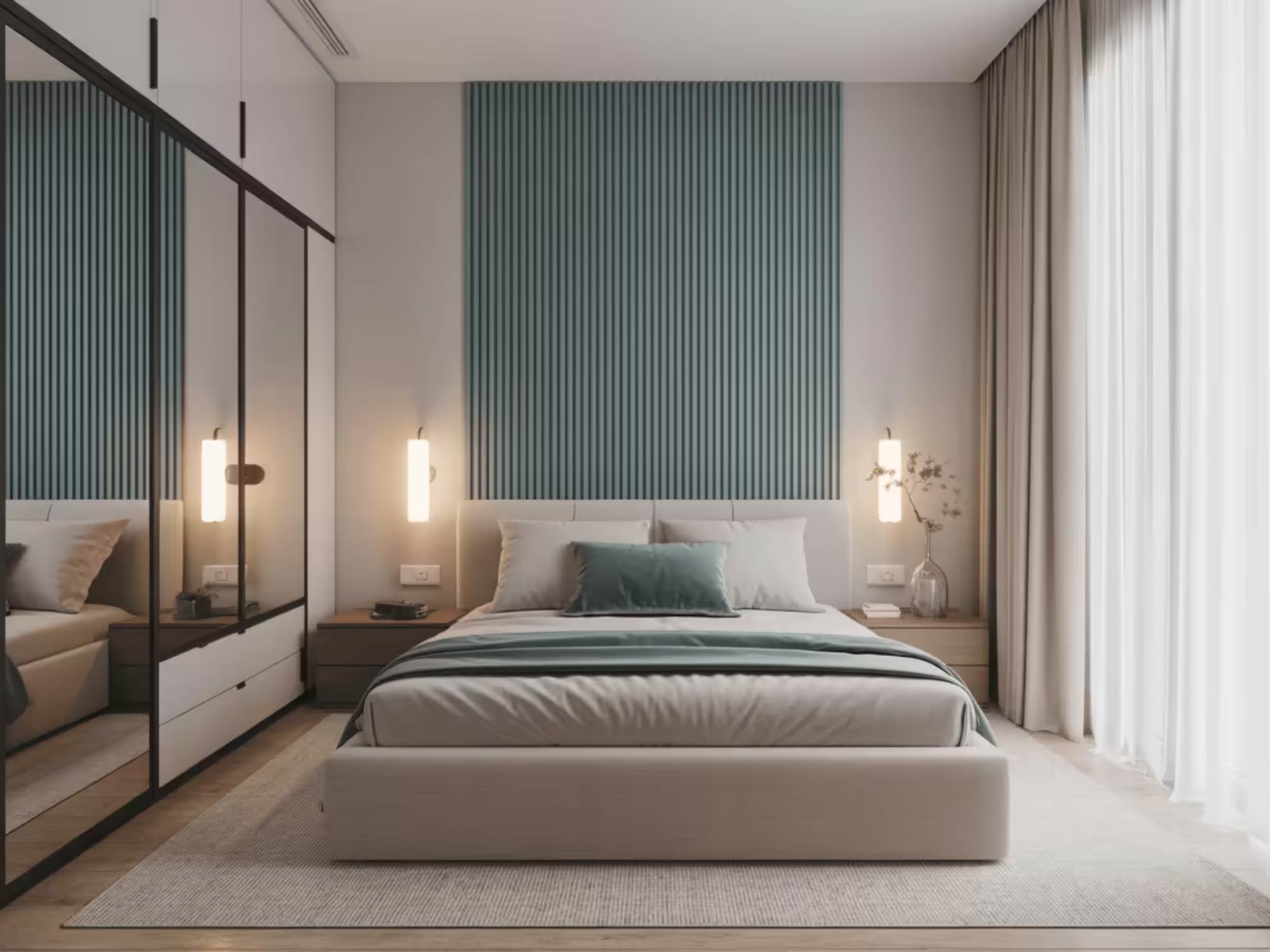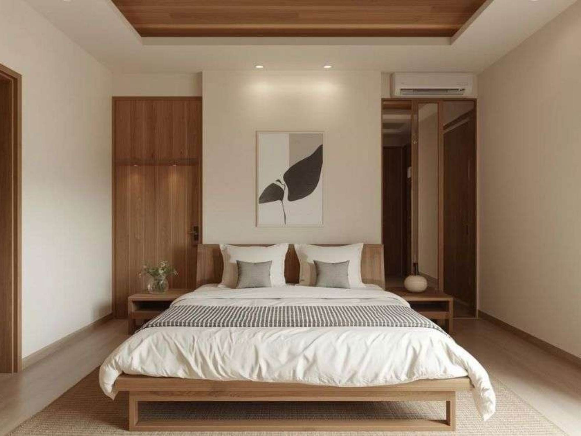 Tường được chia mảng rõ ràng, với một điểm nhấn chính tại đầu giường. Các mảng còn lại giữ đơn giản để tạo sự cân bằng. Sàn sử dụng vật liệu ấm như gỗ công nghiệp hoặc sàn SPC vân gỗ, giúp tăng cảm giác dễ chịu khi sử dụng.