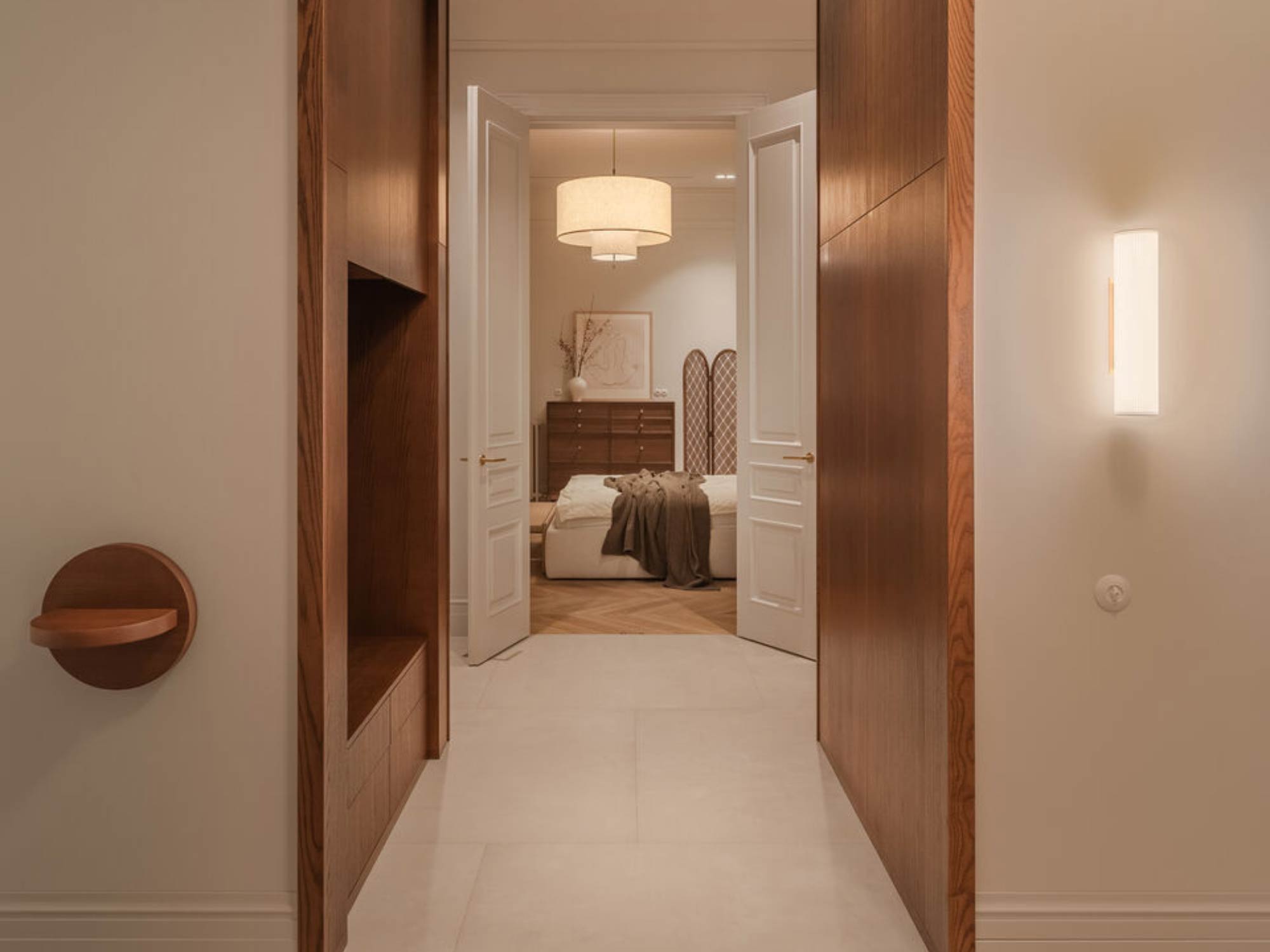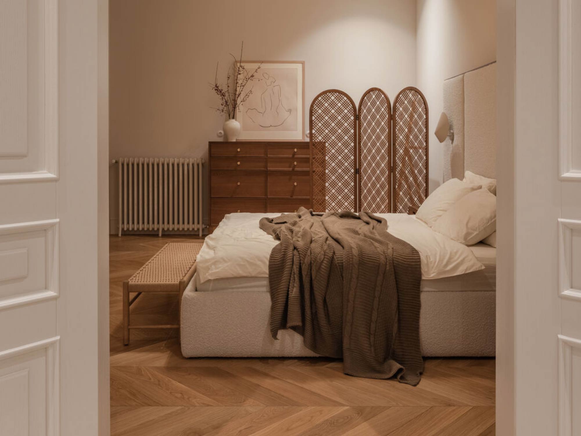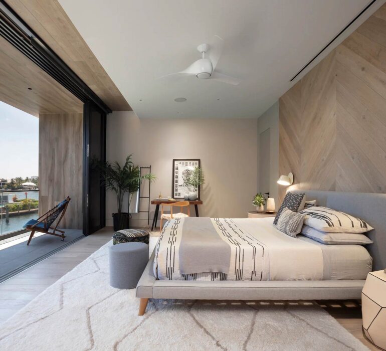 Tường được chia mảng rõ ràng, với một điểm nhấn chính tại đầu giường. Các mảng còn lại giữ đơn giản để tạo sự cân bằng. Sàn sử dụng vật liệu ấm như gỗ công nghiệp hoặc sàn SPC vân gỗ, giúp tăng cảm giác dễ chịu khi sử dụng.