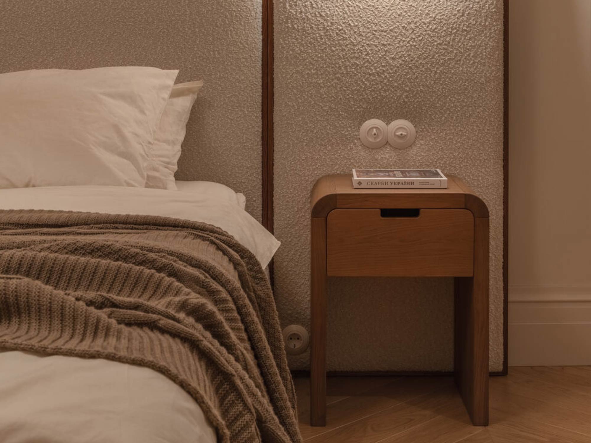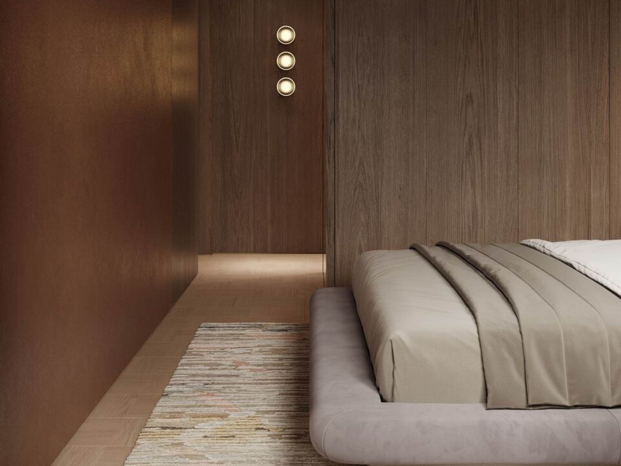 Tuy nhiên, tối giản không đồng nghĩa với đơn điệu. Điểm mạnh của BLUEWOOD nằm ở việc tạo chiều sâu thông qua vật liệu và ánh sáng thay vì chi tiết trang trí. Một mảng tường đầu giường có thể được xử lý bằng panel gỗ mỏng, sơn hiệu ứng hoặc vải bọc nhẹ, kết hợp ánh sáng hắt để tạo điểm nhấn mà không làm nặng không gian.