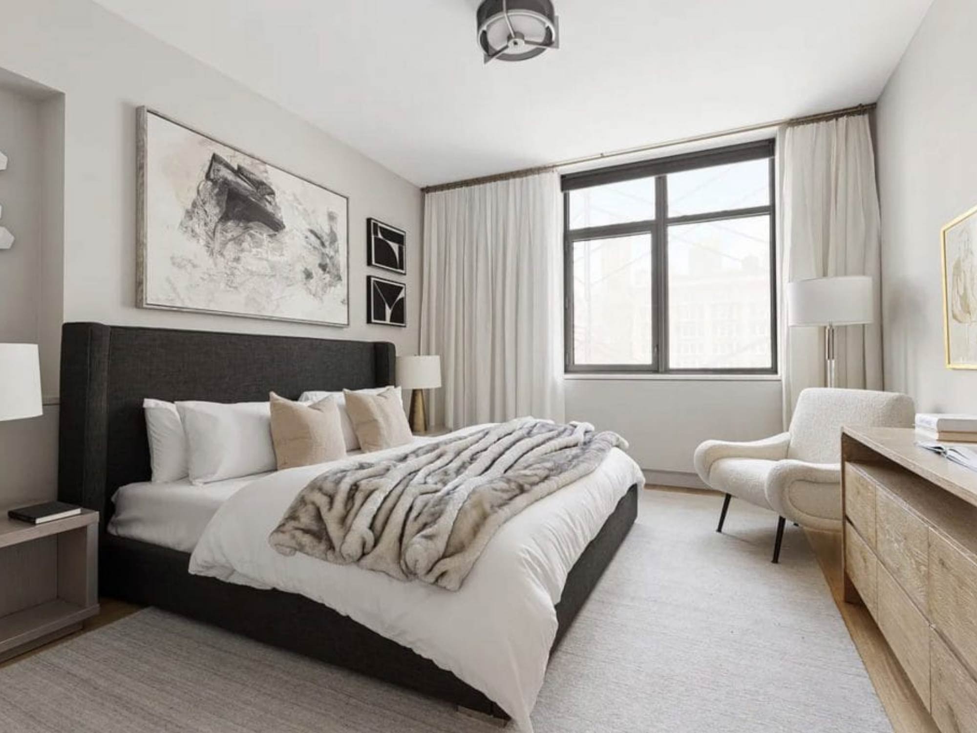 Ánh sáng gián tiếp (indirect lighting) được sử dụng nhiều để giảm độ chói và làm mềm không gian. Đồng thời, việc tận dụng ánh sáng tự nhiên thông qua cửa sổ, rèm mỏng cũng giúp căn phòng trở nên thoáng đãng hơn.