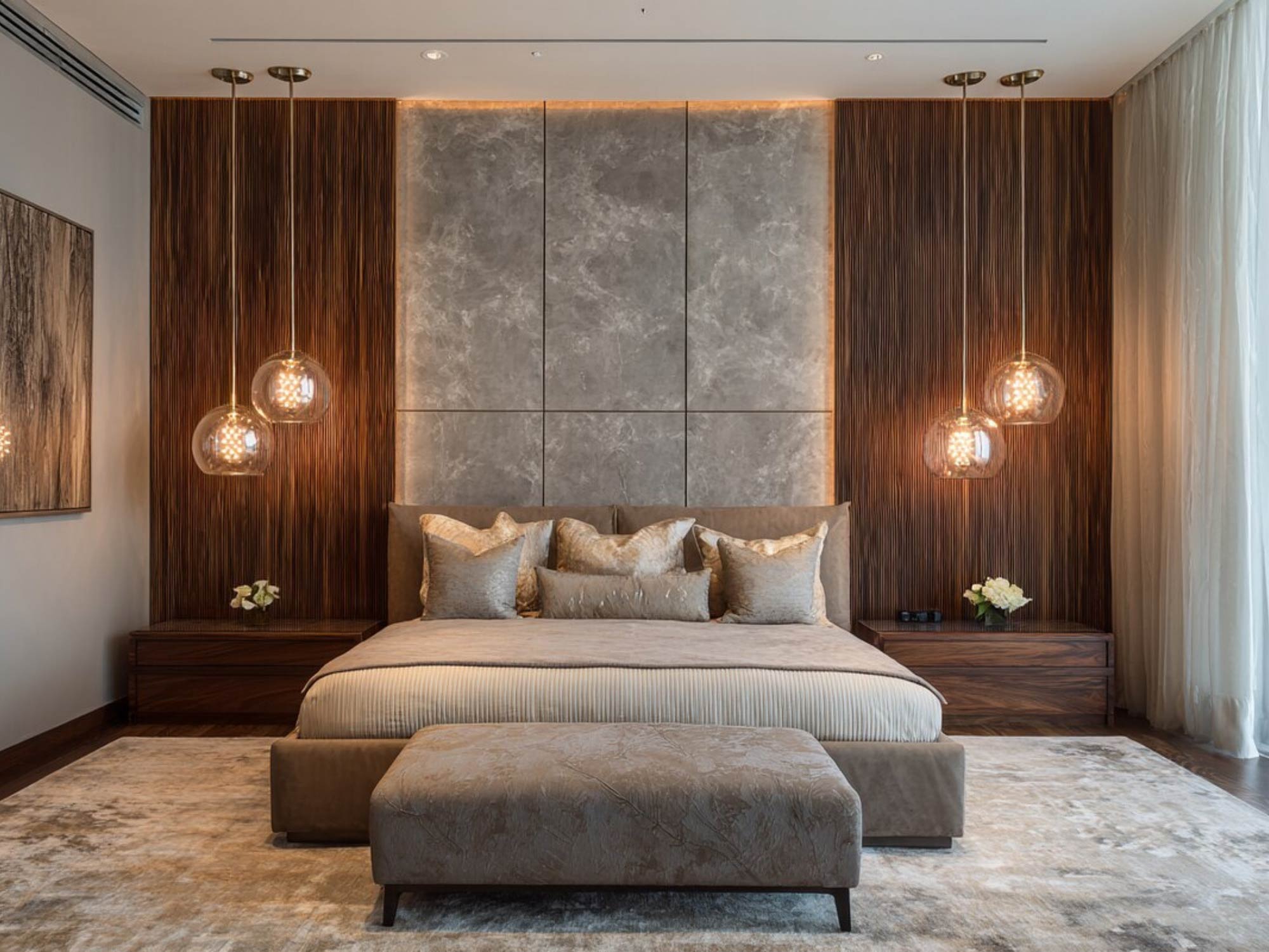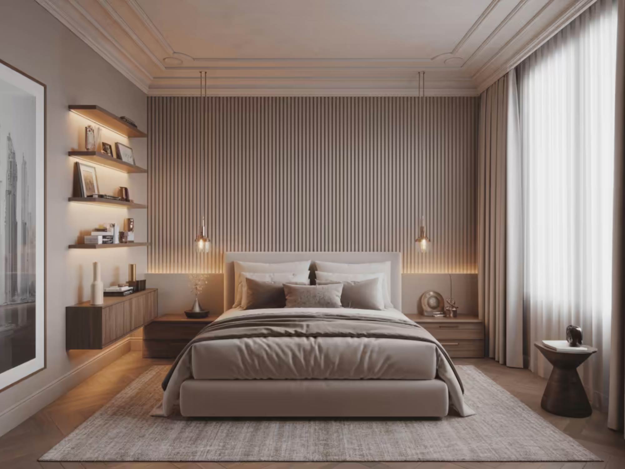 Trong phòng ngủ 20m2, việc xử lý các hạng mục như trần, tường, sàn cần sự tiết chế tối đa.