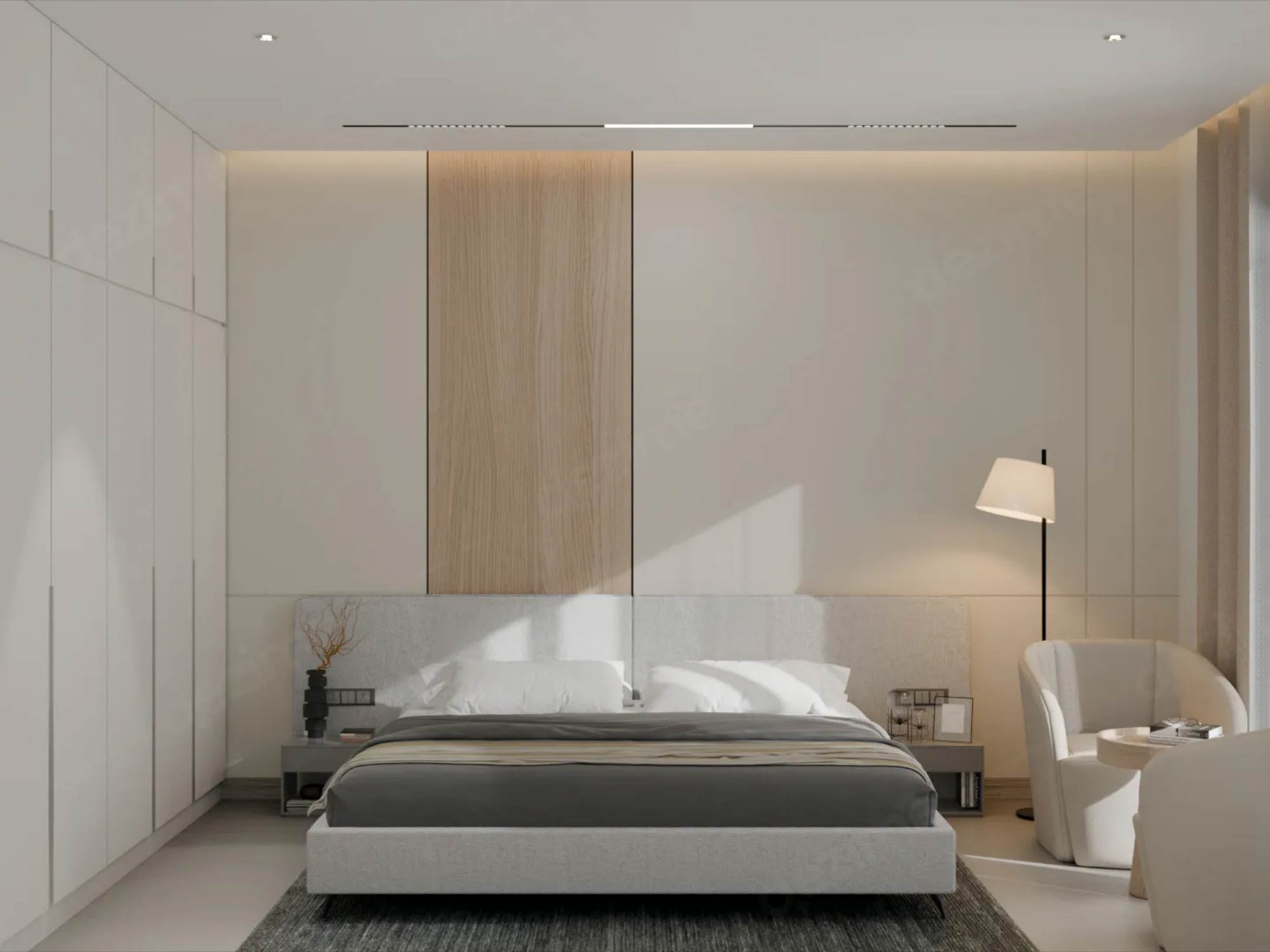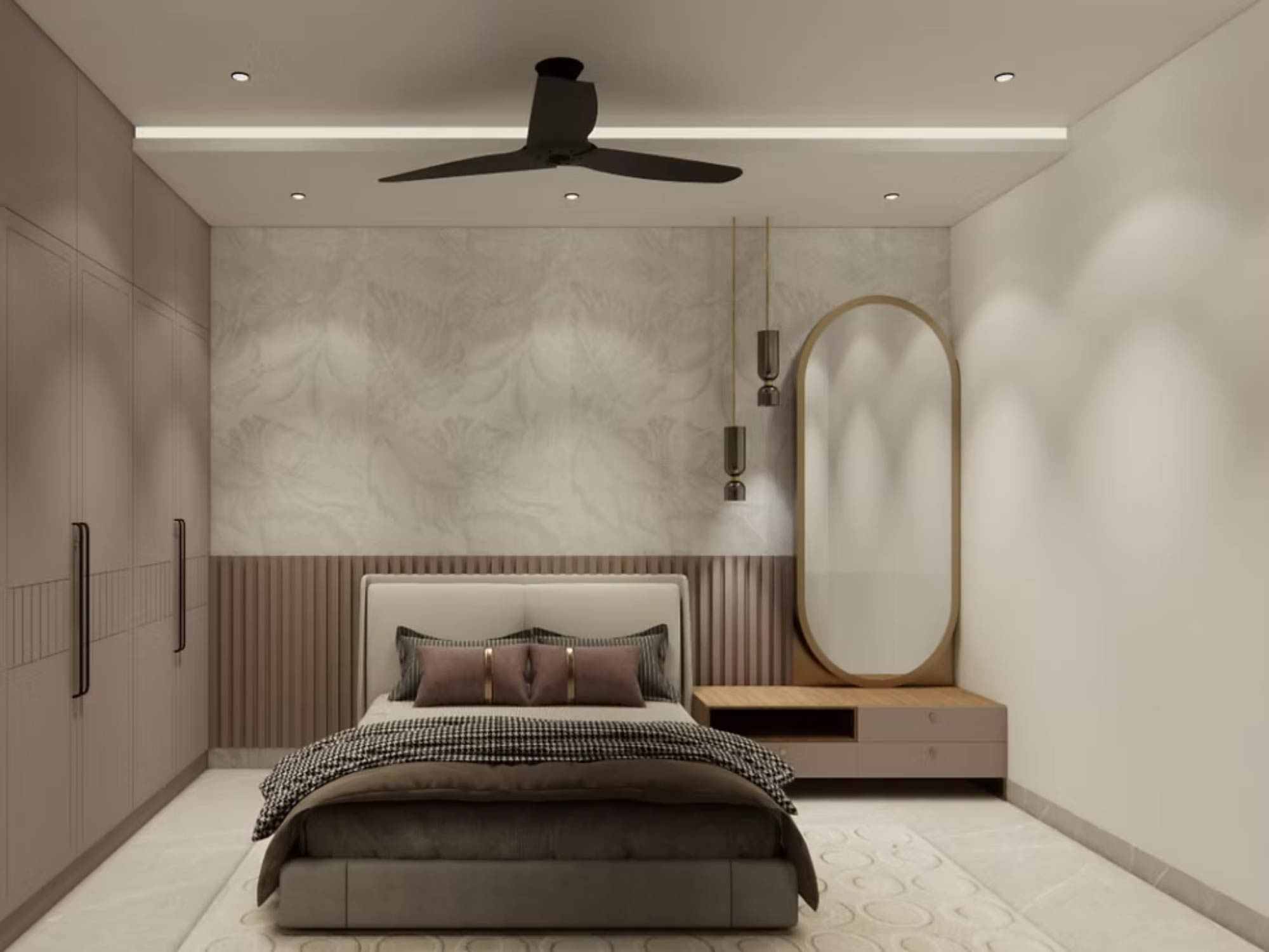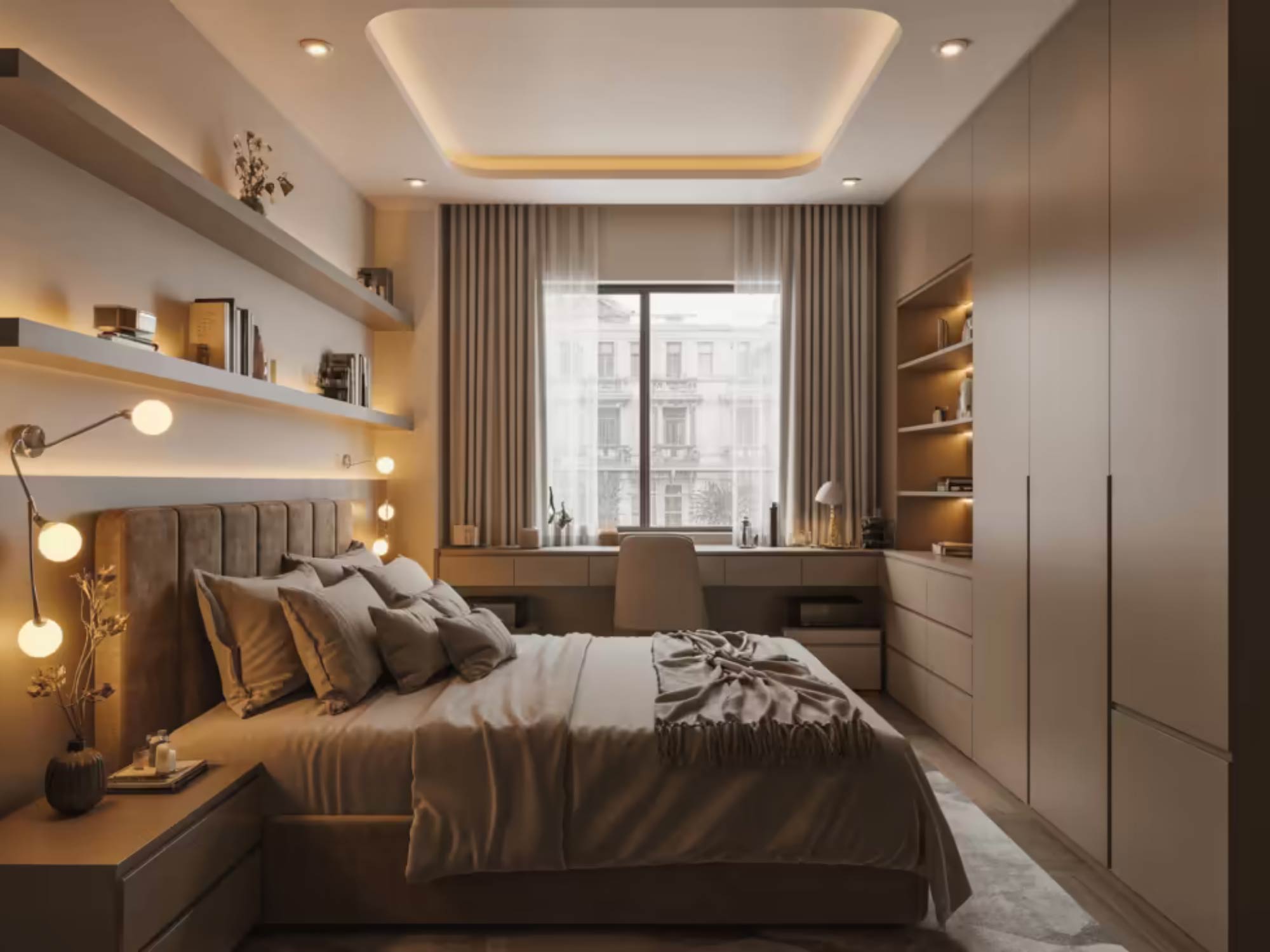 Giường ngủ thường được đặt lệch về một phía thay vì trung tâm, nhằm giải phóng lối đi. Khoảng cách tối thiểu giữa giường và tủ thường được giữ ở mức 600–800mm để đảm bảo sử dụng thoải mái. Nếu không gian hẹp, tủ sẽ chuyển sang dạng cánh lùa để tránh vướng khi mở.
