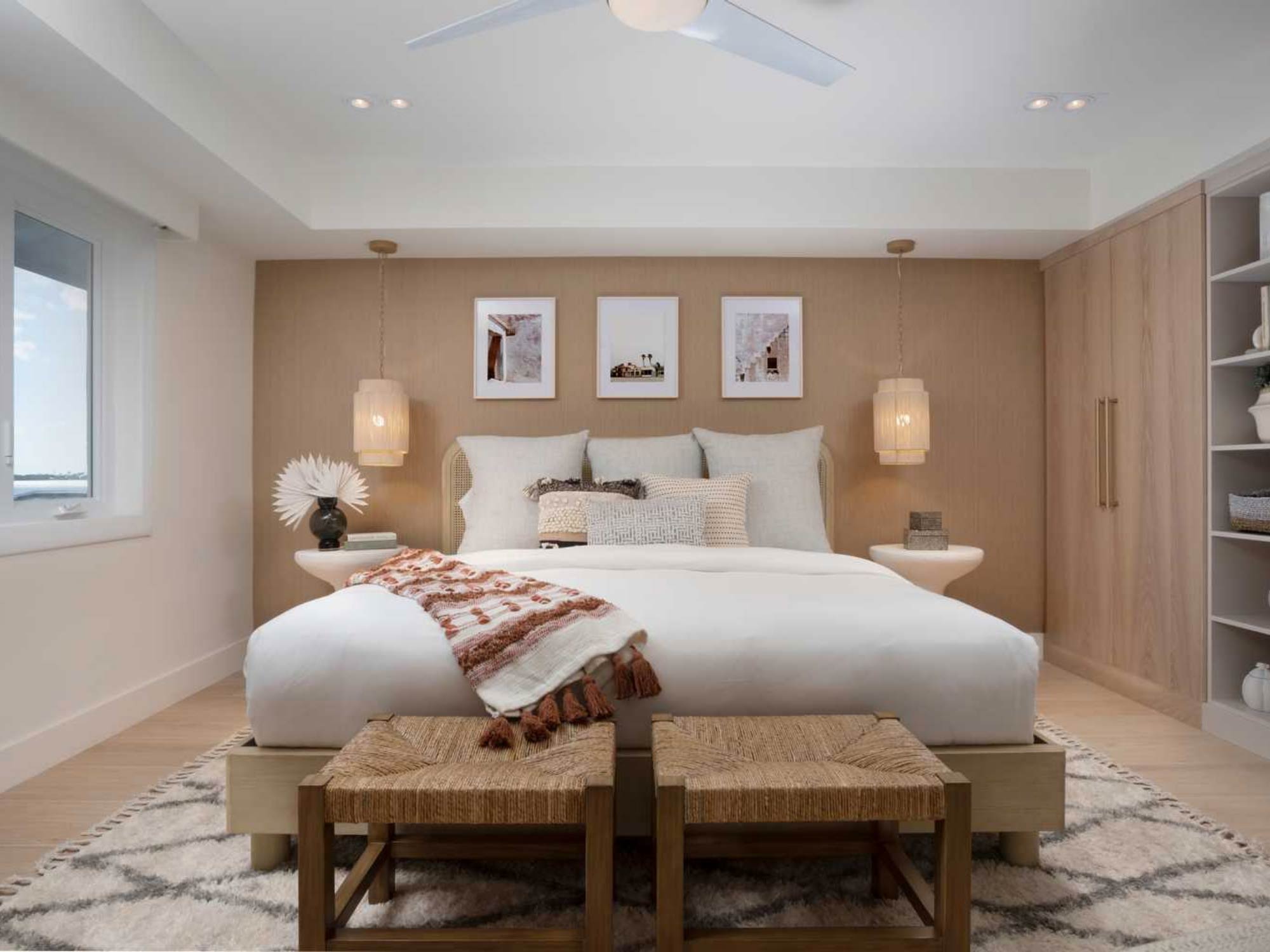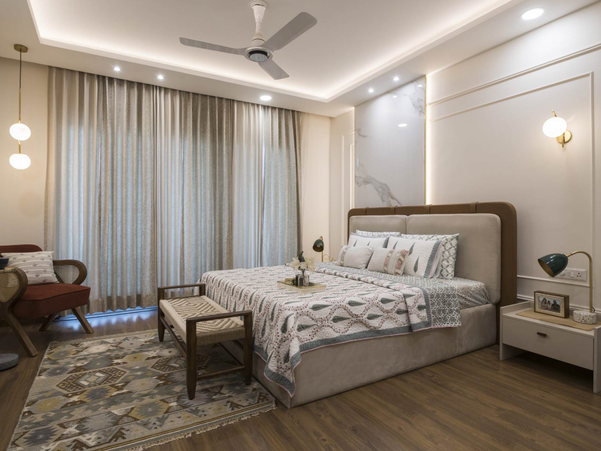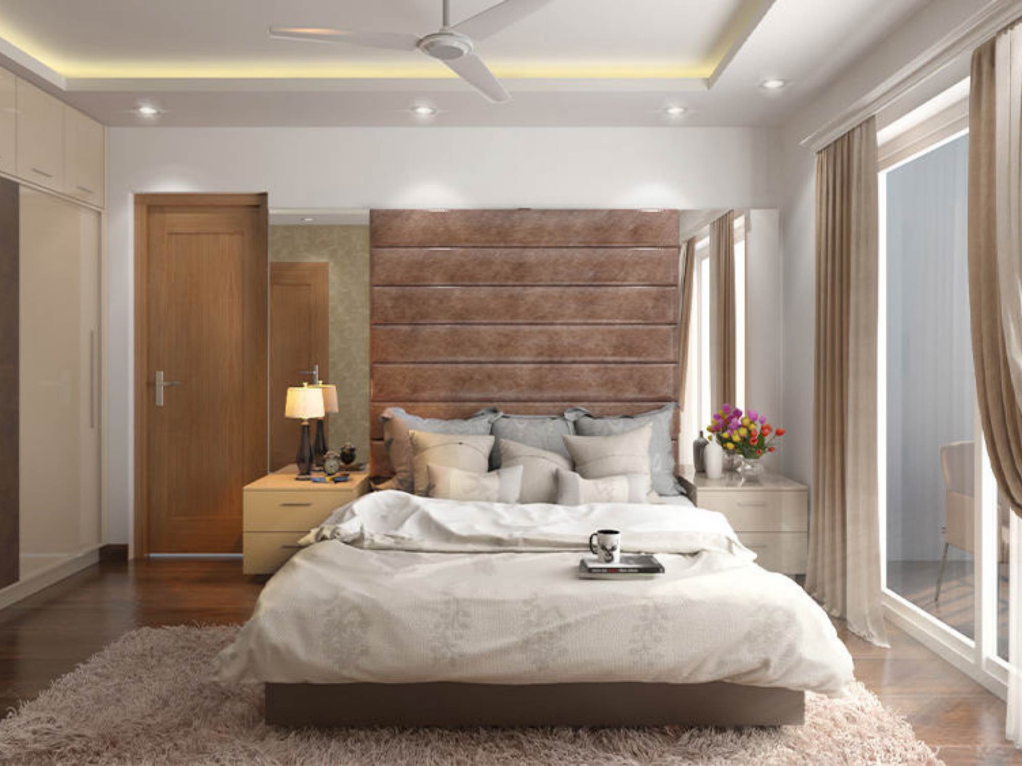 Giường ngủ thường được đặt lệch về một phía thay vì trung tâm, nhằm giải phóng lối đi. Khoảng cách tối thiểu giữa giường và tủ thường được giữ ở mức 600–800mm để đảm bảo sử dụng thoải mái. Nếu không gian hẹp, tủ sẽ chuyển sang dạng cánh lùa để tránh vướng khi mở.