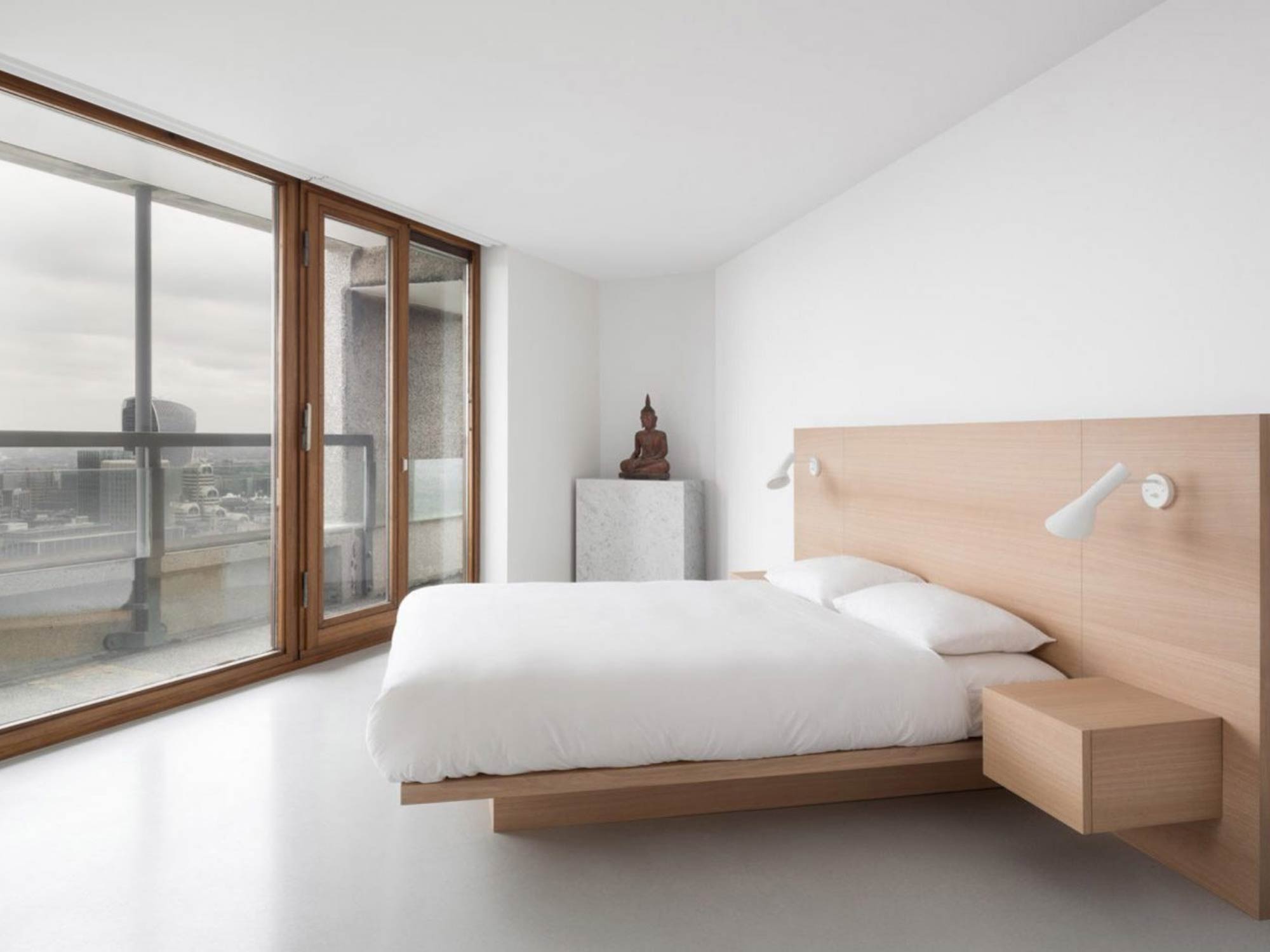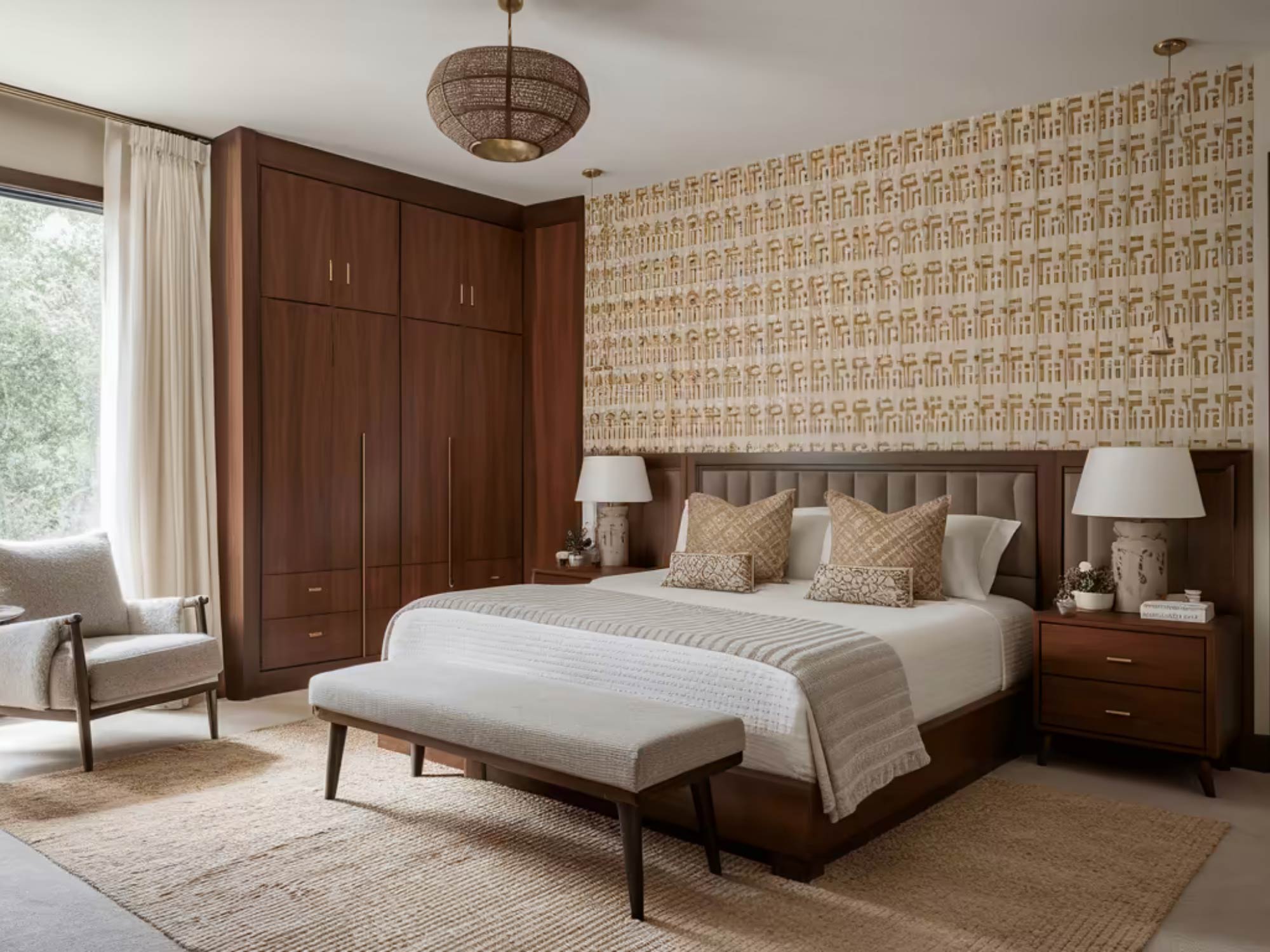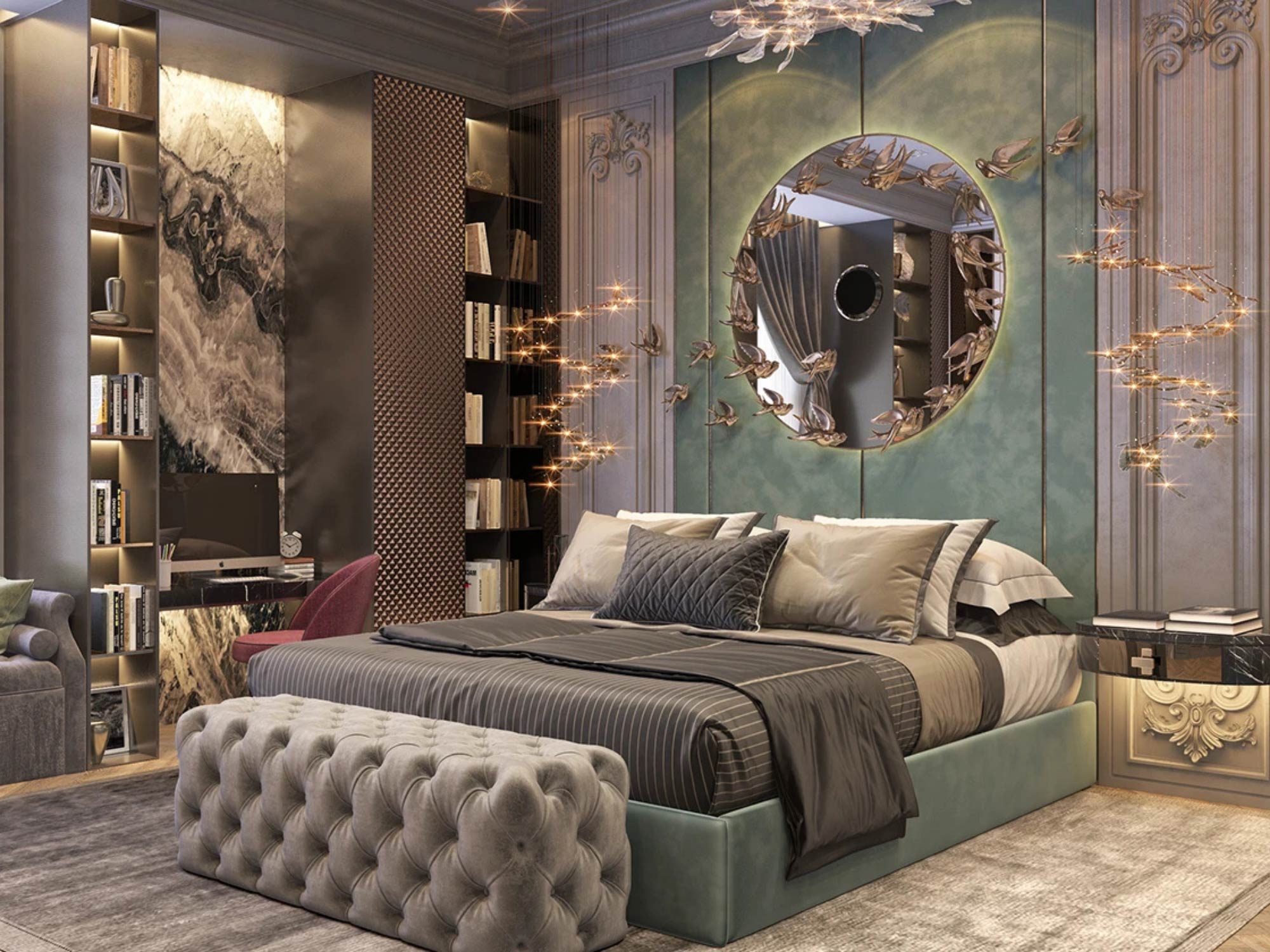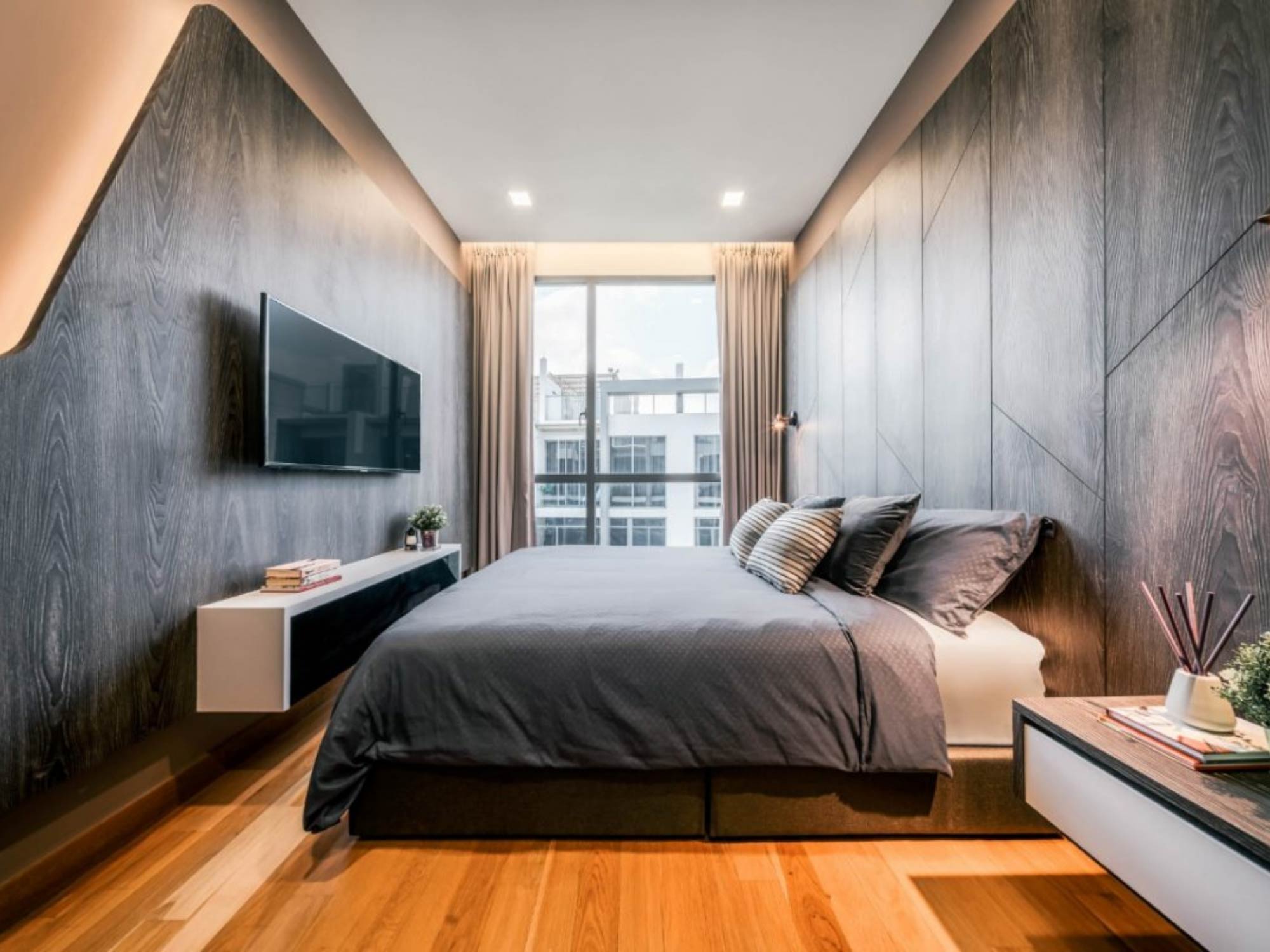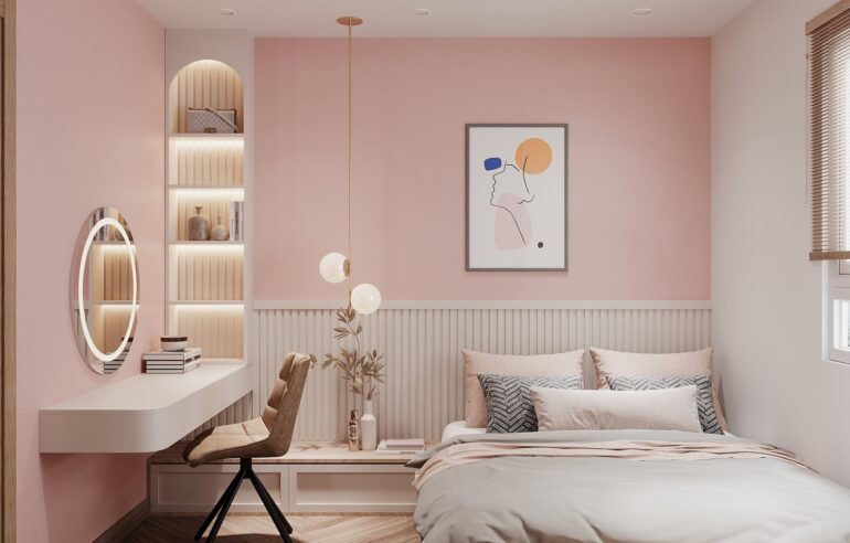 Khu vực giường ngủ luôn đóng vai trò trung tâm, được bố trí tại vị trí có tầm nhìn tốt, thường hướng về cửa sổ hoặc ban công để tận dụng ánh sáng tự nhiên. Phía sau đầu giường được xử lý như một điểm nhấn chính, có thể là mảng ốp gỗ, panel bọc nệm hoặc sơn hiệu ứng, vừa tạo chiều sâu vừa định hình phong cách.