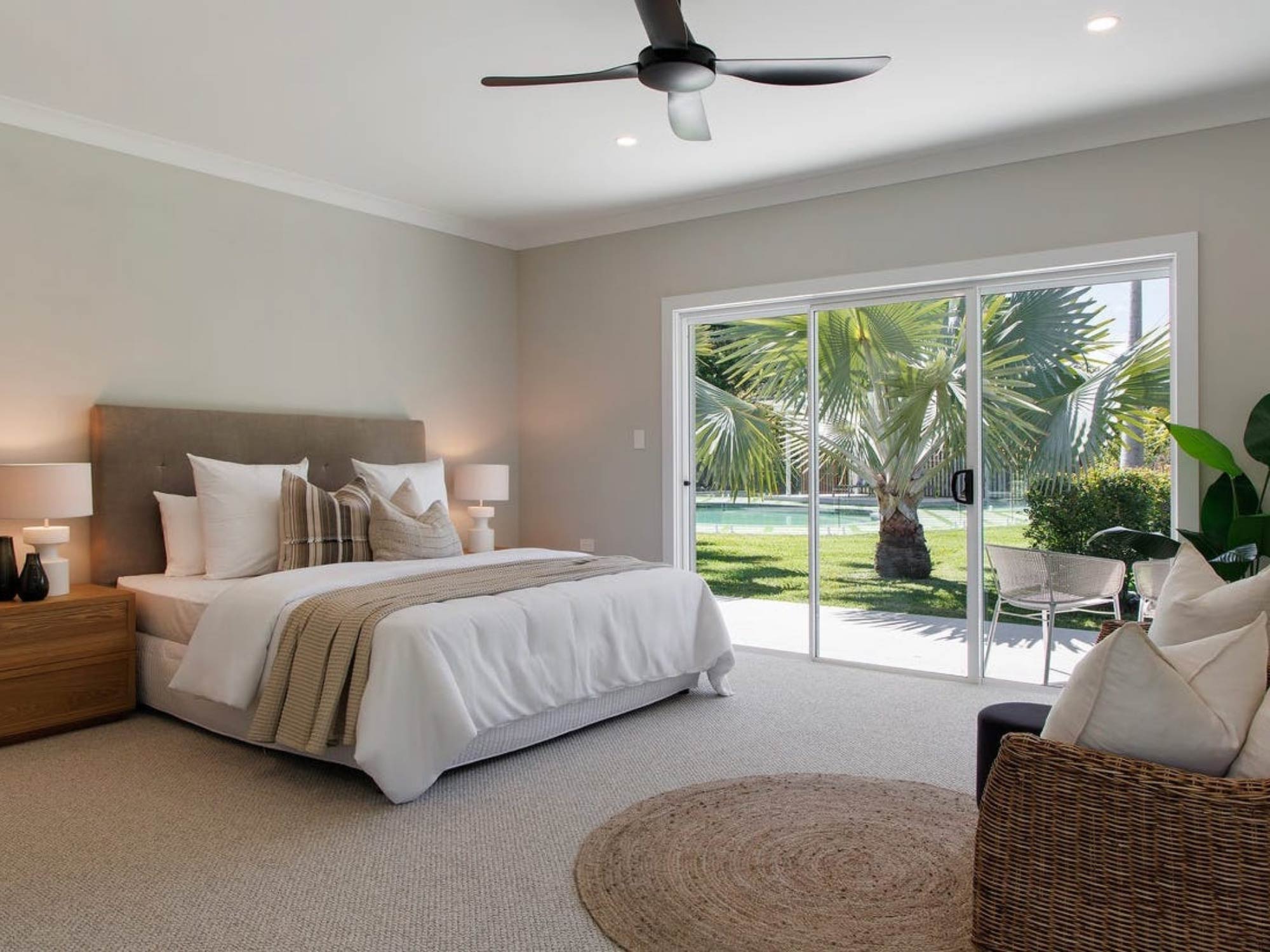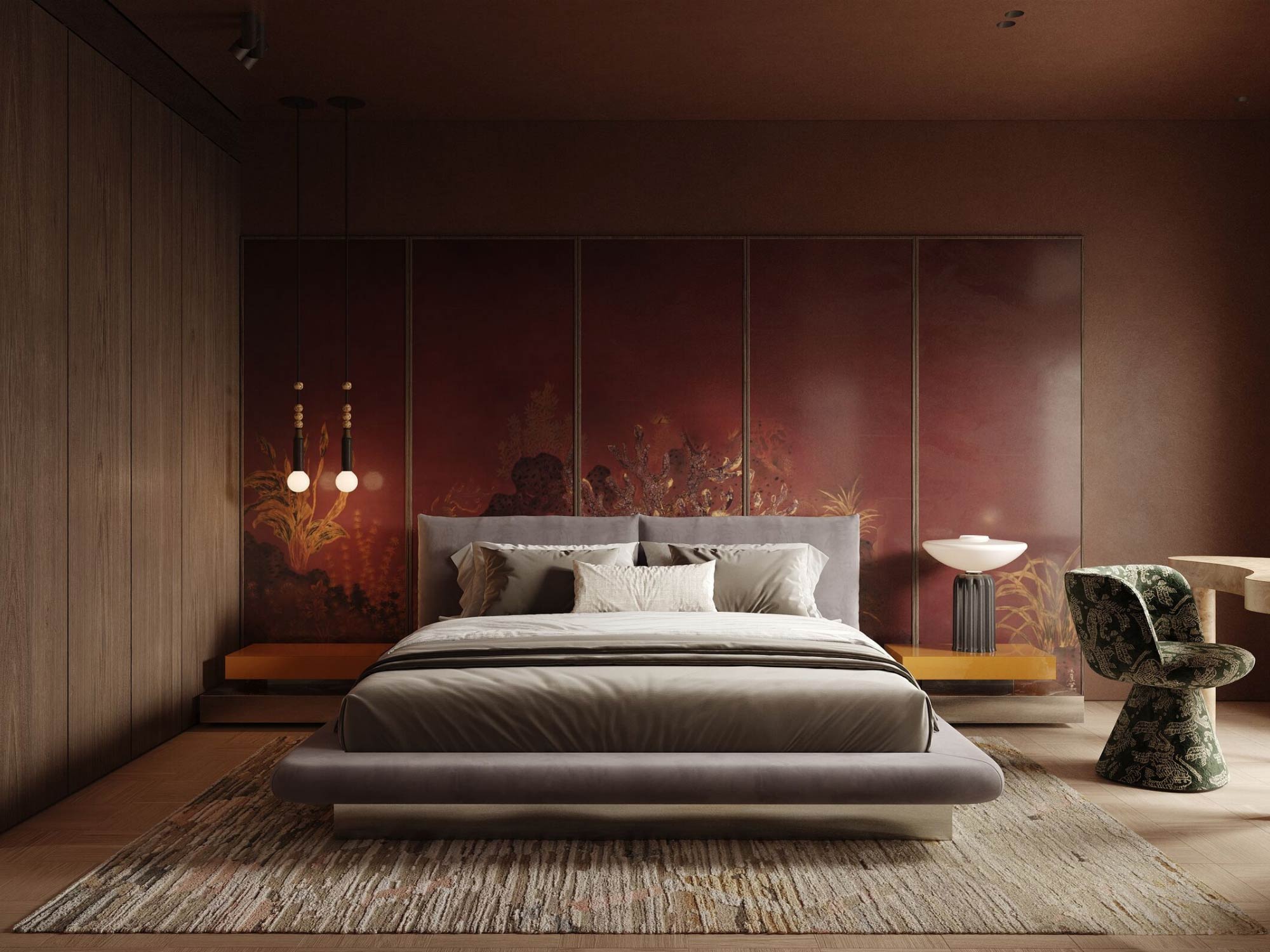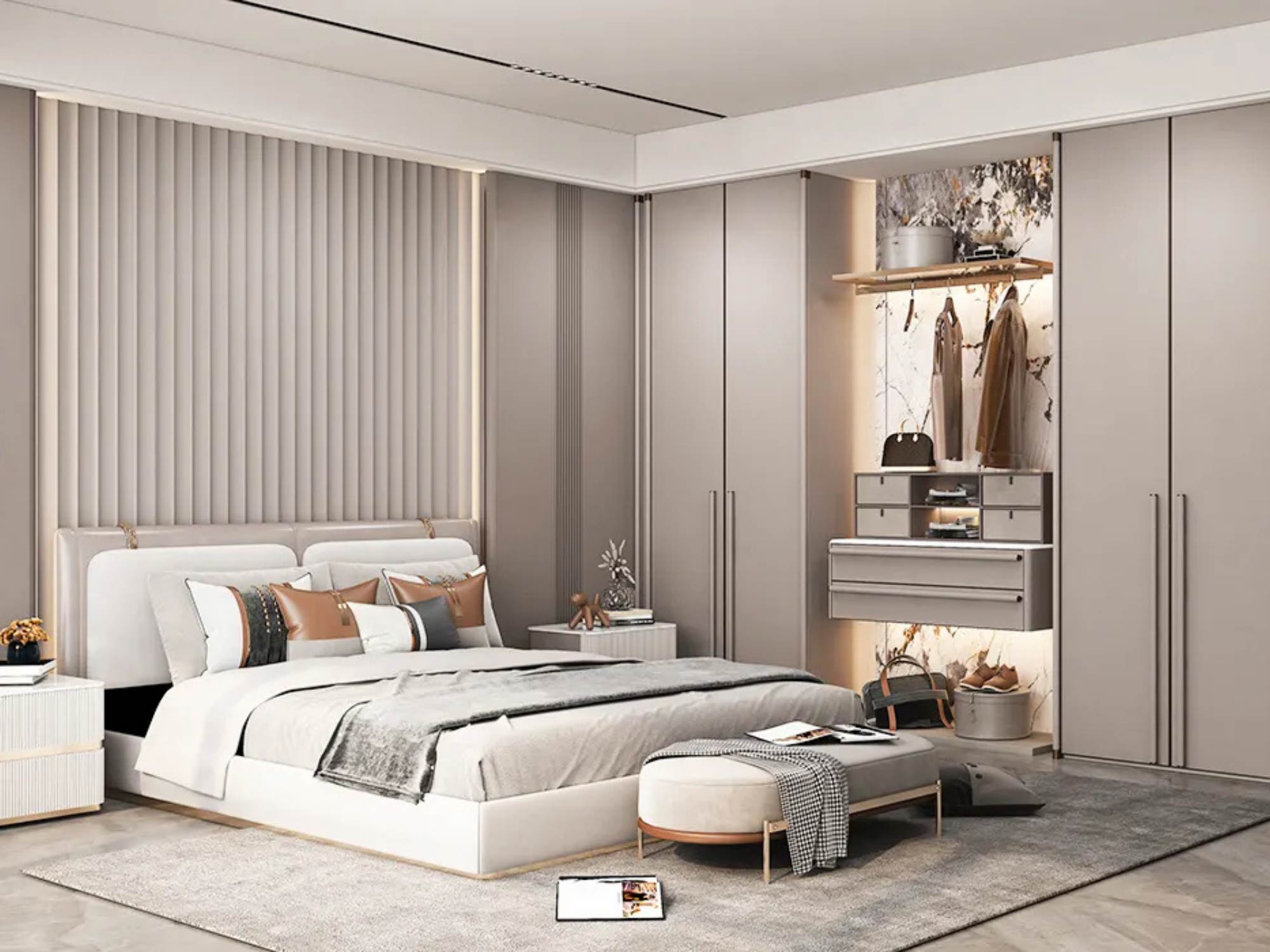 Giường ngủ thường được thiết kế dạng khối thấp, tạo cảm giác vững chắc và dễ chịu. Một số phương án tích hợp thêm hộc chứa đồ bên dưới hoặc hệ tab đầu giường liền khối nhằm tăng tính tiện dụng. Tủ quần áo được thiết kế kịch trần để tối đa hóa lưu trữ, đồng thời sử dụng cánh phẳng, hạn chế tay nắm để giữ sự gọn gàng thị giác.