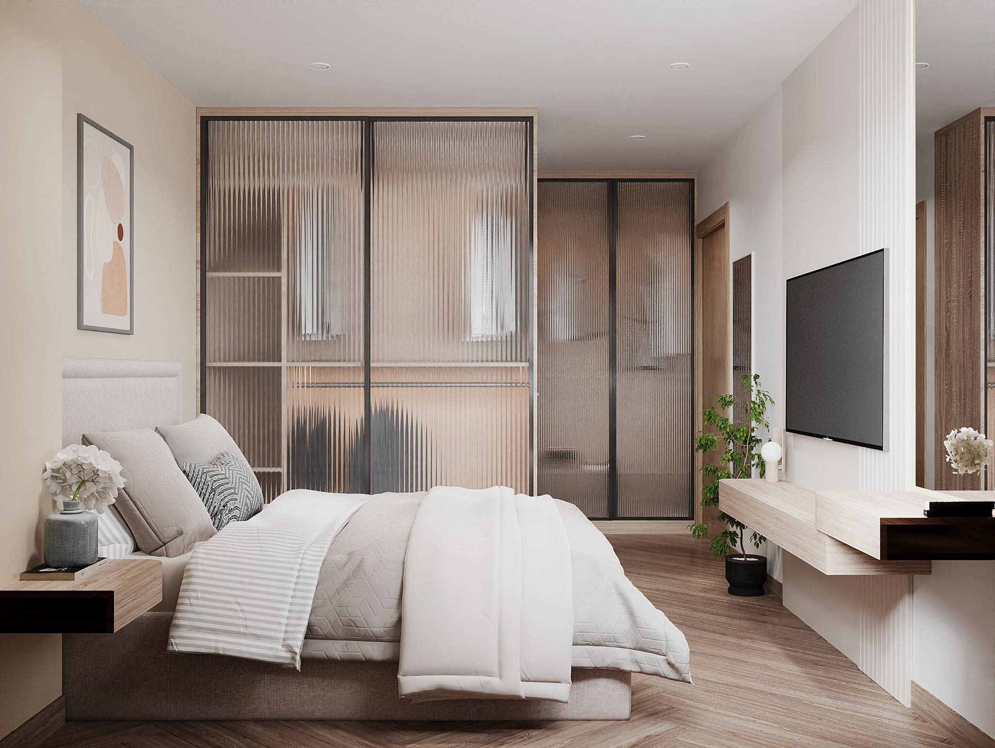 Một phòng ngủ master đẹp không nằm ở việc đặt nhiều nội thất, mà ở cách tiết chế hợp lý để tạo nên sự nhẹ nhàng, gọn gàng và thư thái trong từng chuyển động.