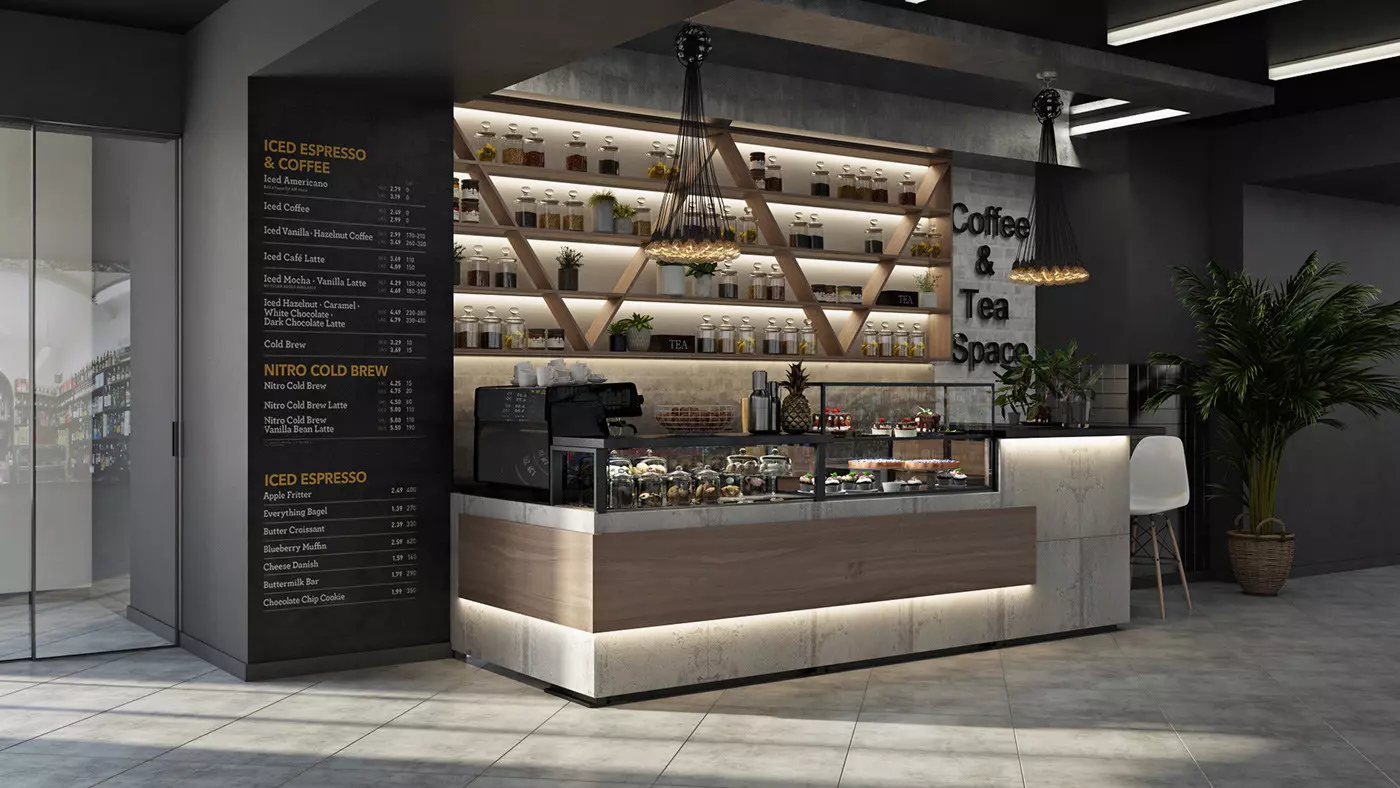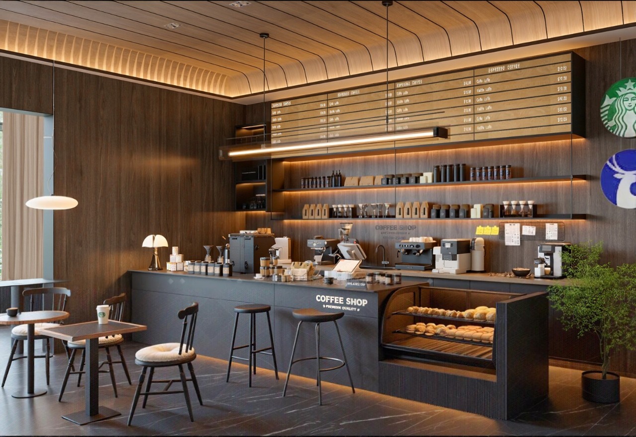 Bên cạnh đó, việc kết hợp ánh sáng trang trí, vật liệu gỗ, kim loại và kính giúp không gian trở nên ấm cúng nhưng vẫn hiện đại. Những thiết kế quầy bar tích hợp kệ trưng bày, bảng menu và hệ thống máy móc gọn gàng cũng đang được ưa chuộng nhờ khả năng tối ưu diện tích.