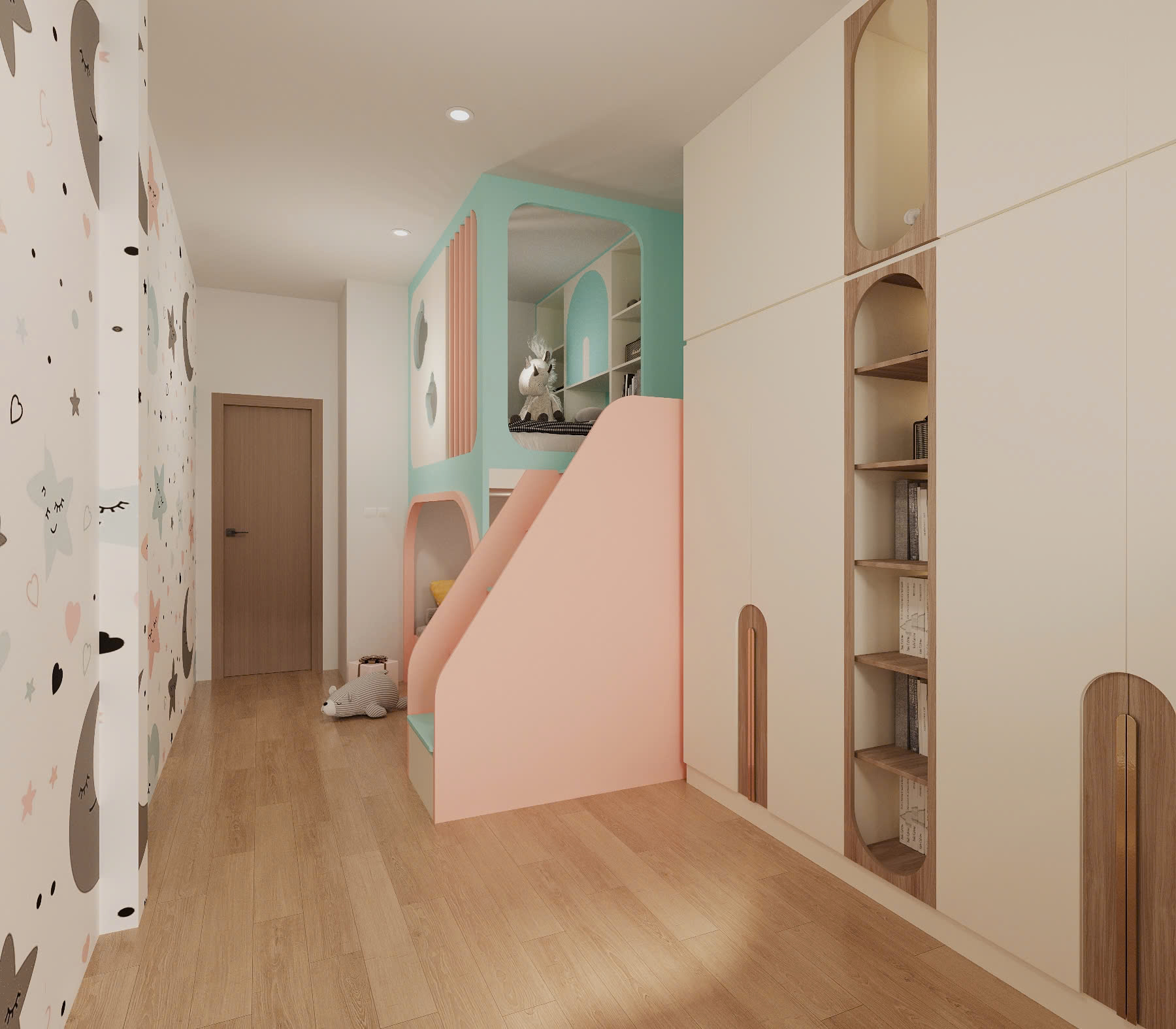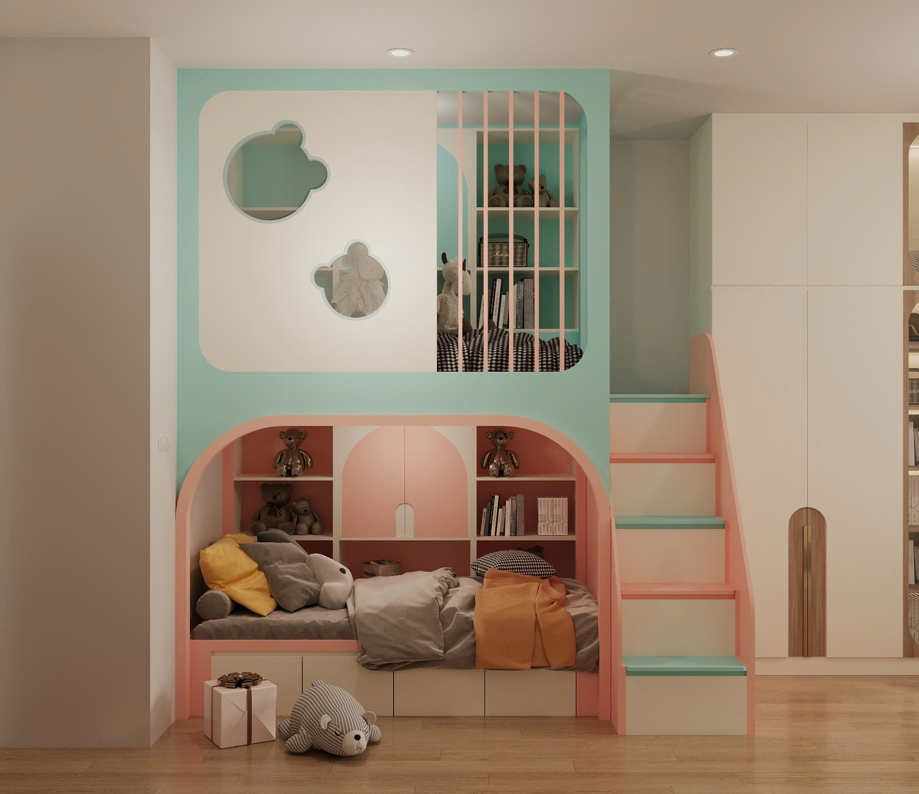 Tận dụng các khoảng trống như gầm cầu thang, góc tường, trần cao để tích hợp tủ, kệ âm tường.